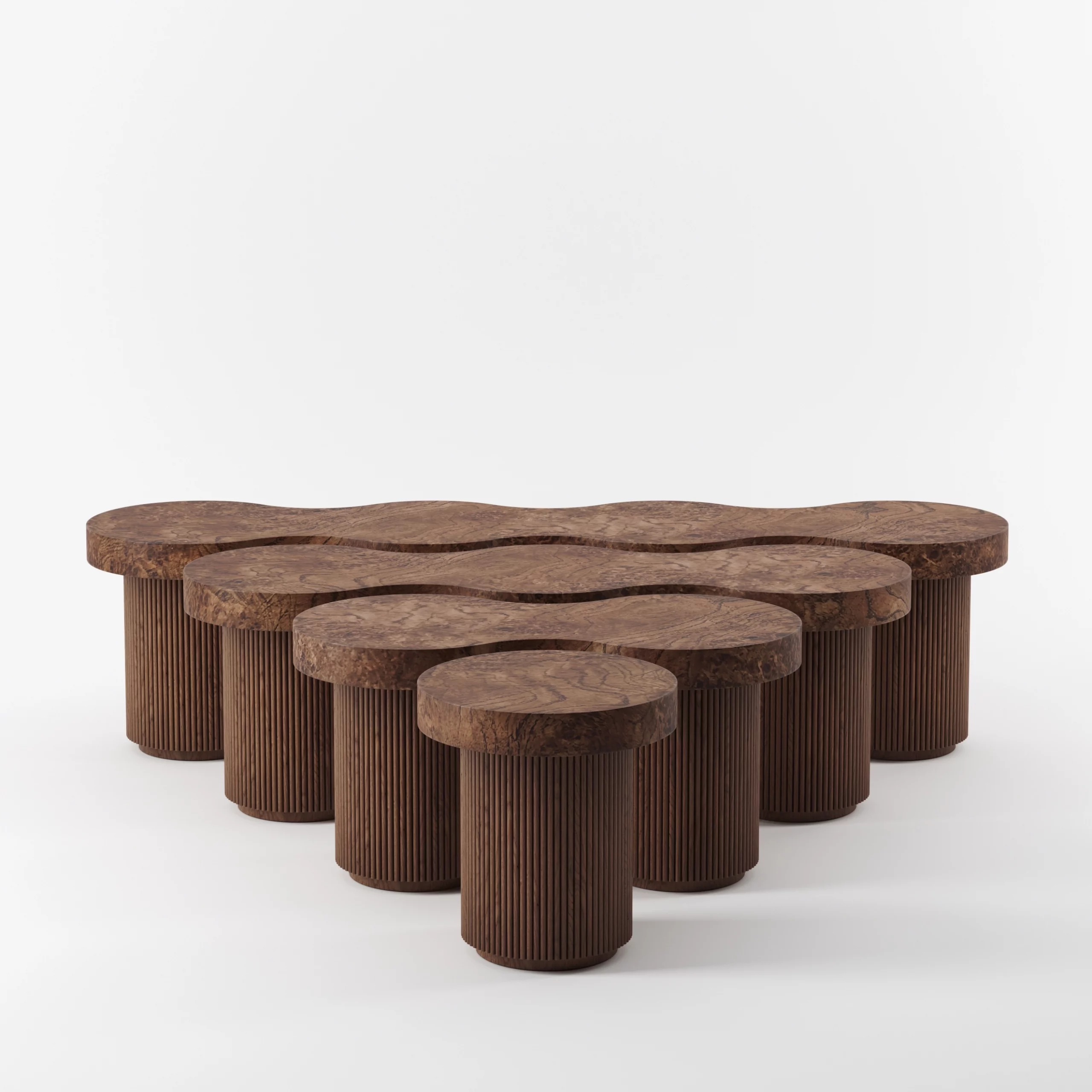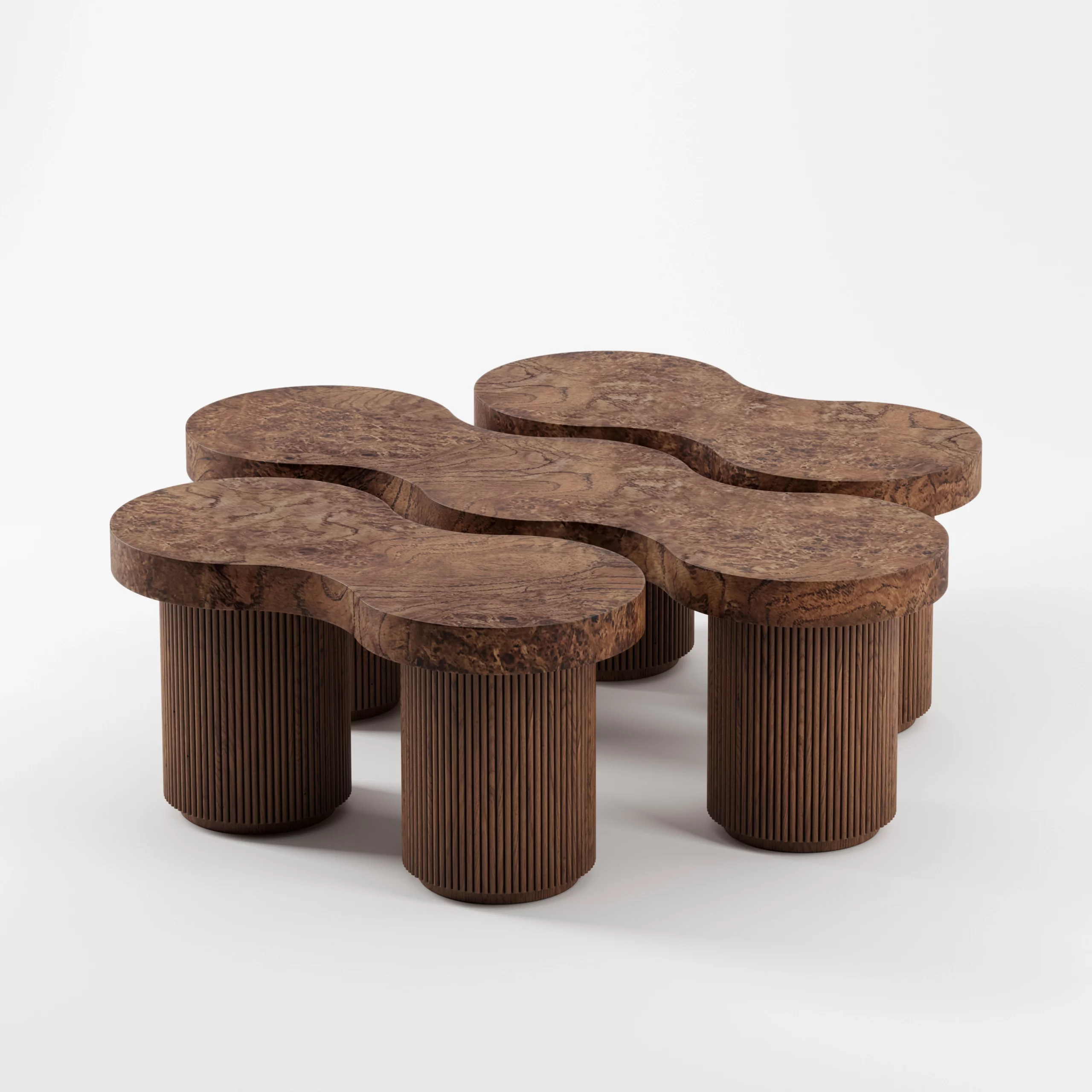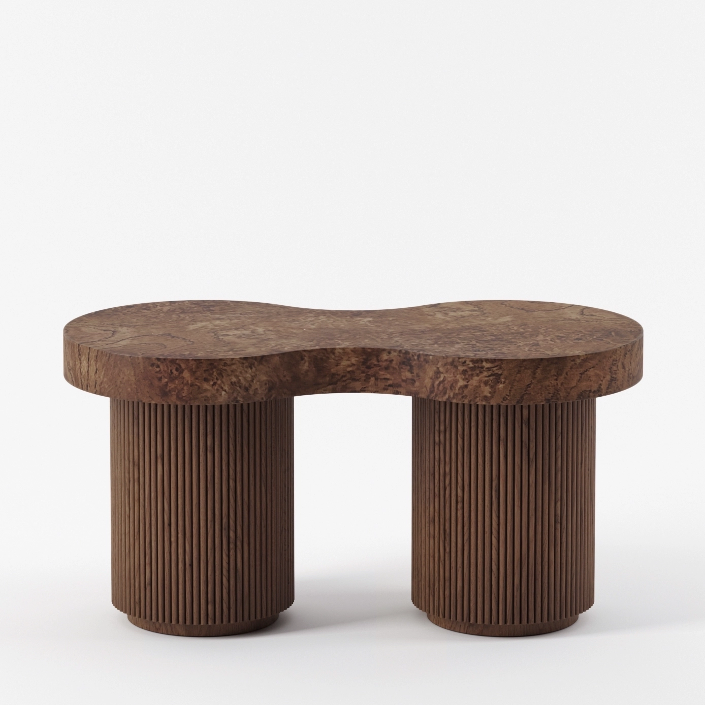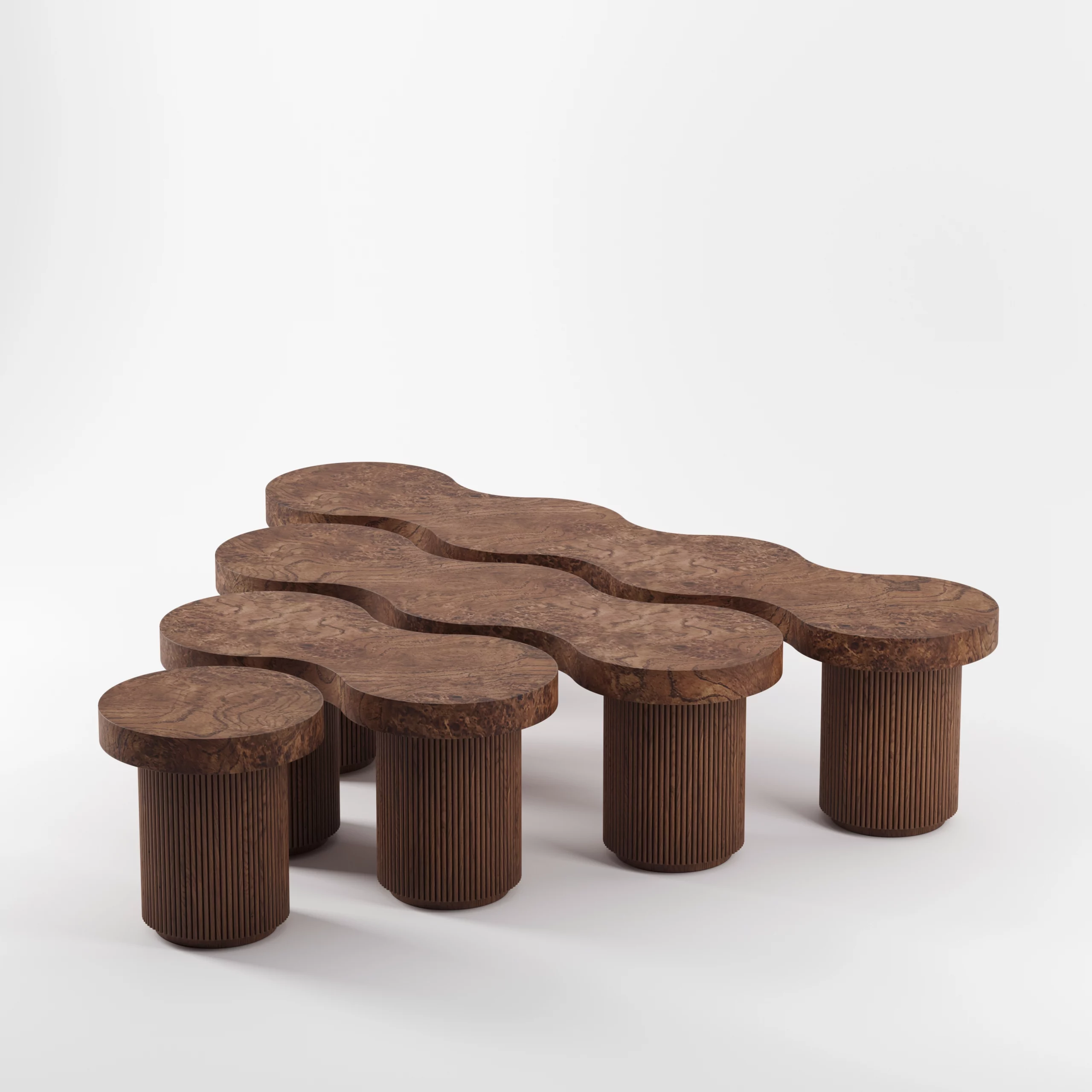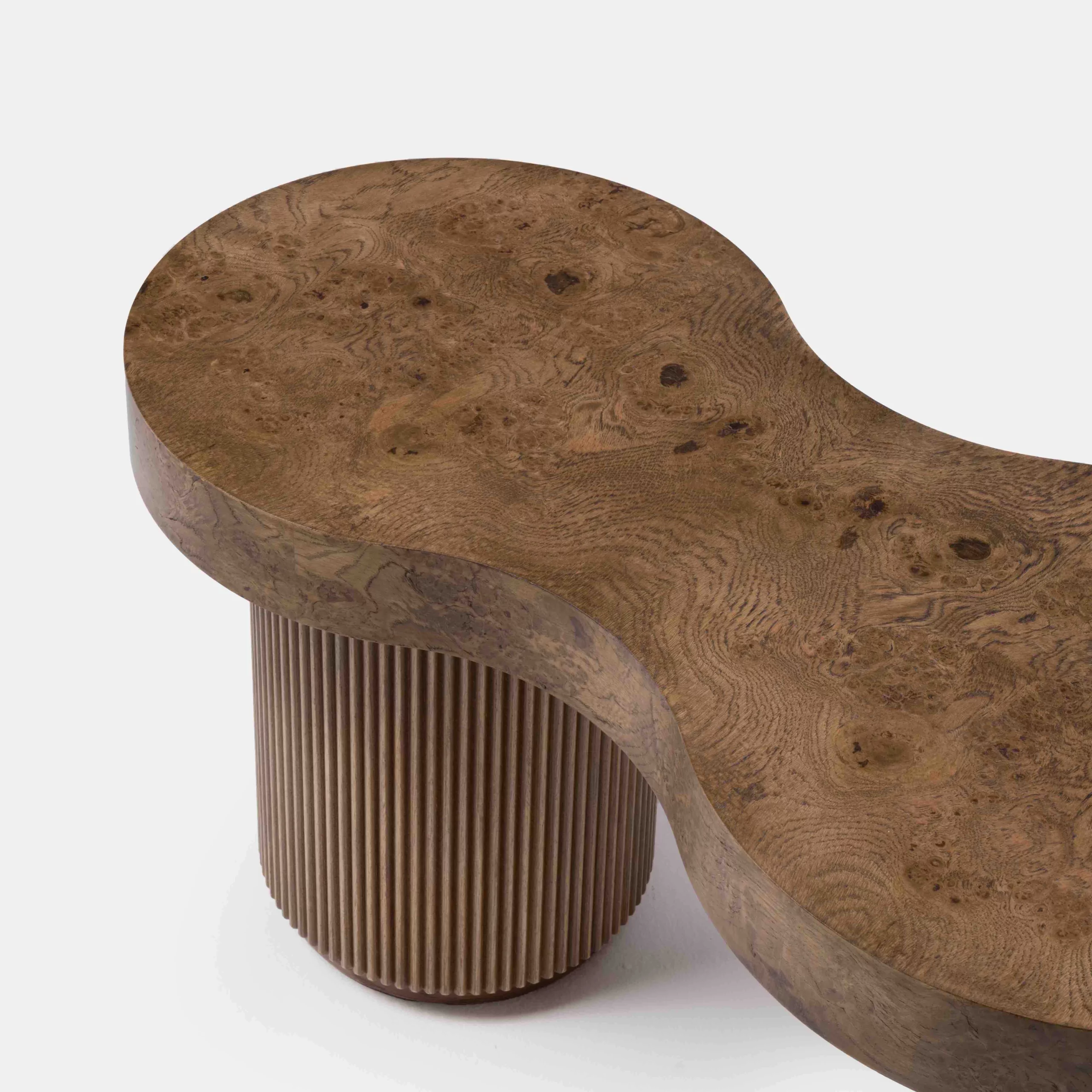 The ARY collection challenges with its free forms and artisanal virtuosity. The undulations formed by the fluted wood create a fluid rhythm and give the furniture all its rarity and uniqueness. The oak burl that adorns the tops, reveals imaginary and unique landscapes, and enlivens table, bench or sideboard.