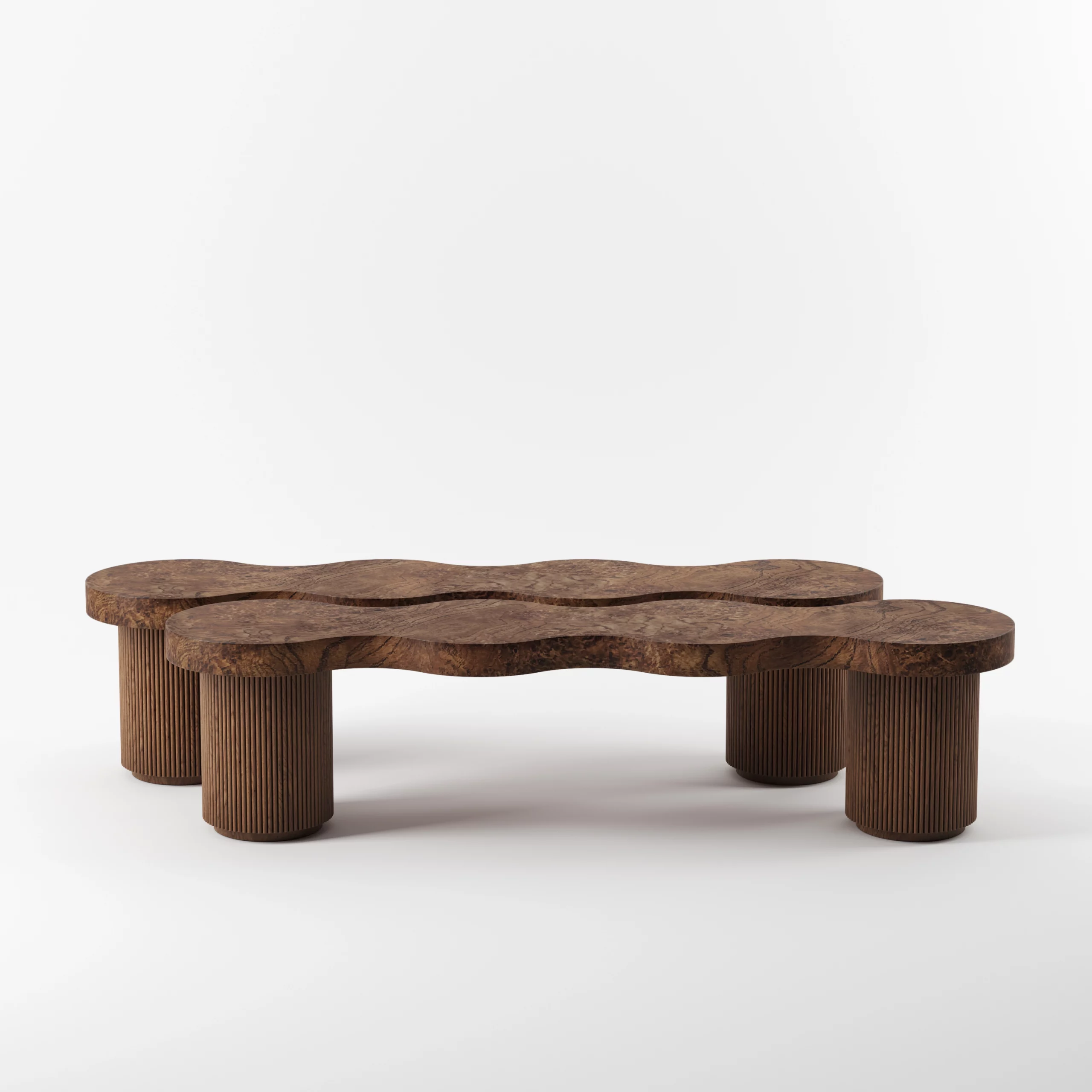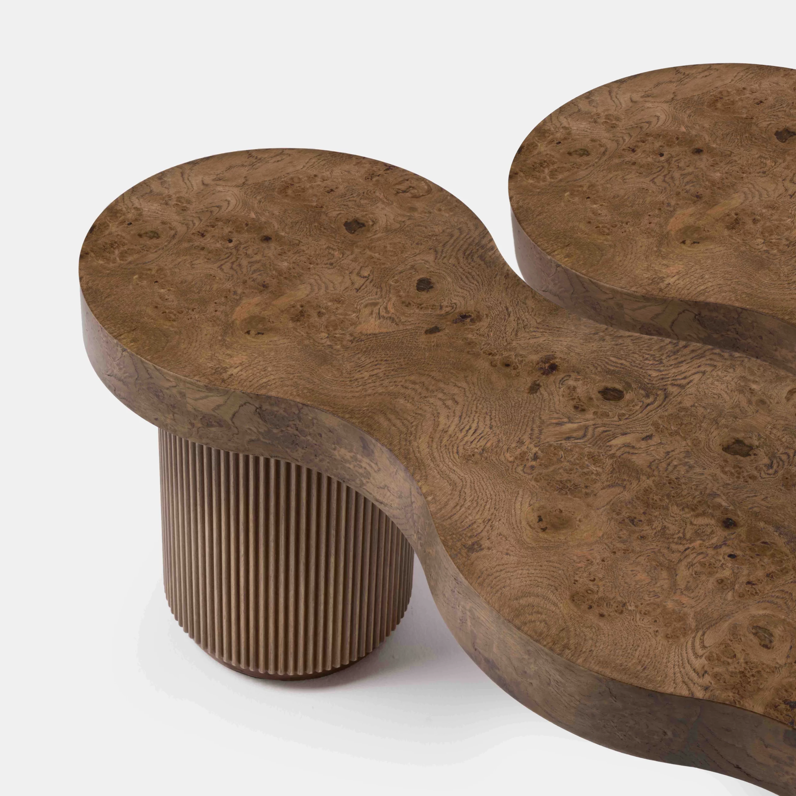The ARY collection challenges with its free forms and artisanal virtuosity. The undulations formed by the fluted wood create a fluid rhythm and give the furniture all its rarity and uniqueness. The oak burl that adorns the tops, reveals imaginary and unique landscapes, and enlivens table, bench or sideboard.