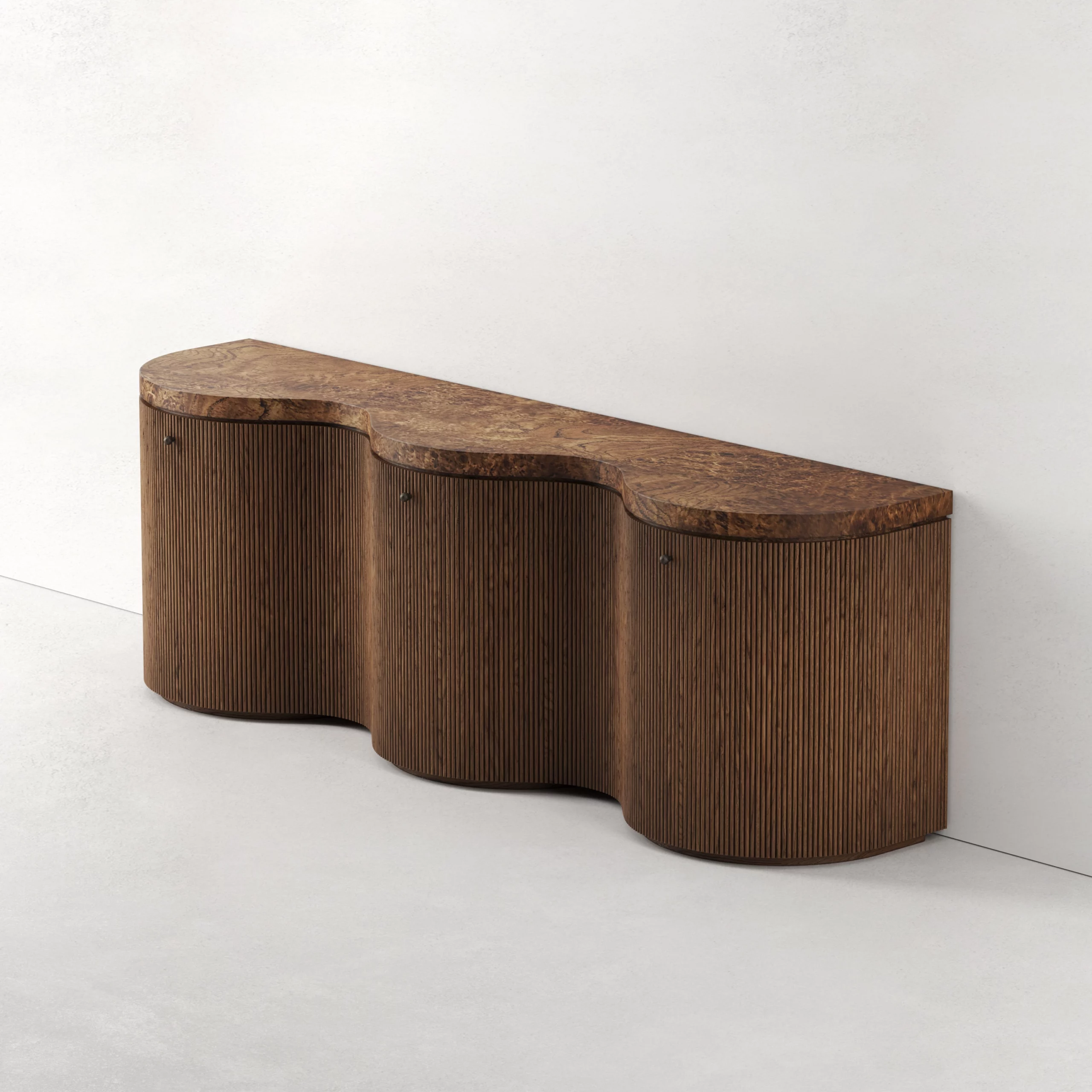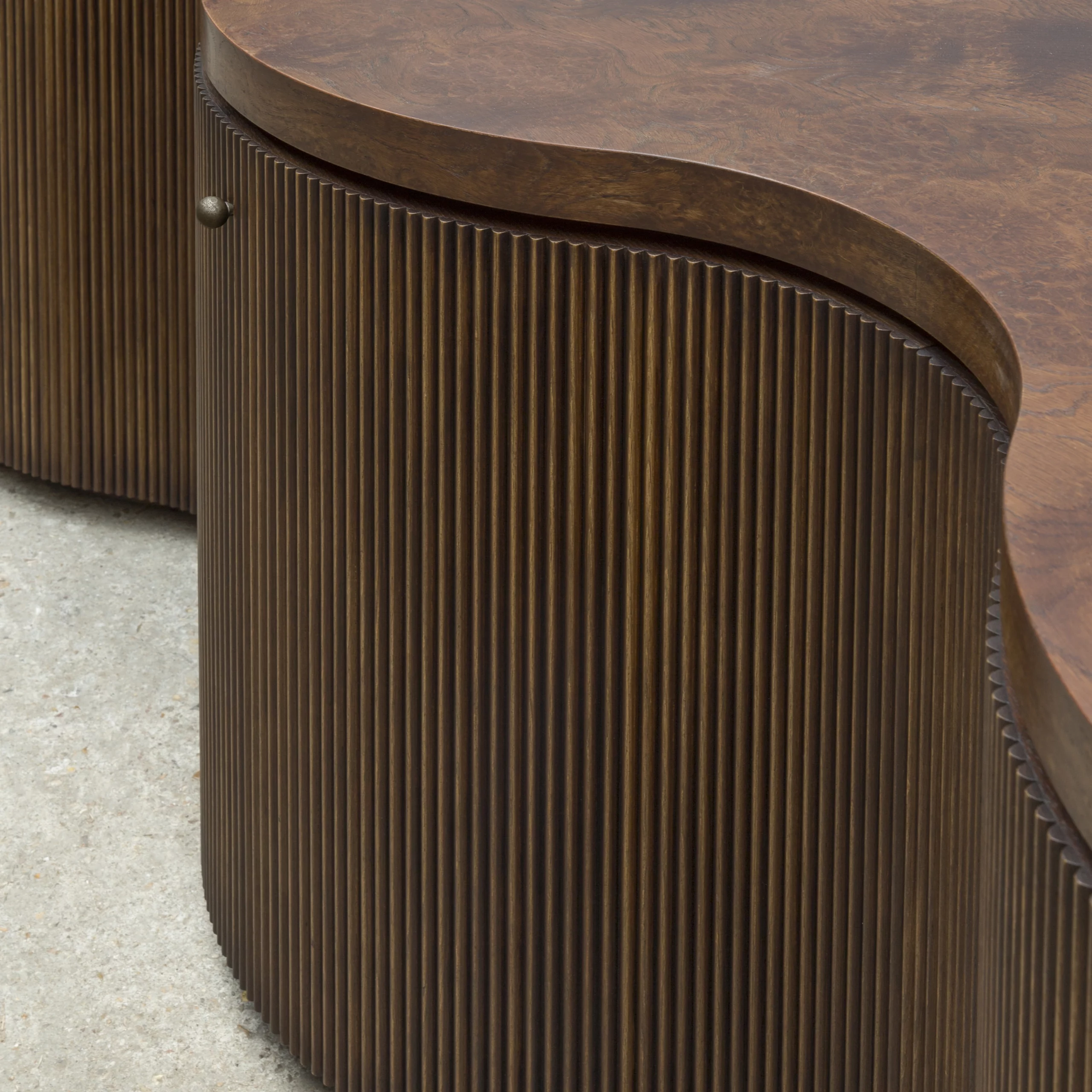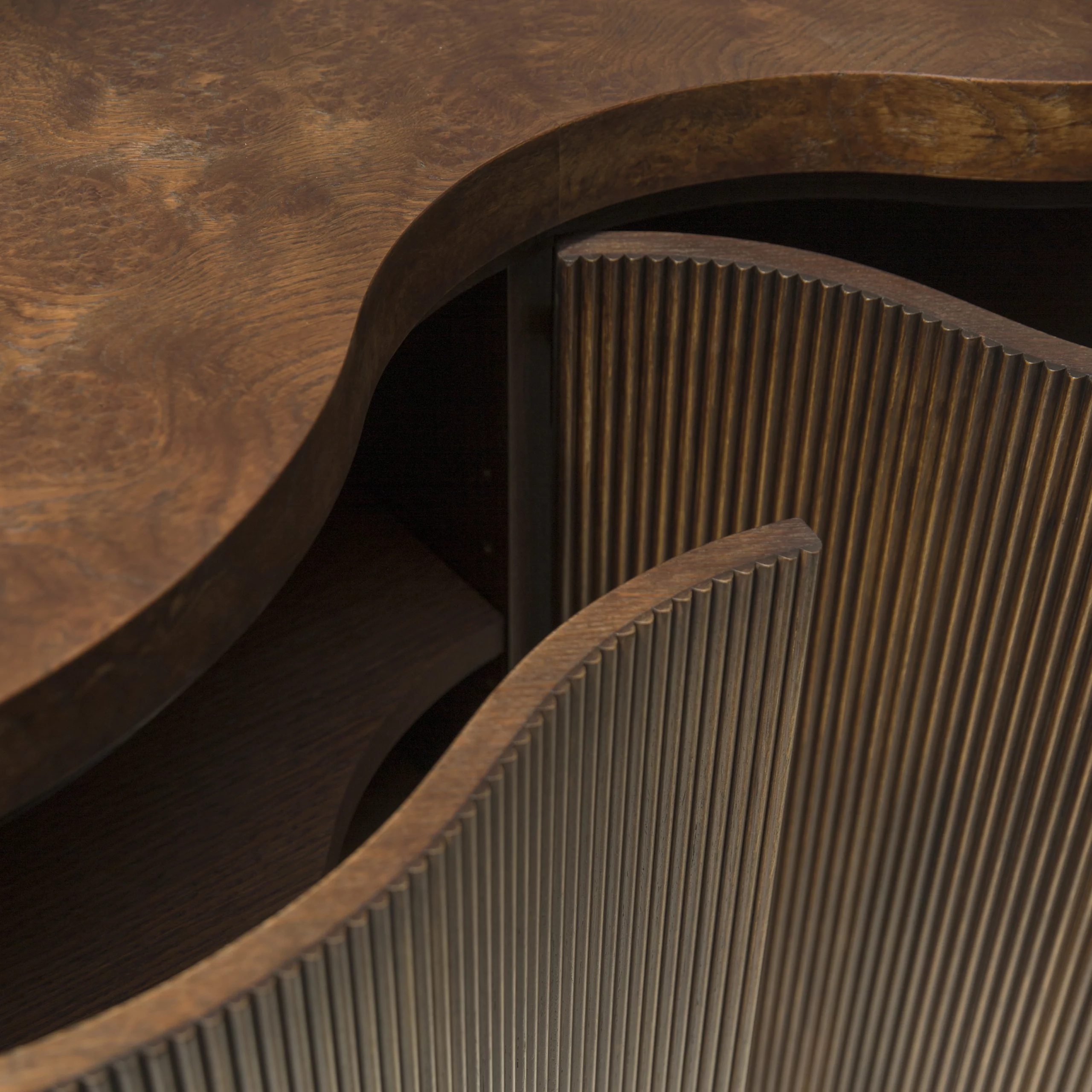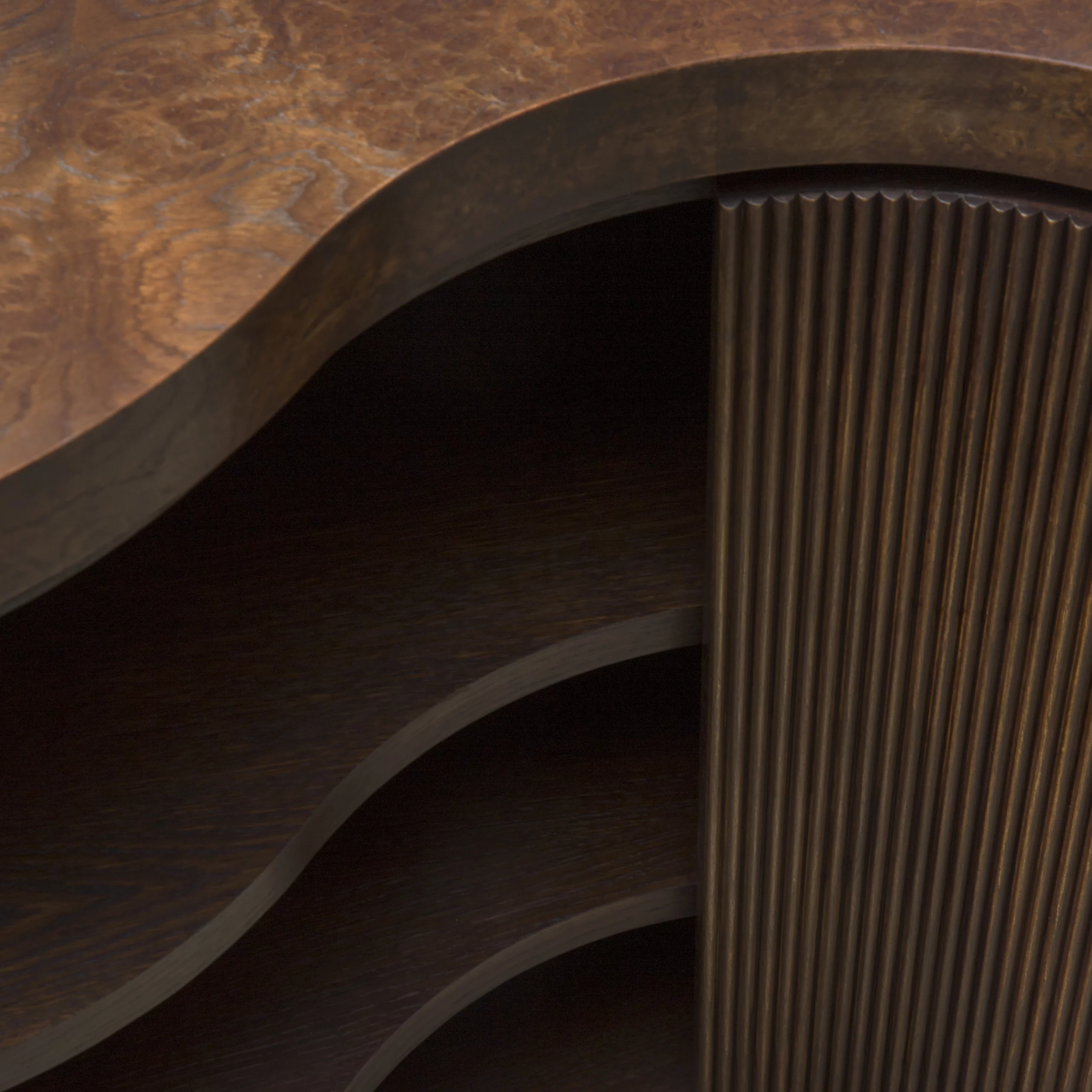 The ARY collection challenges with its free forms and artisanal virtuosity. The undulations formed by the fluted wood create a fluid rhythm and give the furniture all its rarity and uniqueness. The oak burl that adorns the tops, reveals imaginary and unique landscapes, and enlivens table, bench or sideboard.