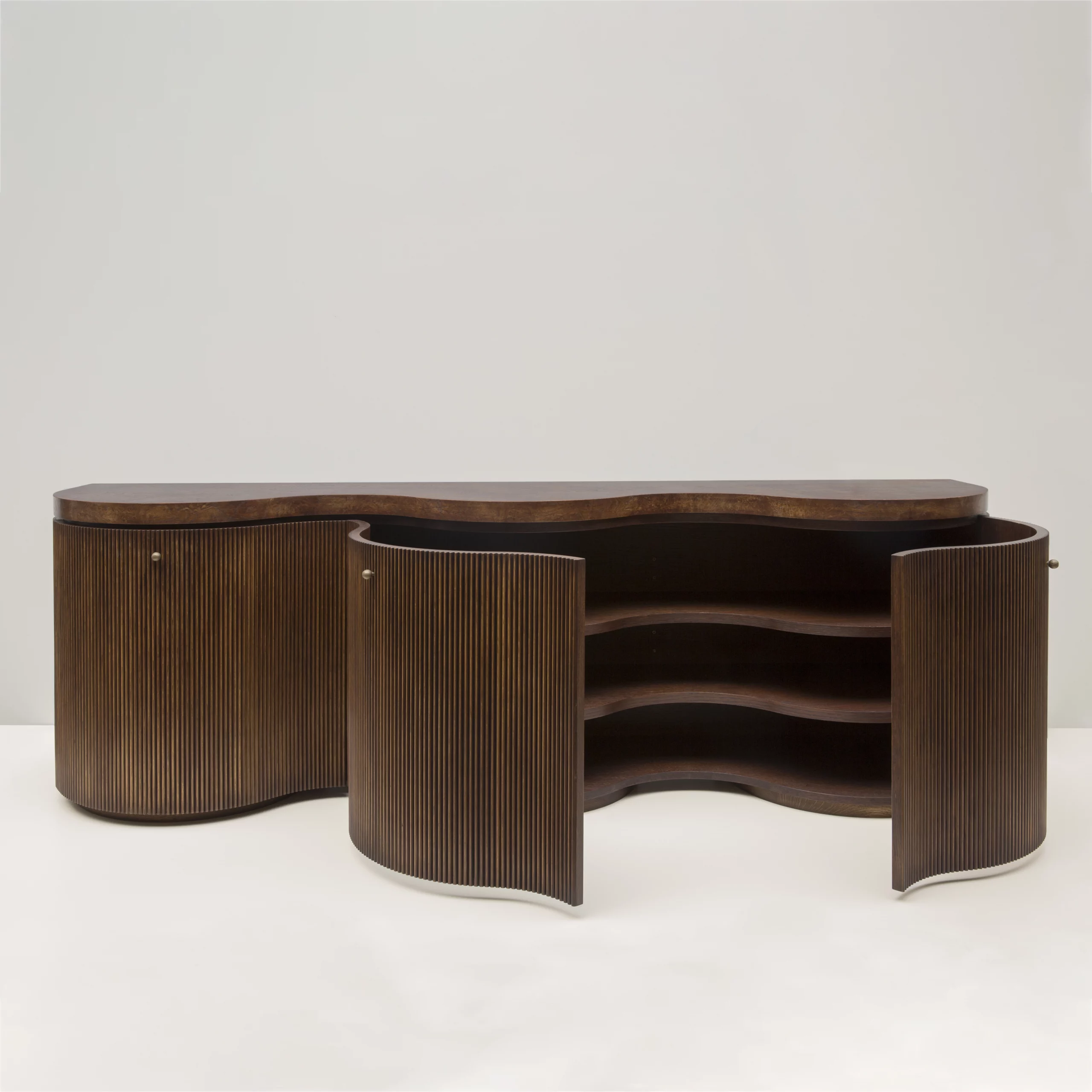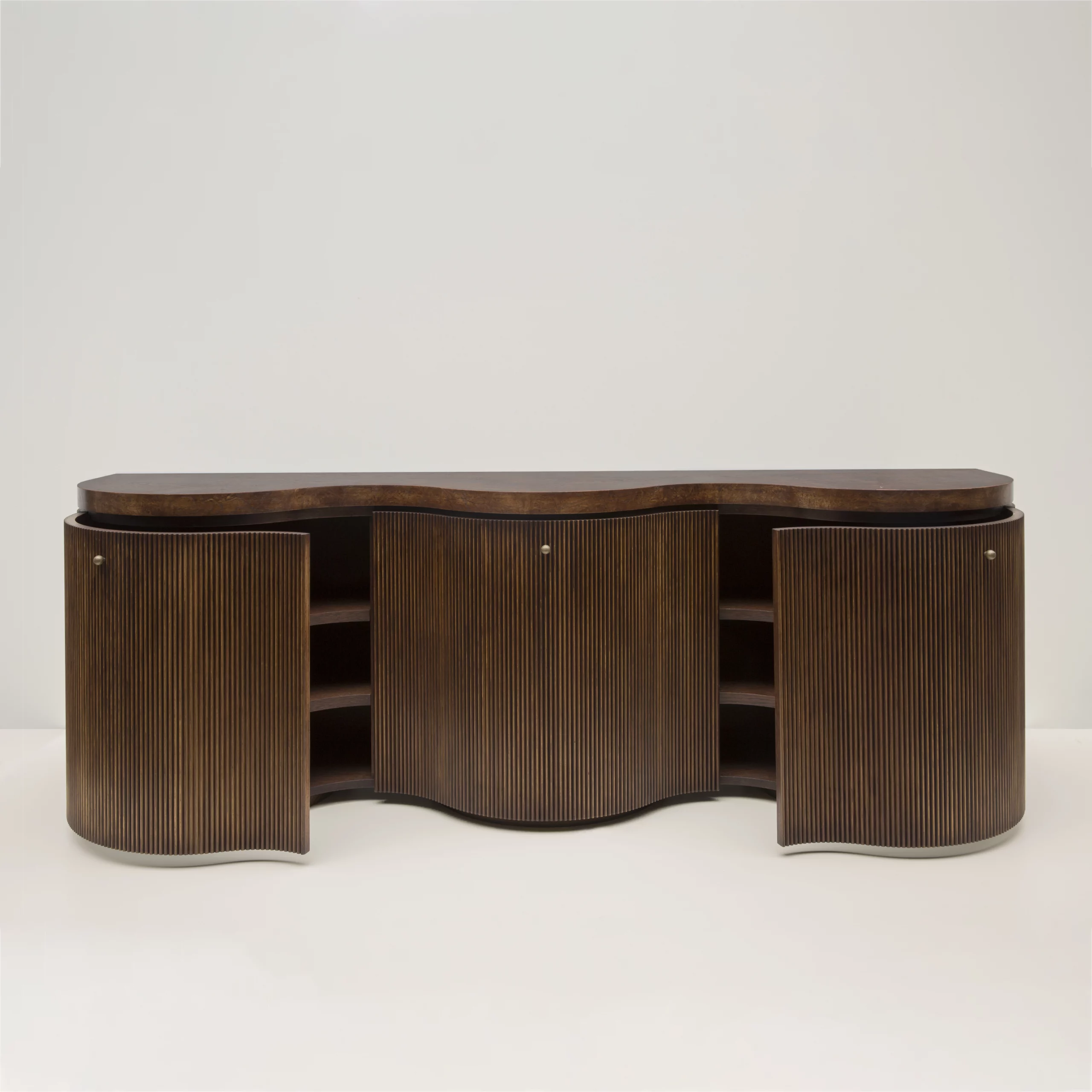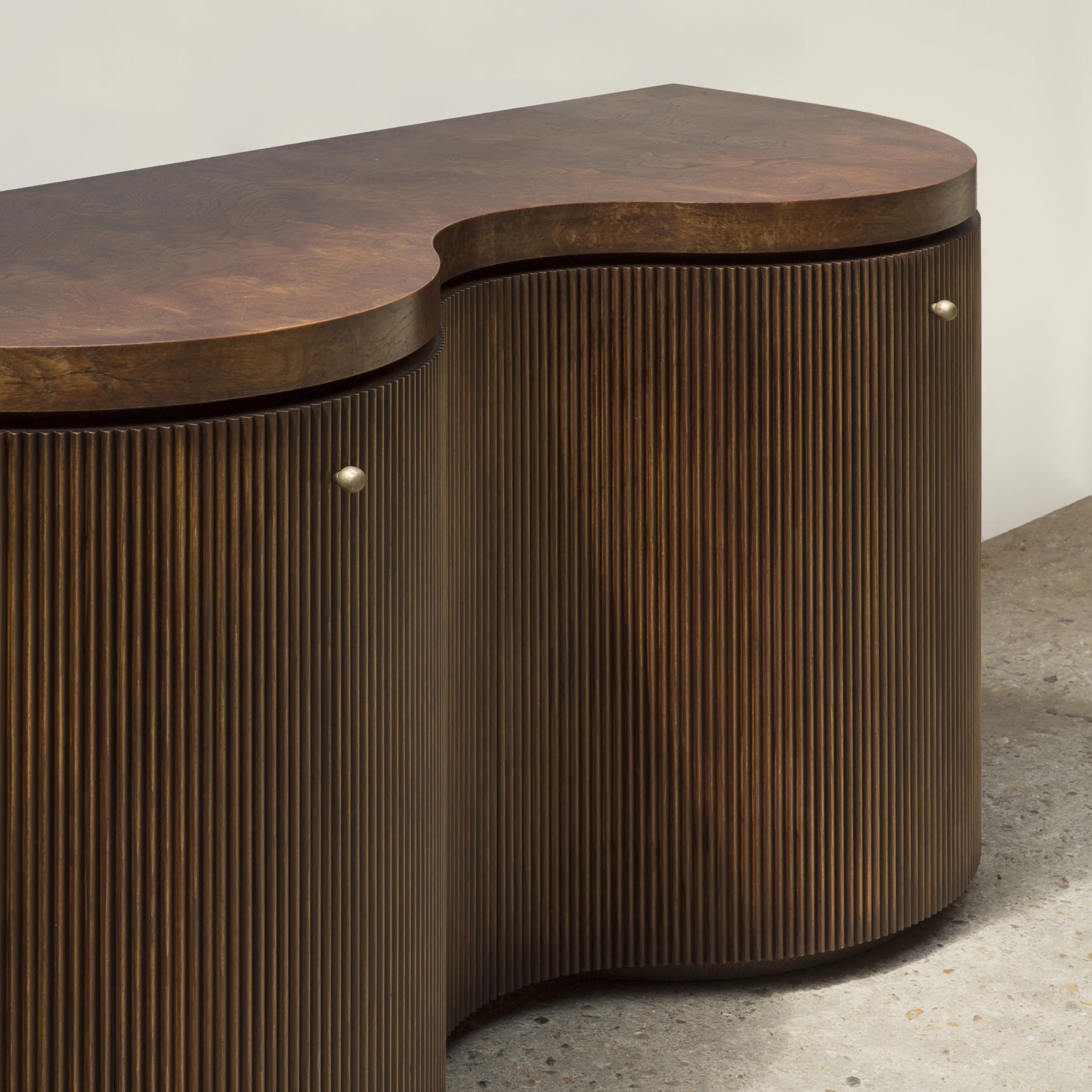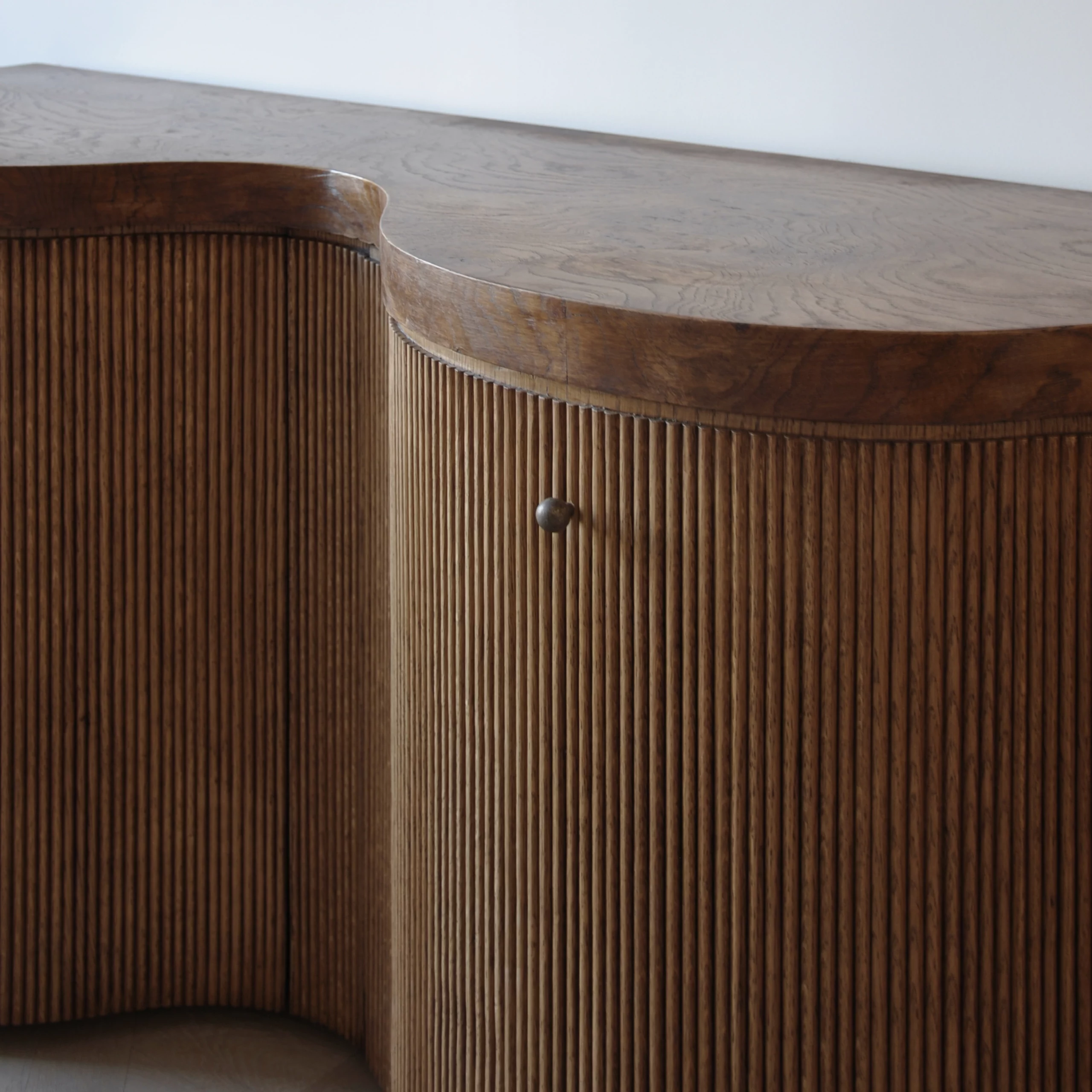 The ARY collection challenges with its free forms and artisanal virtuosity. The undulations formed by the fluted wood create a fluid rhythm and give the furniture all its rarity and uniqueness. The oak burl that adorns the tops, reveals imaginary and unique landscapes, and enlivens table, bench or sideboard.