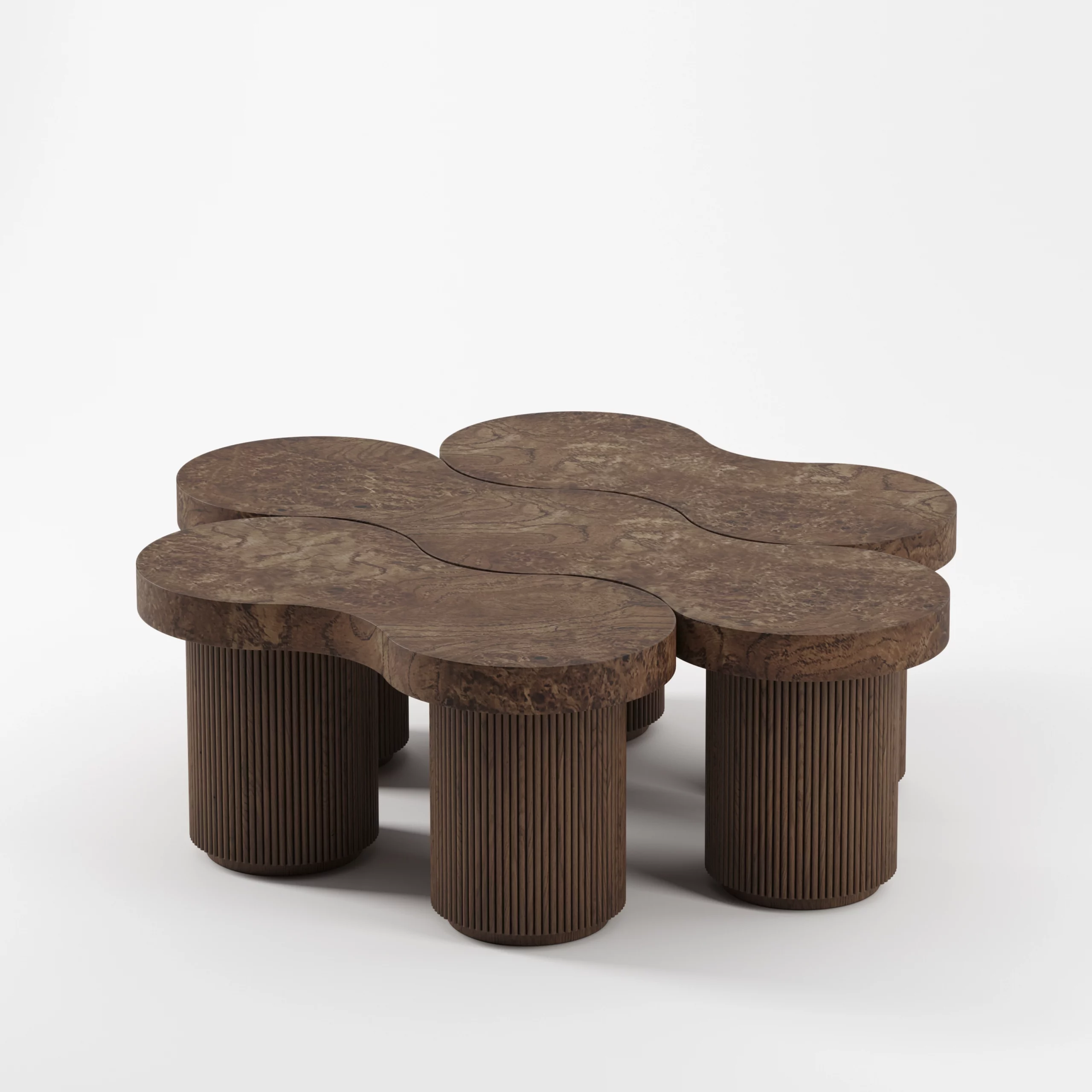 The ARY collection challenges with its free forms and artisanal virtuosity. The undulations formed by the fluted wood create a fluid rhythm and give the furniture all its rarity and uniqueness. The oak burl that adorns the tops, reveals imaginary and unique landscapes, and enlivens table, bench or sideboard.