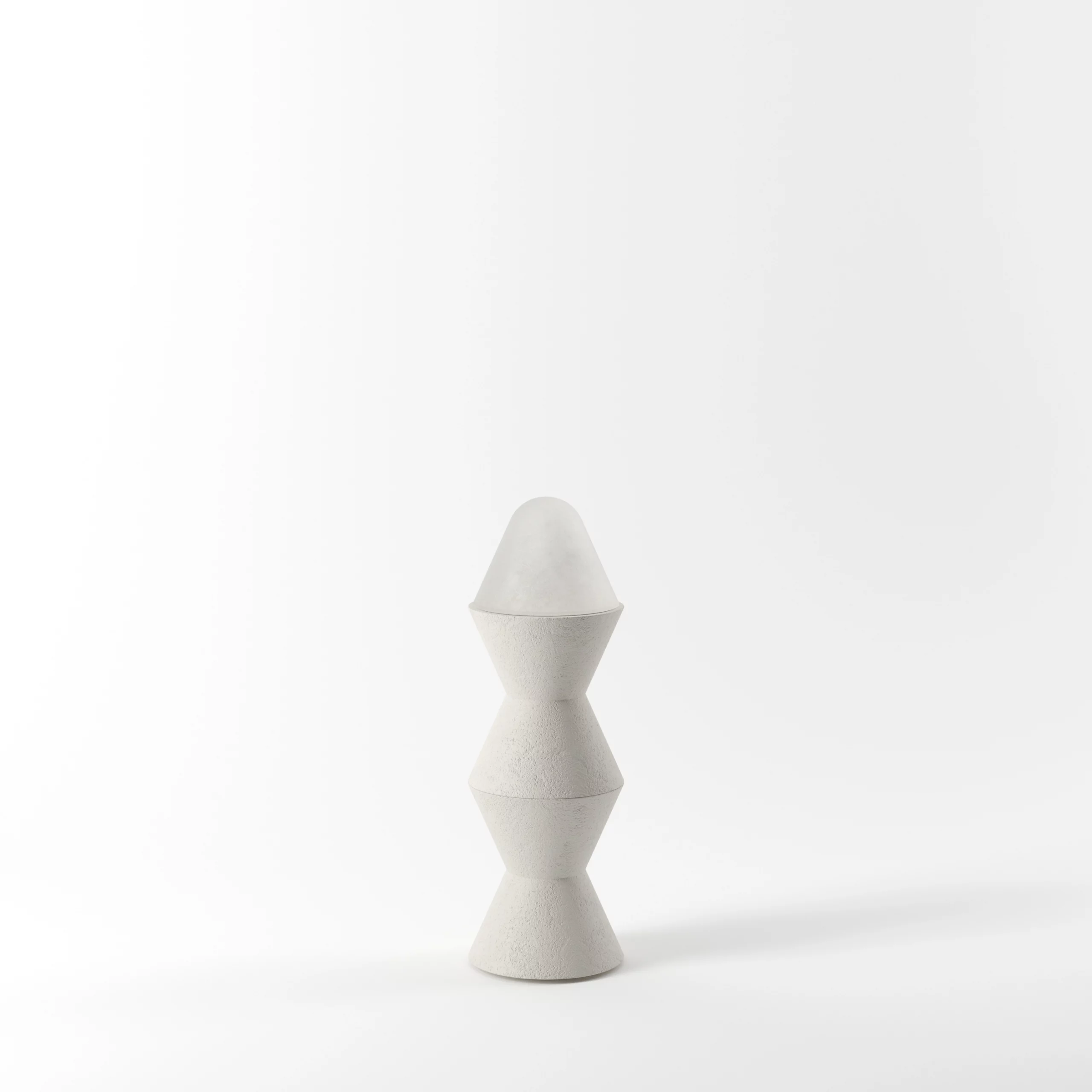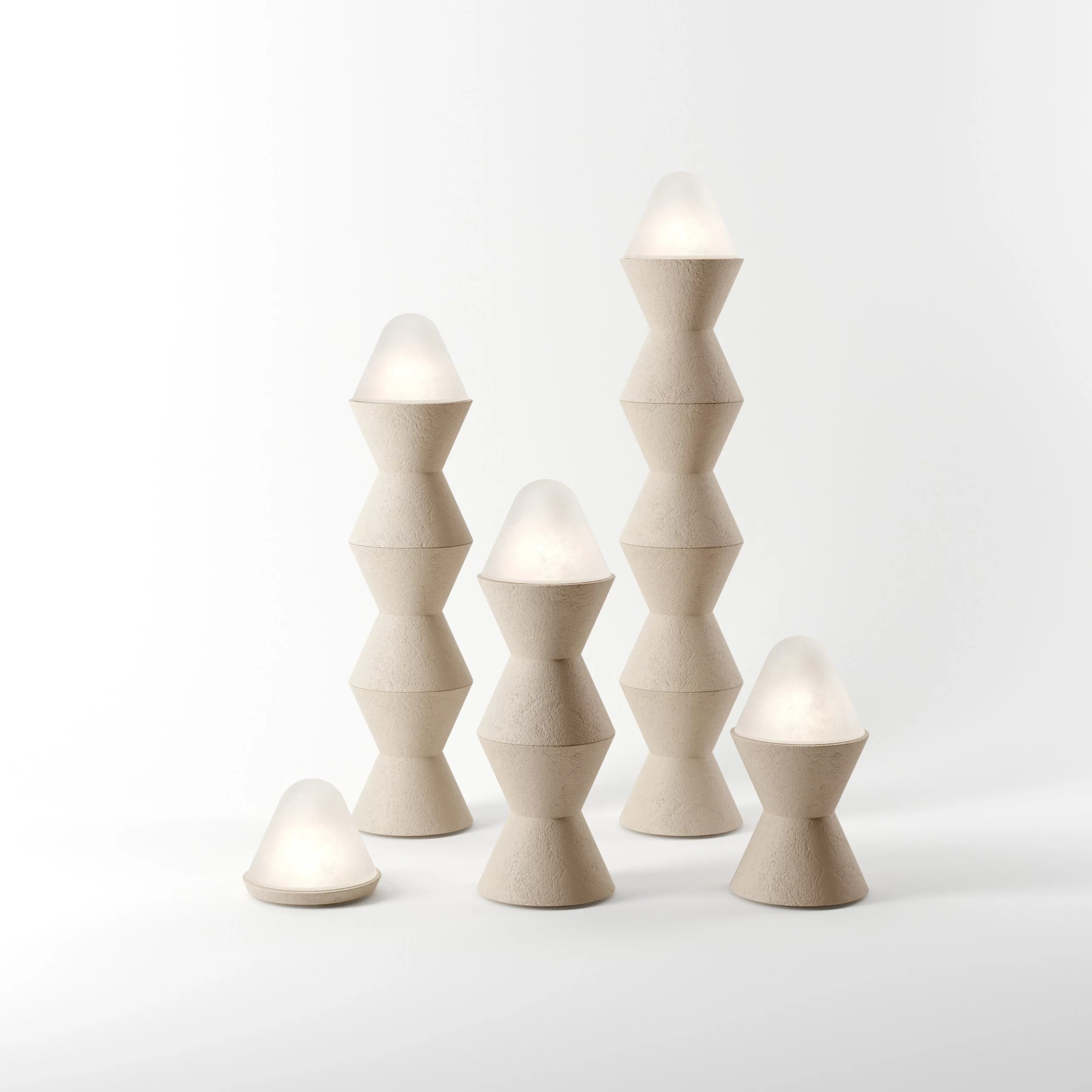 The CONE X collection skillfully combines chamotte plaster with frosted glass. Versatile, these lighting fixtures can be used as table lamps or stacked into totems for a sculptural effect. The luminous dome is artisanally blown, creating a textured effect that diffuses soft and variable light.