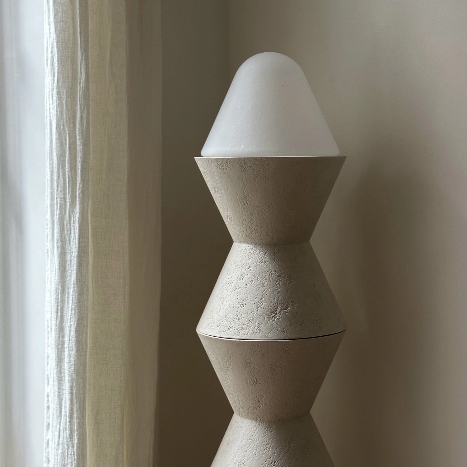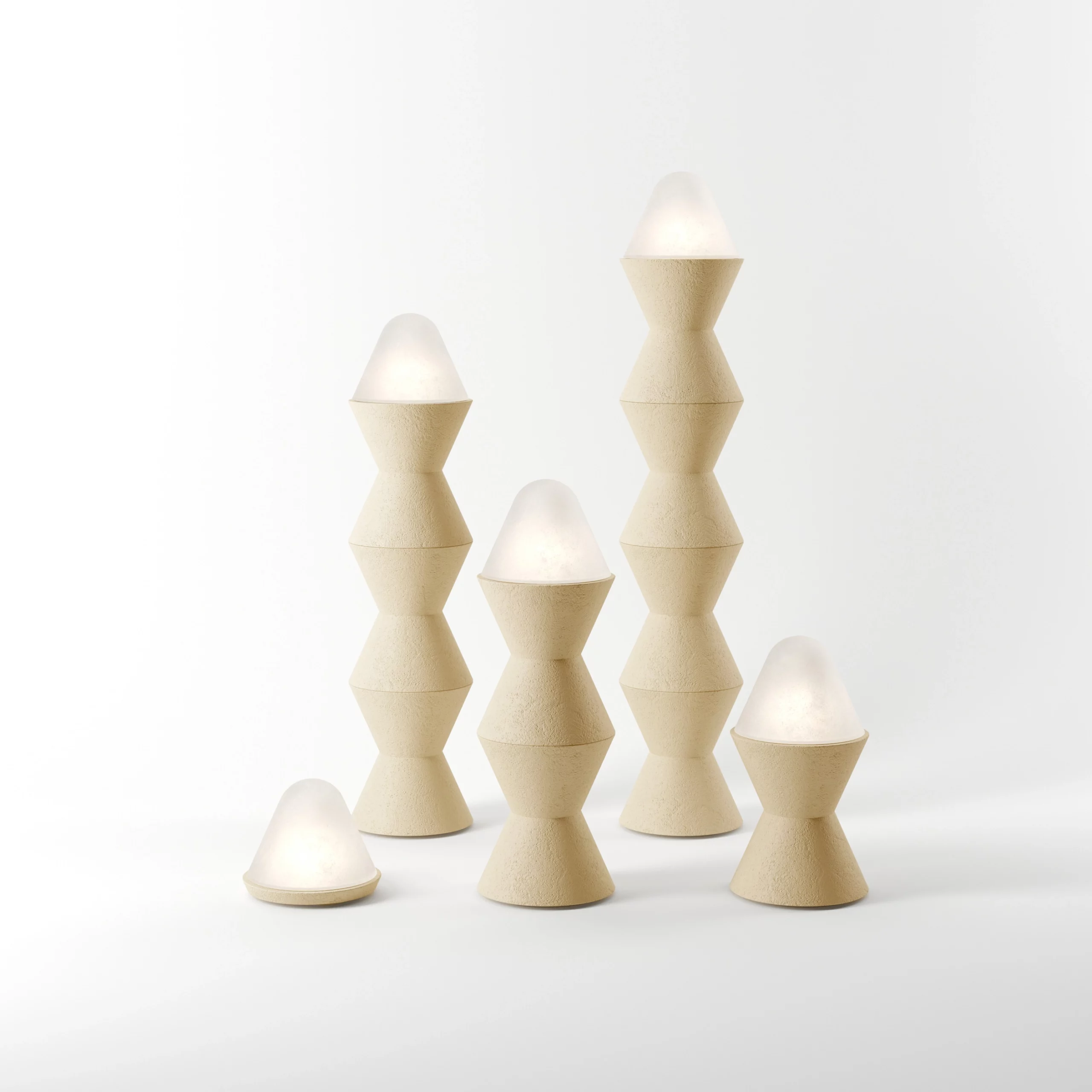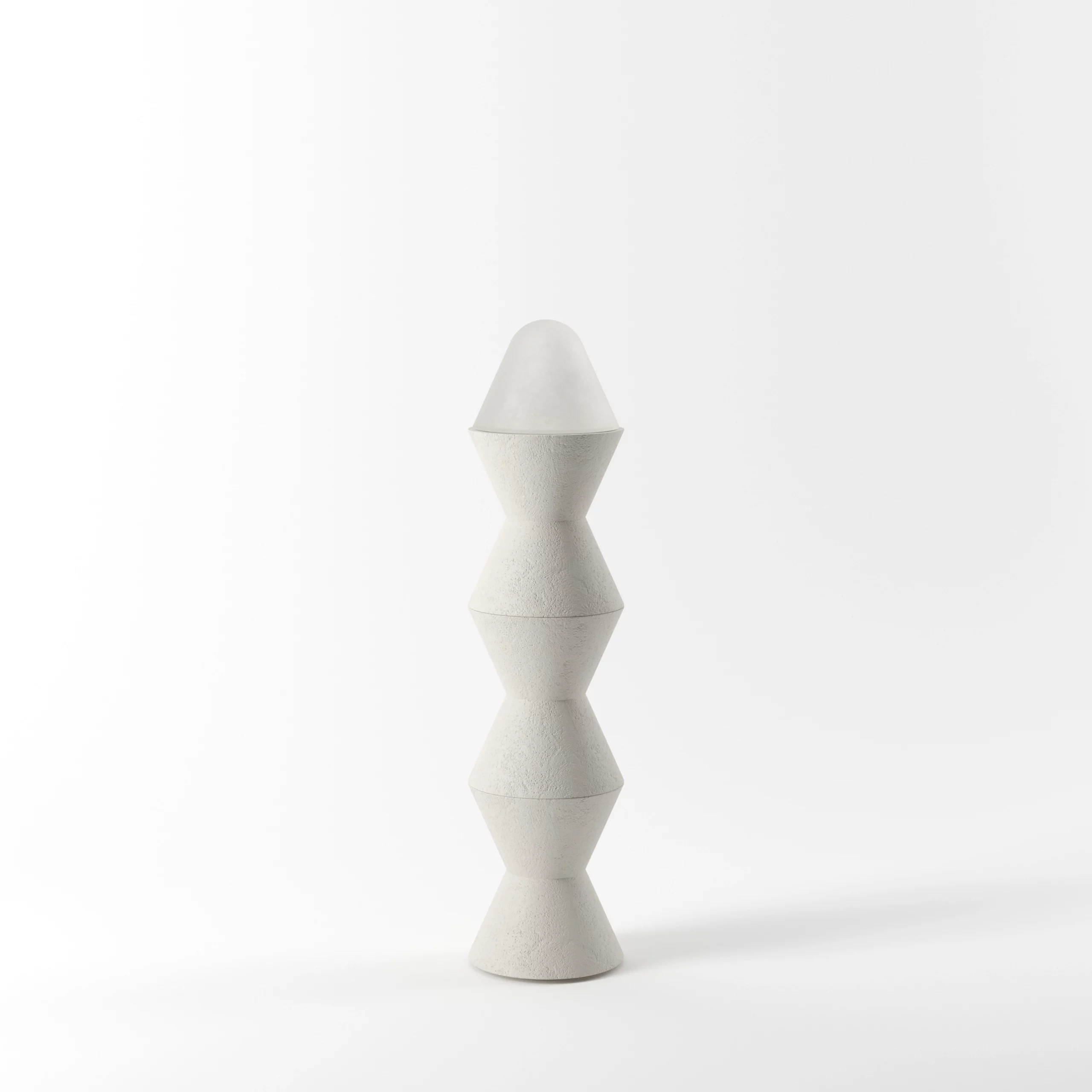 The CONE X collection skillfully combines chamotte plaster with frosted glass. Versatile, these lighting fixtures can be used as table lamps or stacked into totems for a sculptural effect. The luminous dome is artisanally blown, creating a textured effect that diffuses soft and variable light.
