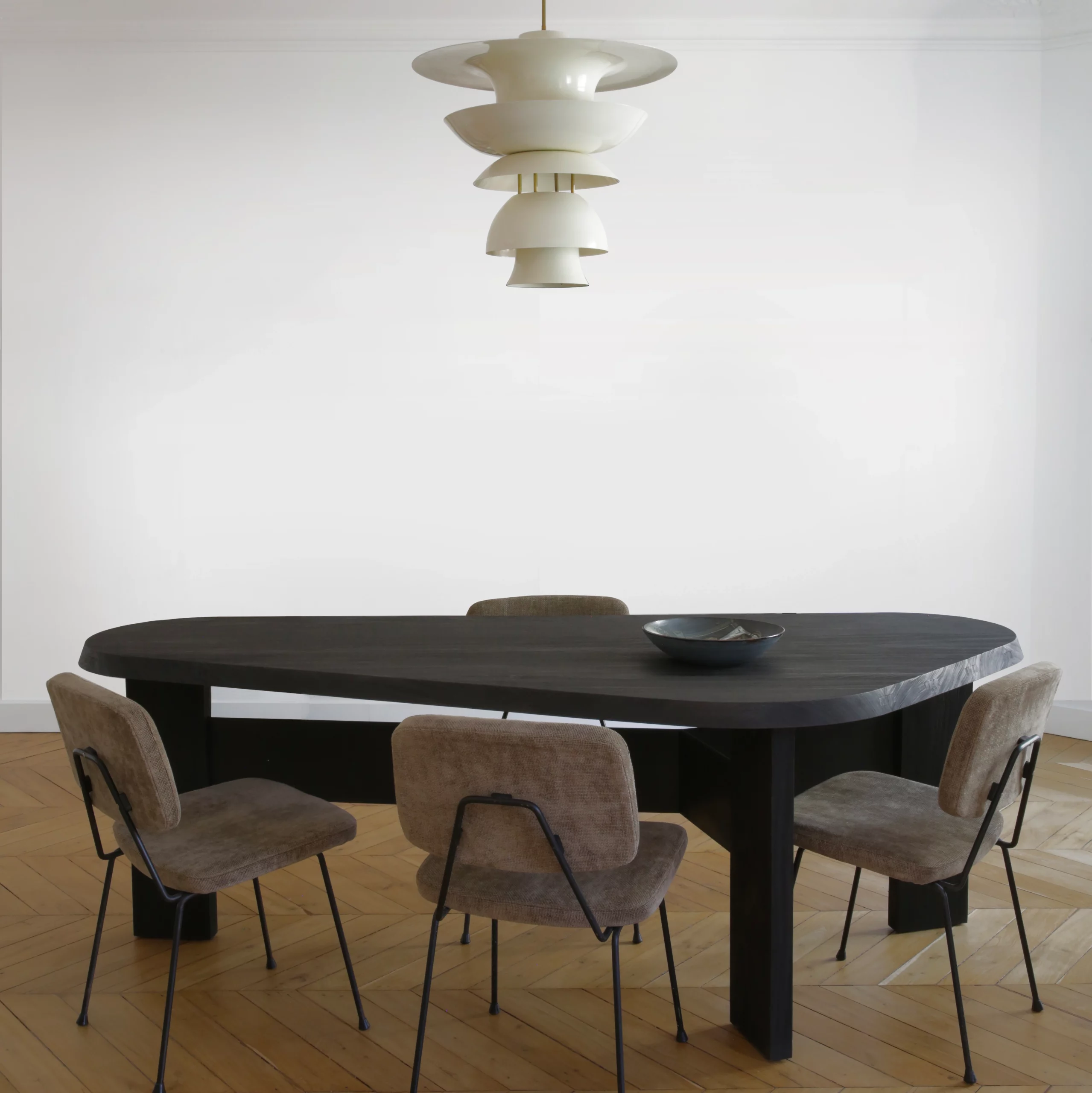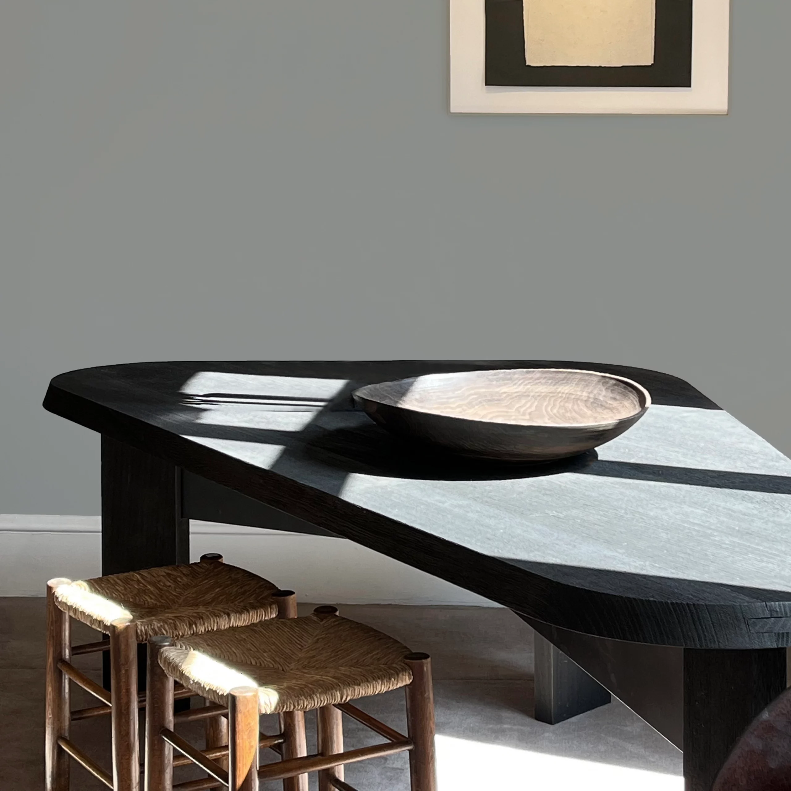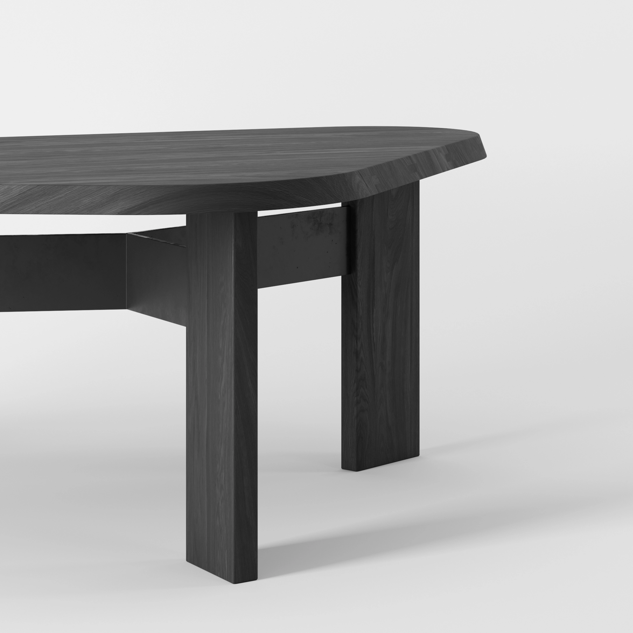 CHThe ELLY collection celebrates the presence of material with its thick solid wood tabletops and traditionally joined beveled edges. In natural oak or black-patinated Assamela, the texture of the brushed solid wood, combined with blackened metal, enhances the tactile aspect of these expressive pieces. The ELLY table, with its asymmetrical triangular shapes, can be used as a dining table or a desk, and can be experienced individually or in combination.