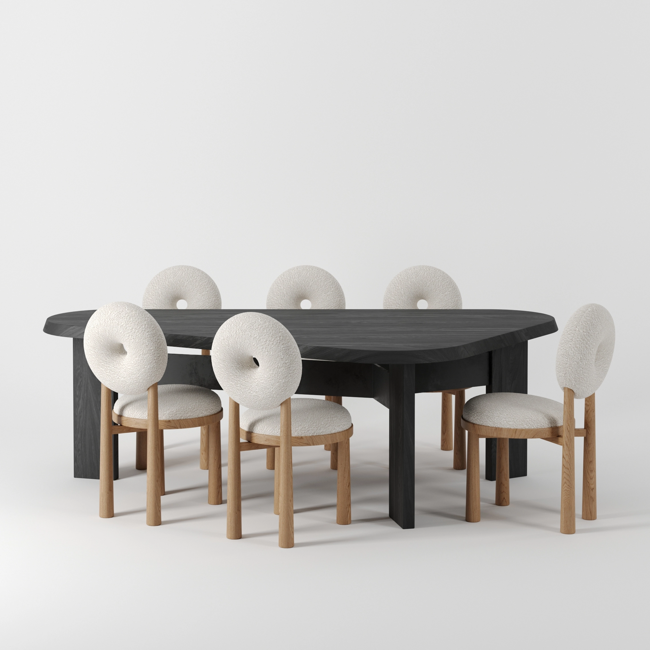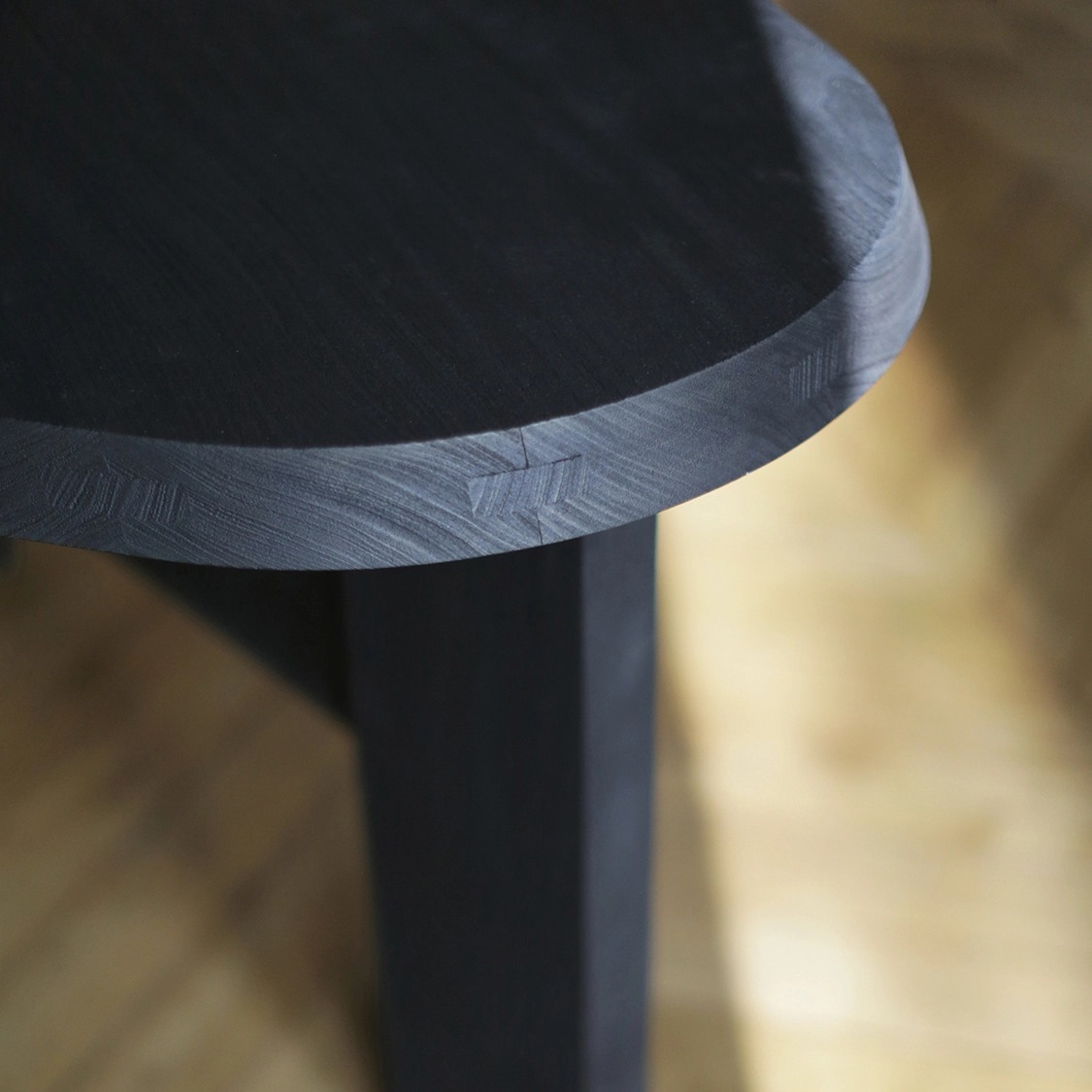 The ELLY collection celebrates the presence of material with its thick solid wood tabletops and traditionally joined beveled edges. In natural oak or black-patinated Assamela, the texture of the brushed solid wood, combined with blackened metal, enhances the tactile aspect of these expressive pieces. The ELLY table, with its asymmetrical triangular shapes, can be used as a dining table or a desk, and can be experienced individually or in combination.