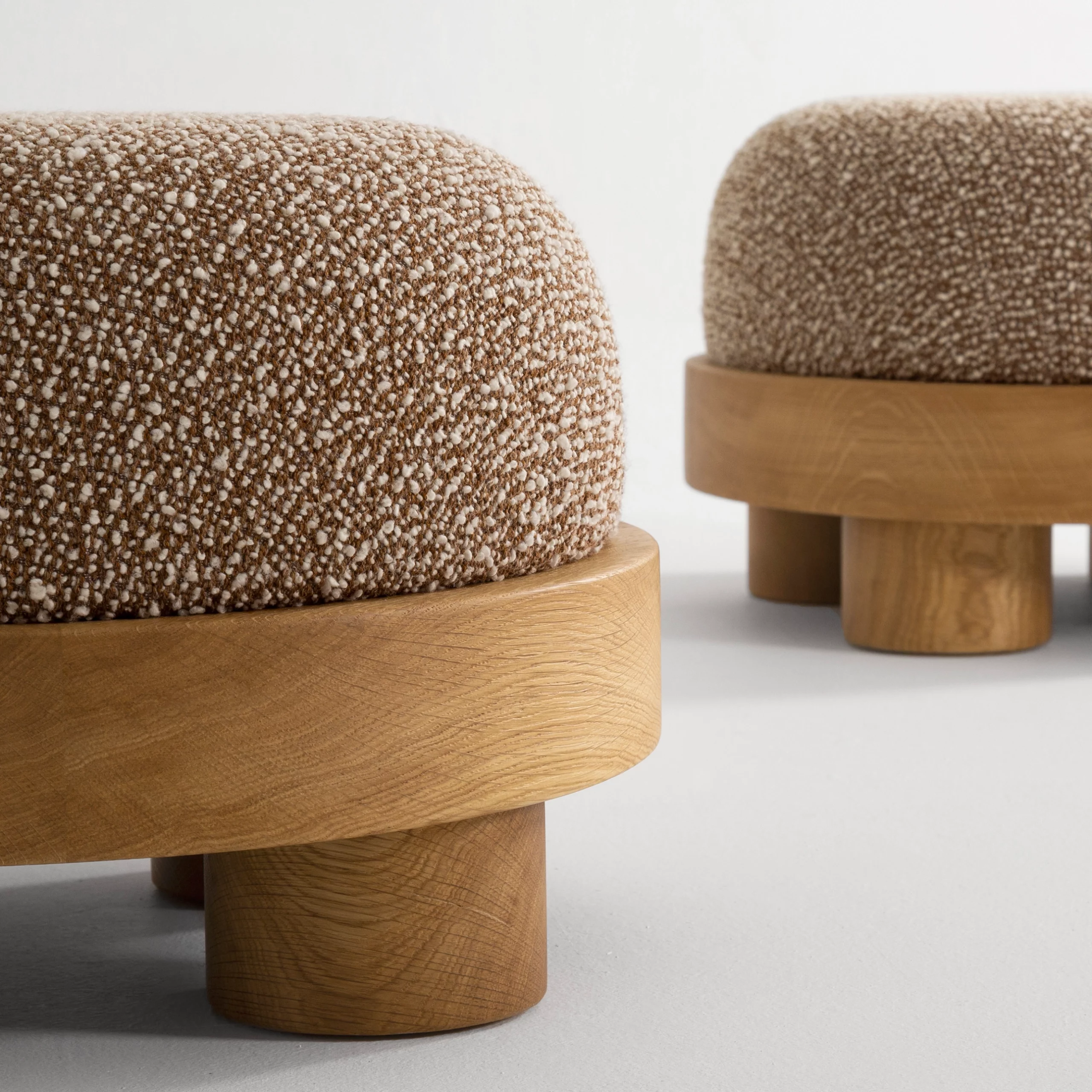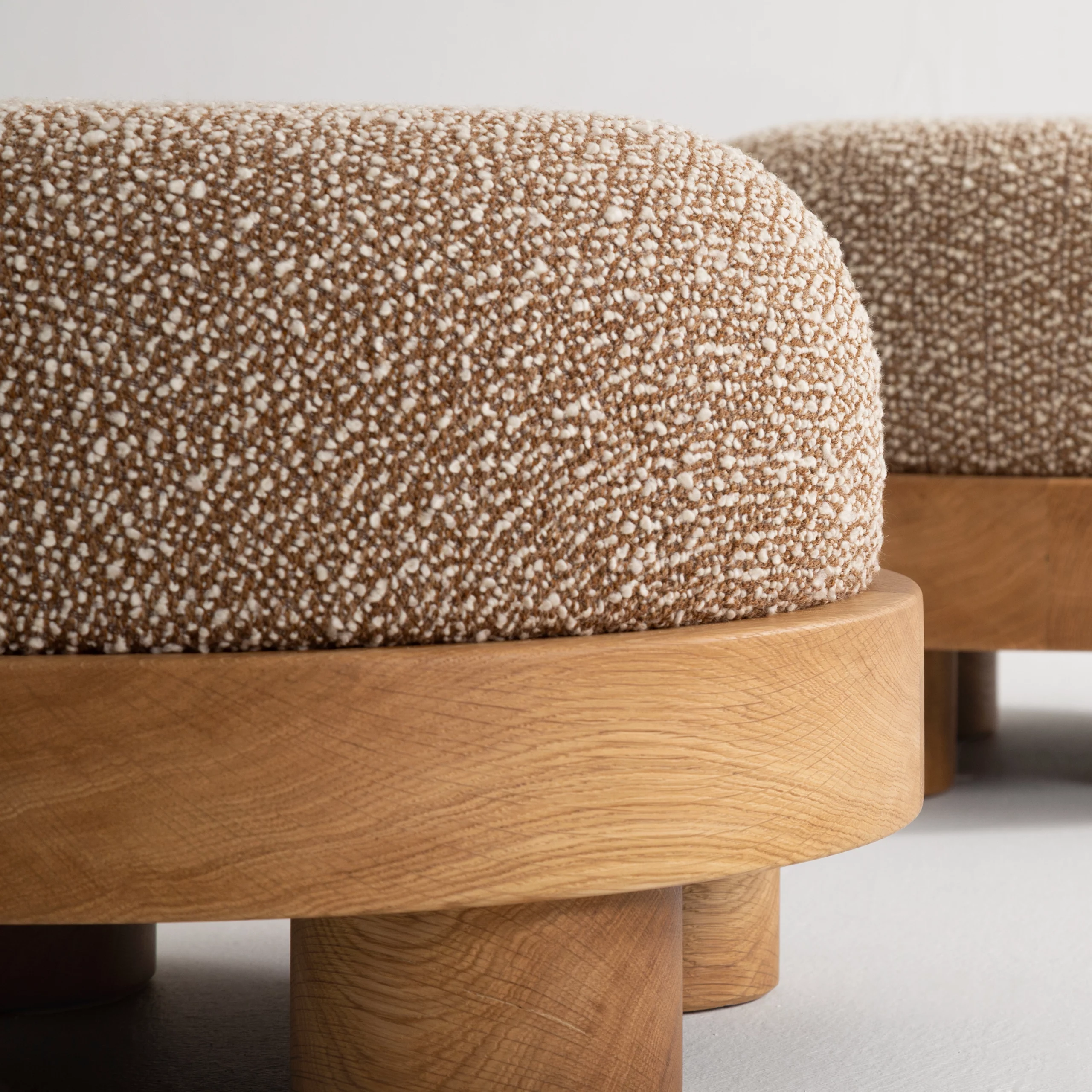 The NOMAD collection engages in a dialogue between wabi-sabi inspiration and French sophistication. The raw appearance of brushed wood contrasts with the upholstered curves of the seating; the minimal line merges with rounded forms, creating a harmonious and refined balance.