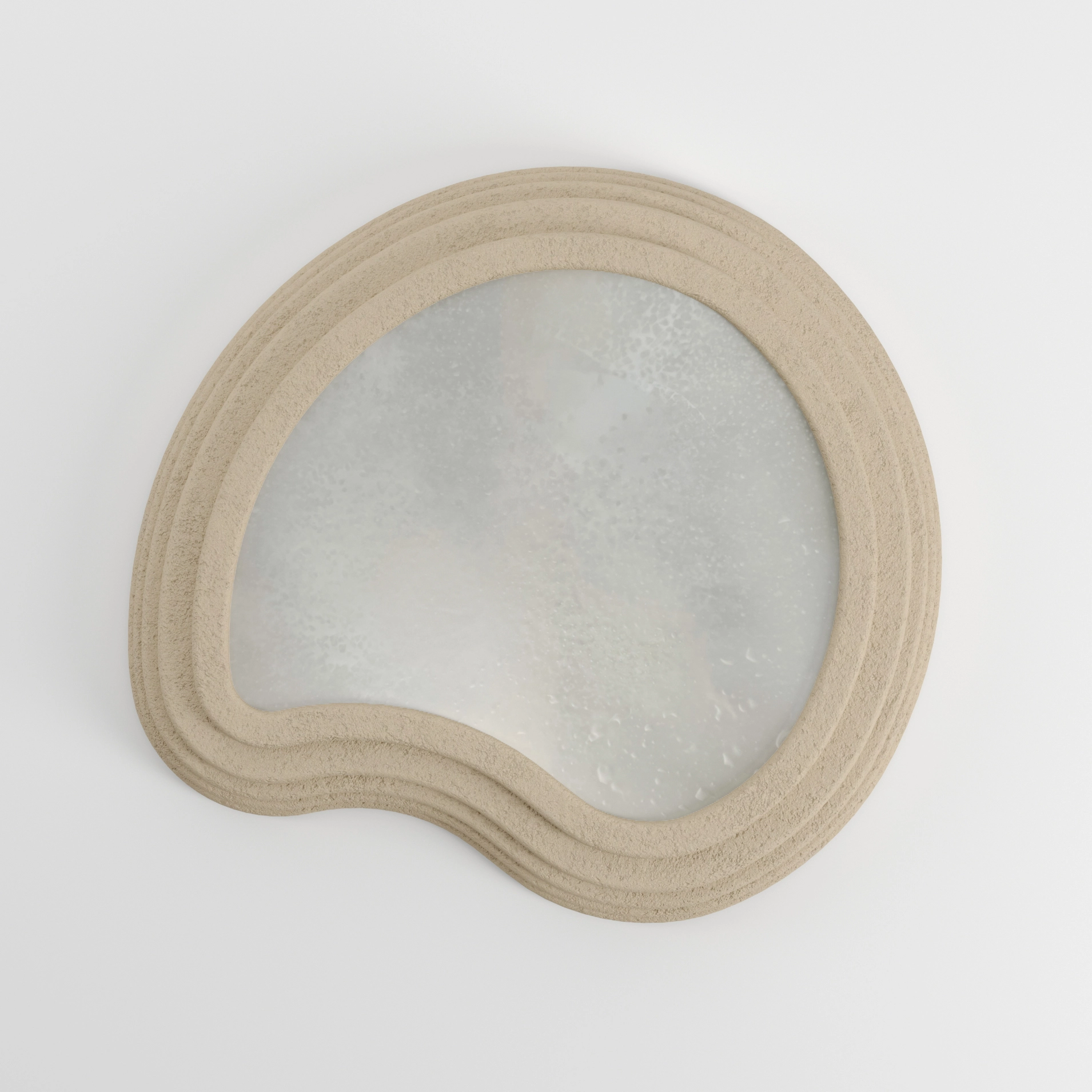 The frosted glass of the ceiling light, captured in a plaster frame, creates a liquid, almost elusive, movement. The ceiling becomes a sky, gently diffusing its soft light. The mirror, on the other hand, evokes dreams and contemplation.