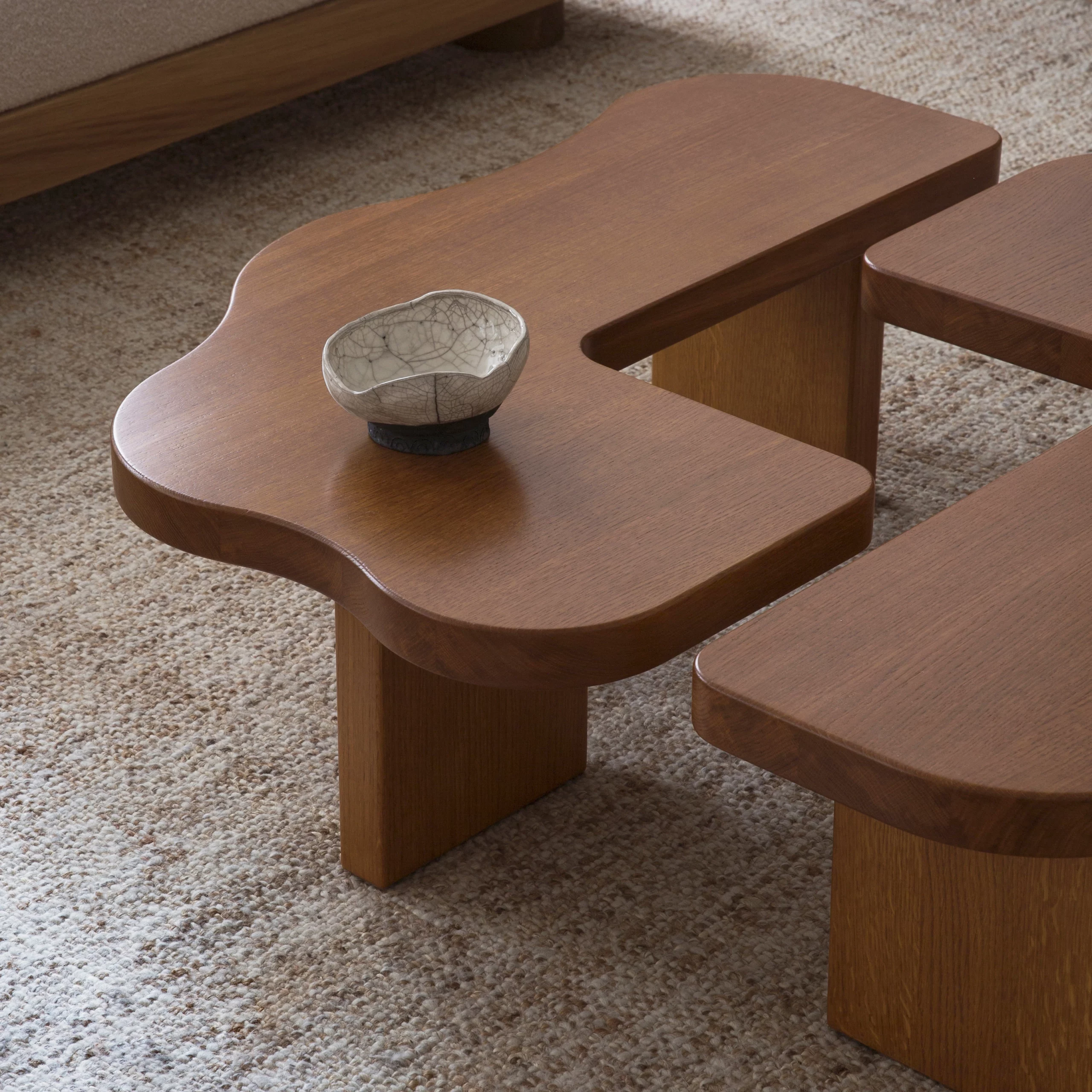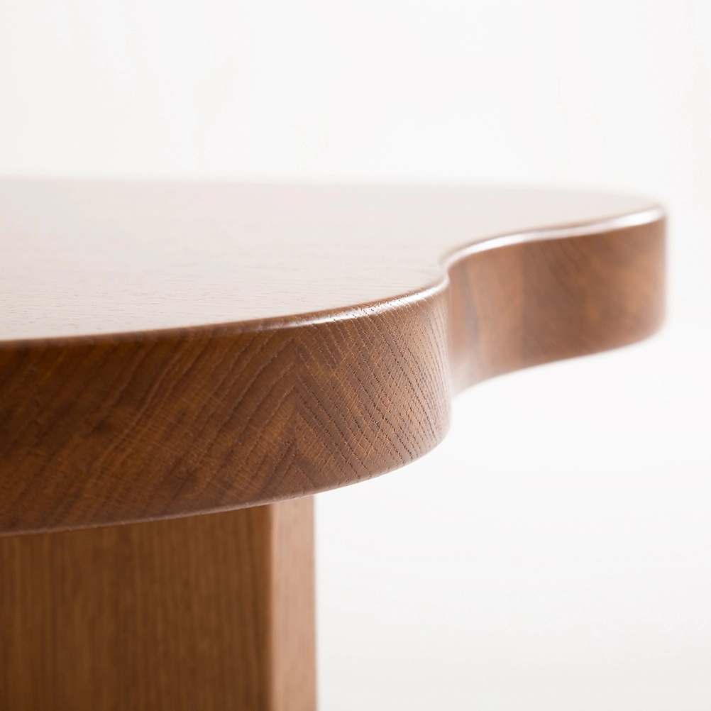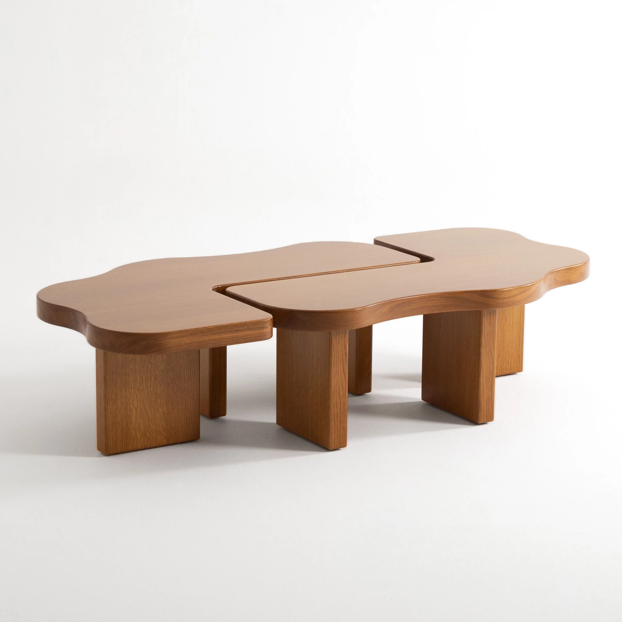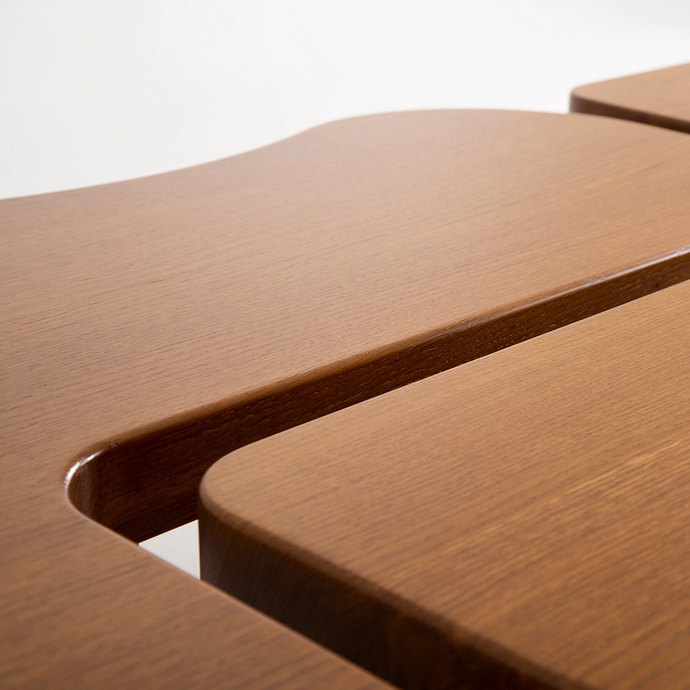 The ORMA collection is characterized by its fluid undulations in the form of waves sculpted from honey-colored varnished solid wood. The coffee table evokes a duo that is both united and free, complementing, interlocking, and assembling together. Sometimes square, sometimes rectangular, the elements move according to your desires. The headboard, soft and comforting, envelops us with its sensual and generous form.”