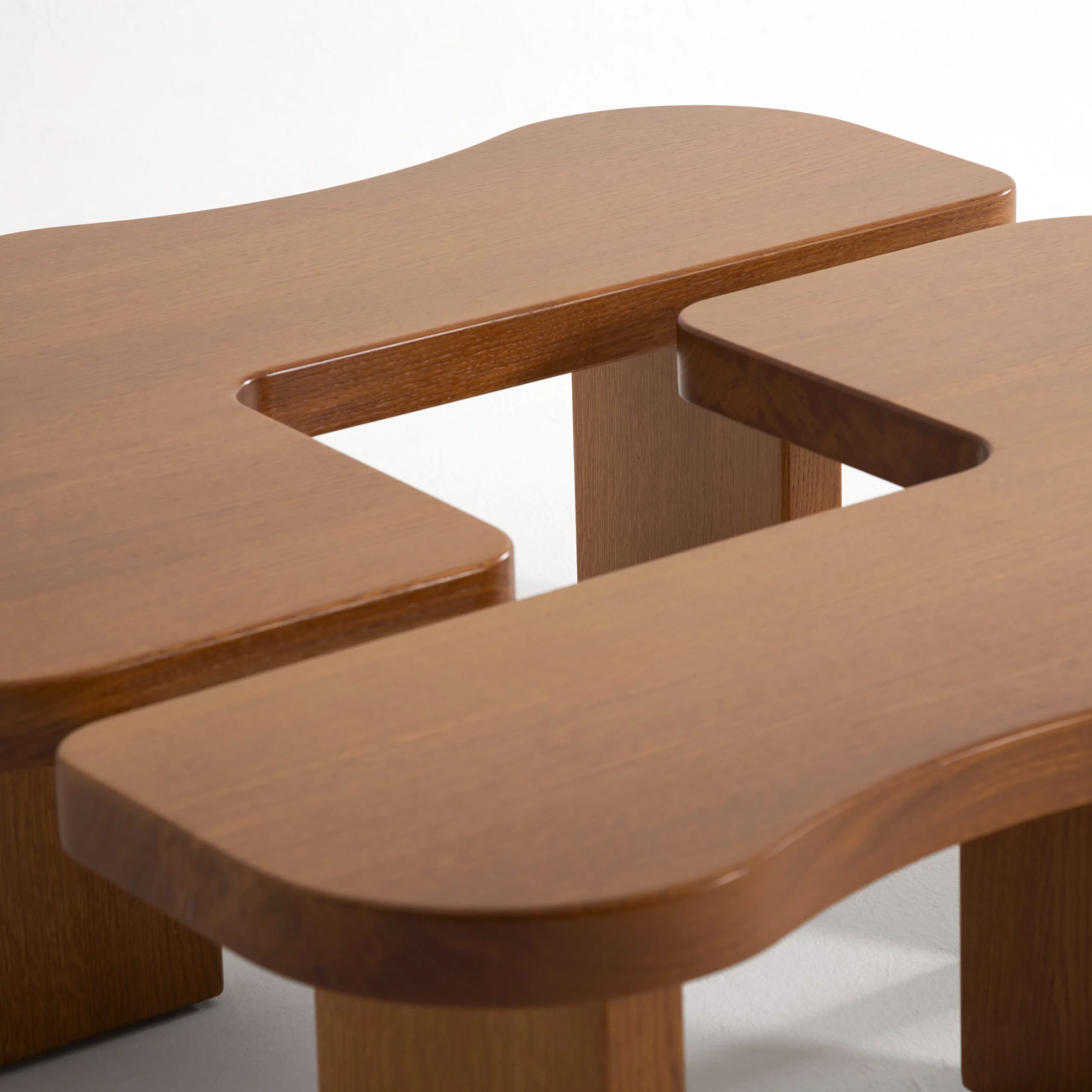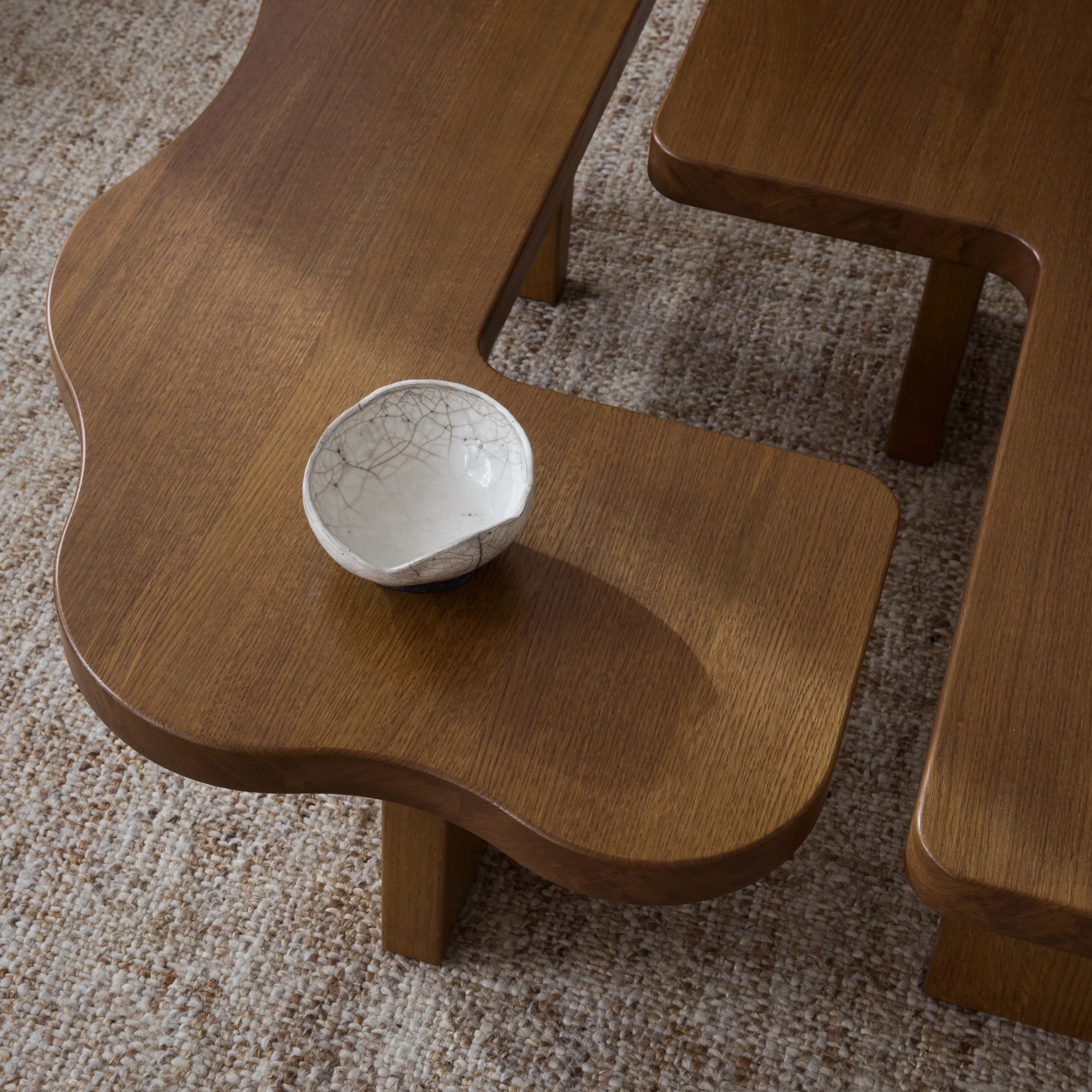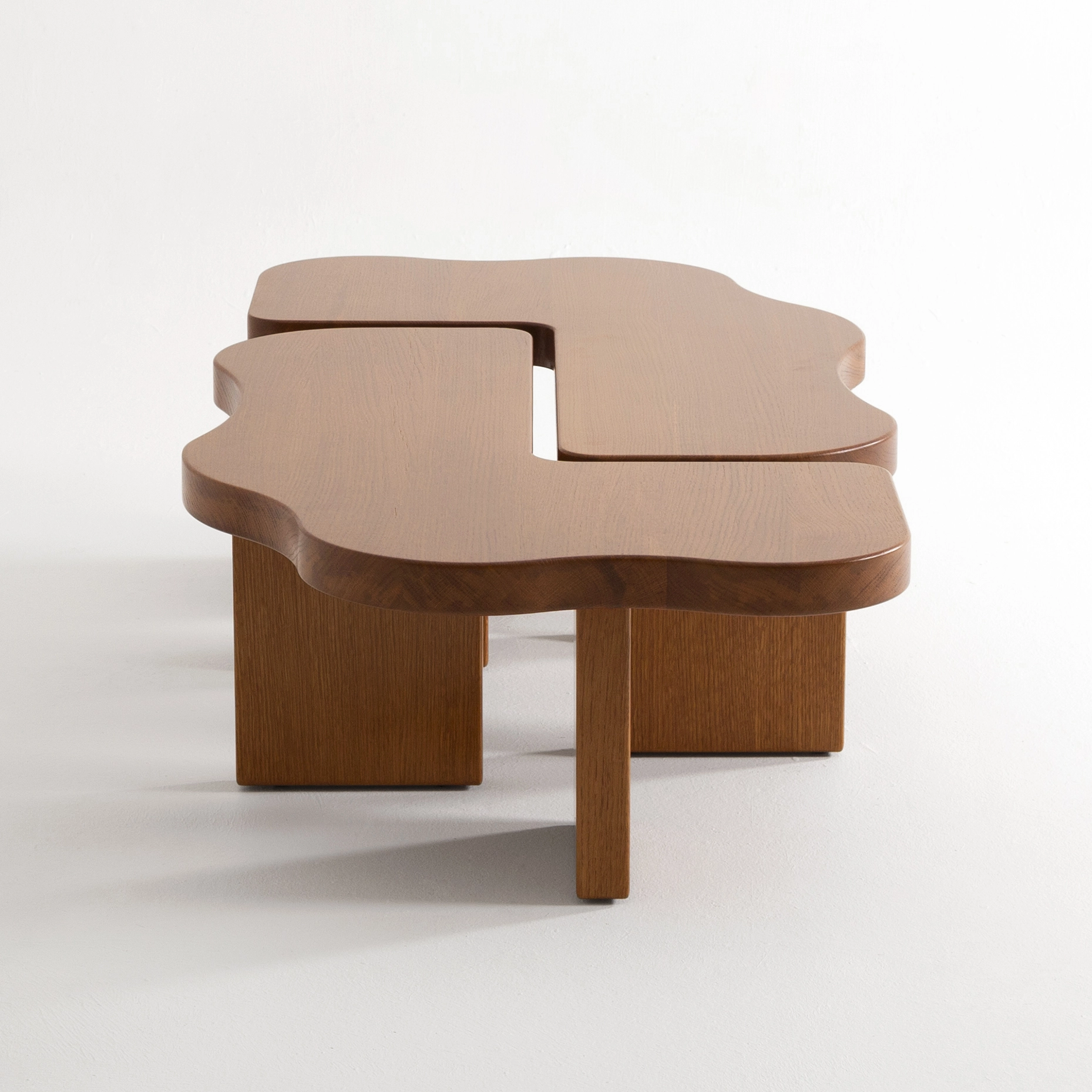 The ORMA collection is characterized by its fluid undulations in the form of waves sculpted from honey-colored varnished solid wood. The coffee table evokes a duo that is both united and free, complementing, interlocking, and assembling together. Sometimes square, sometimes rectangular, the elements move according to your desires. The headboard, soft and comforting, envelops us with its sensual and generous form.”