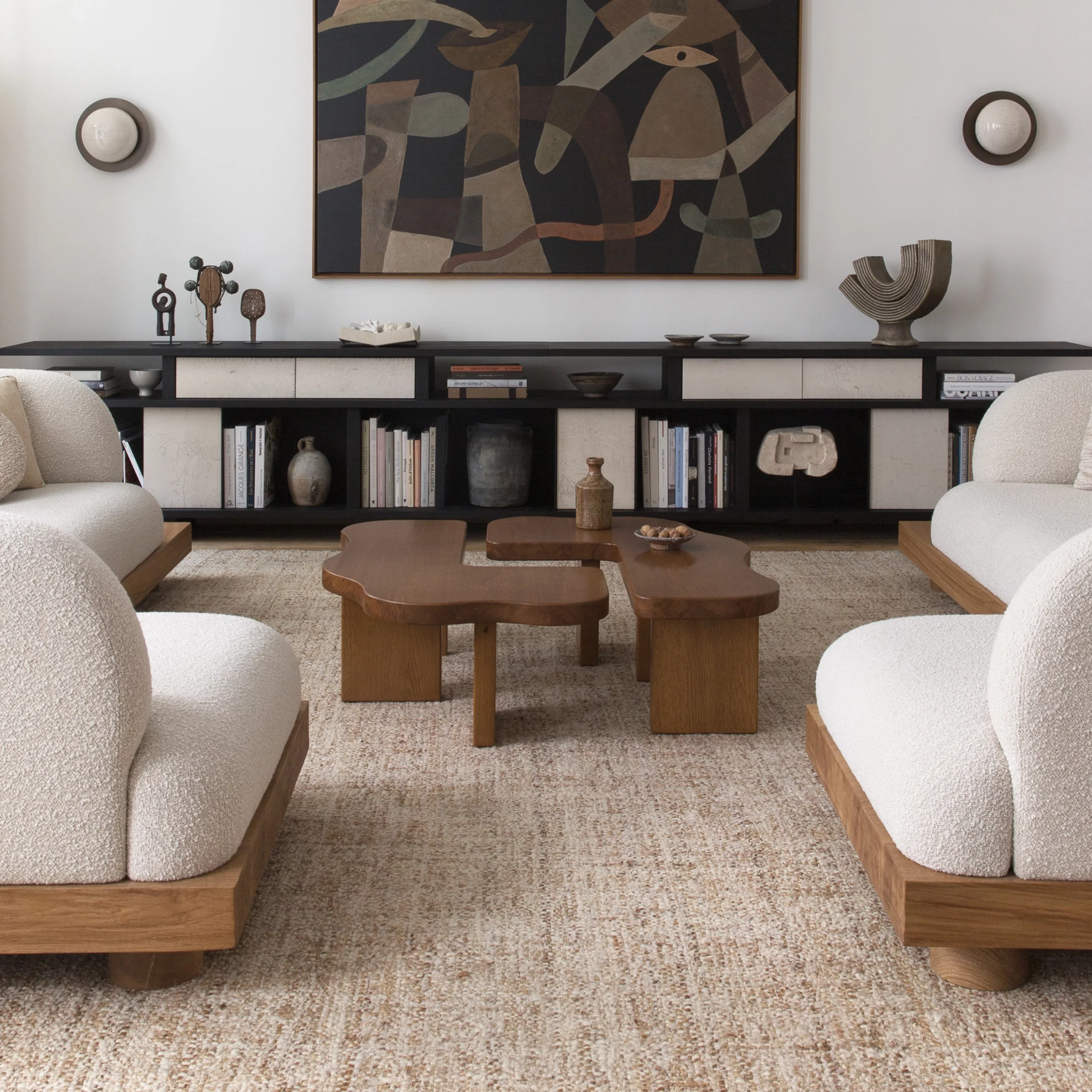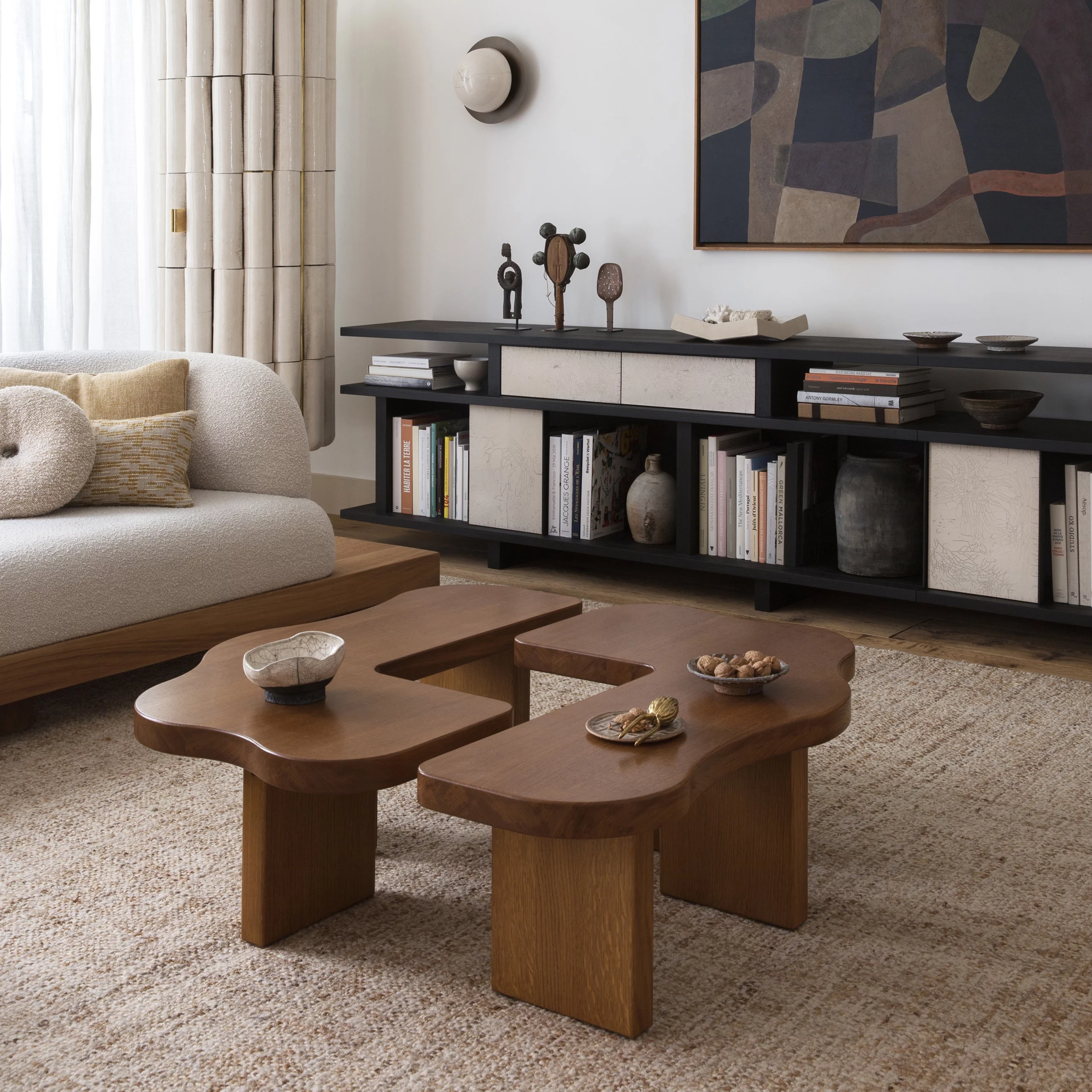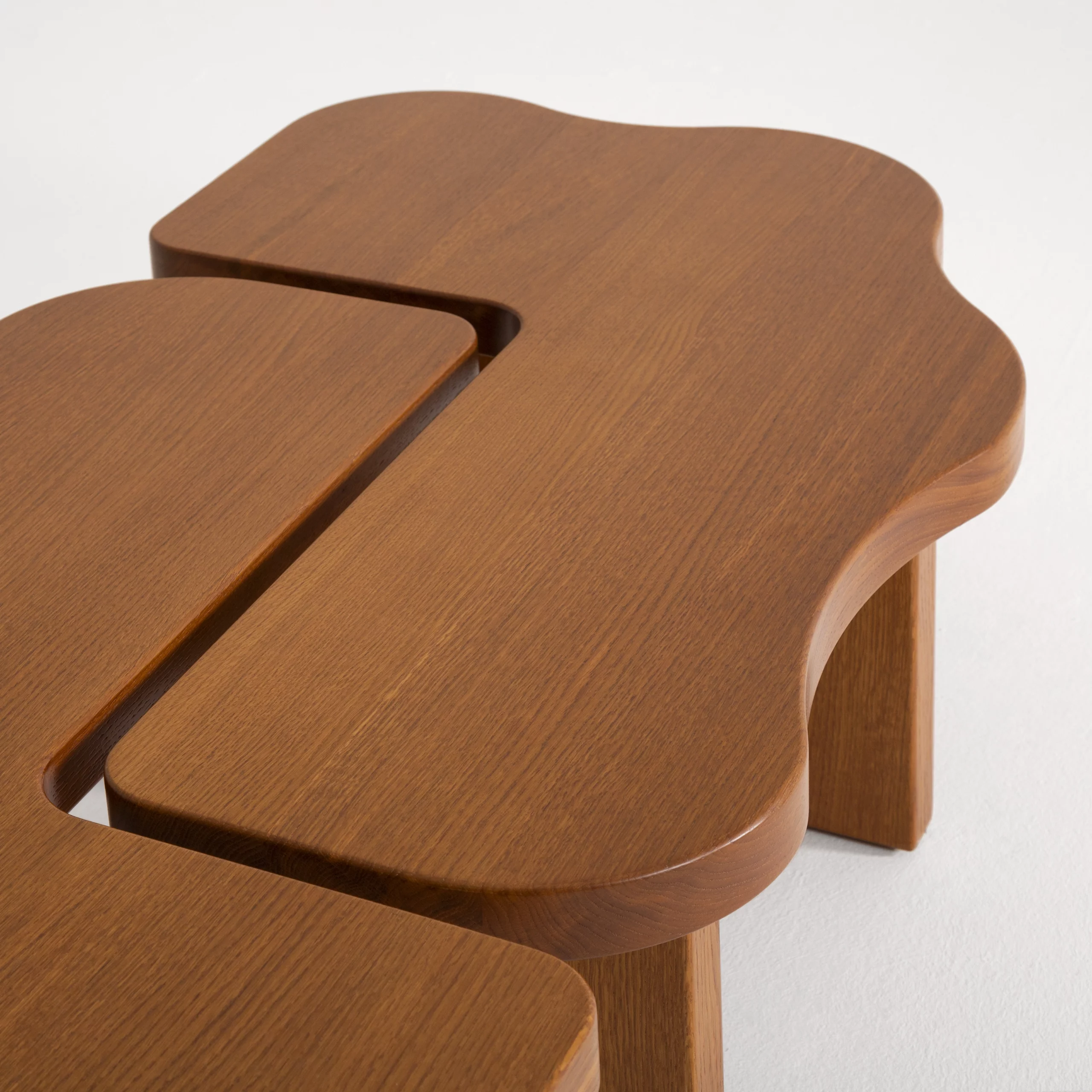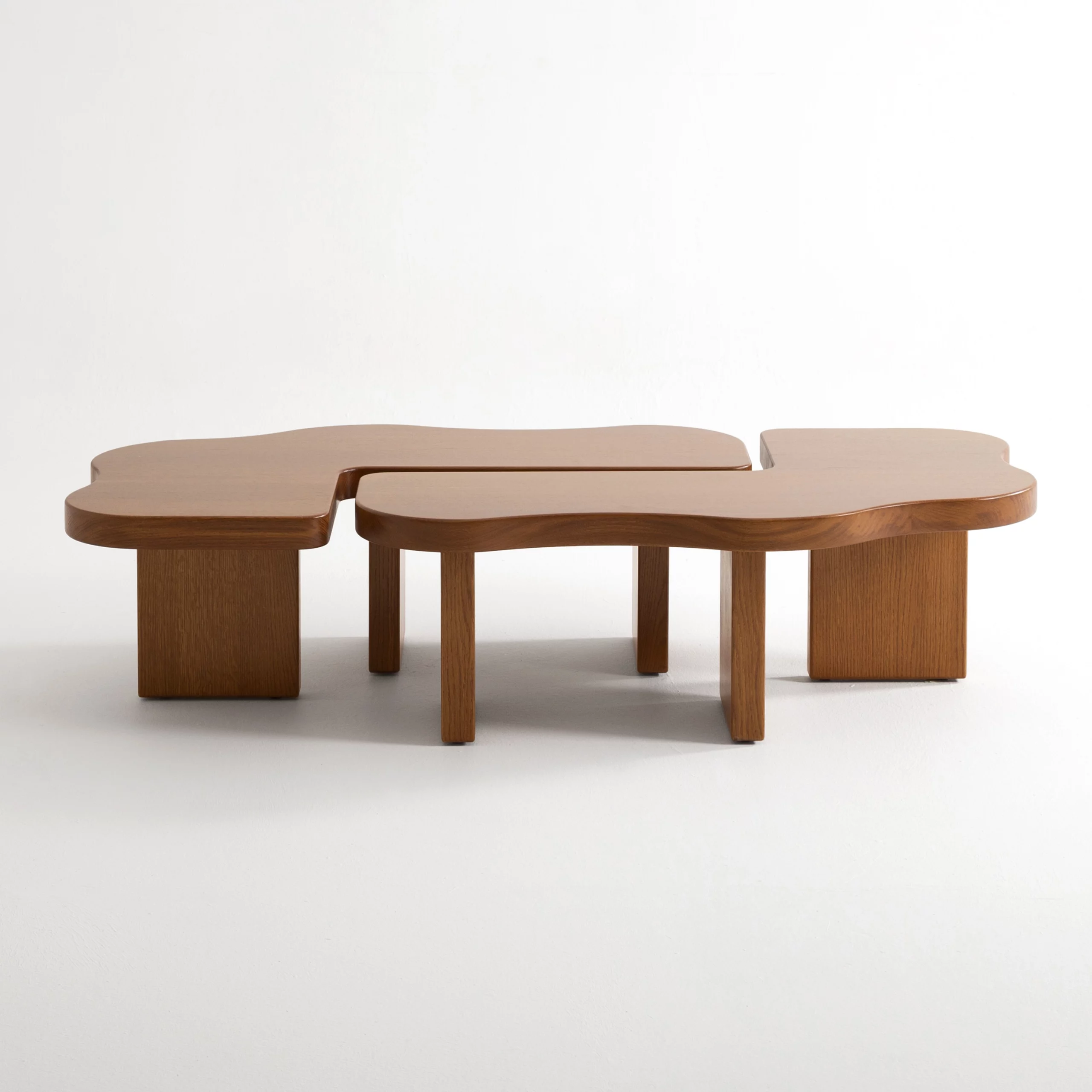 The ORMA collection is characterized by its fluid undulations in the form of waves sculpted from honey-colored varnished solid wood. The coffee table evokes a duo that is both united and free, complementing, interlocking, and assembling together. Sometimes square, sometimes rectangular, the elements move according to your desires. The headboard, soft and comforting, envelops us with its sensual and generous form.”