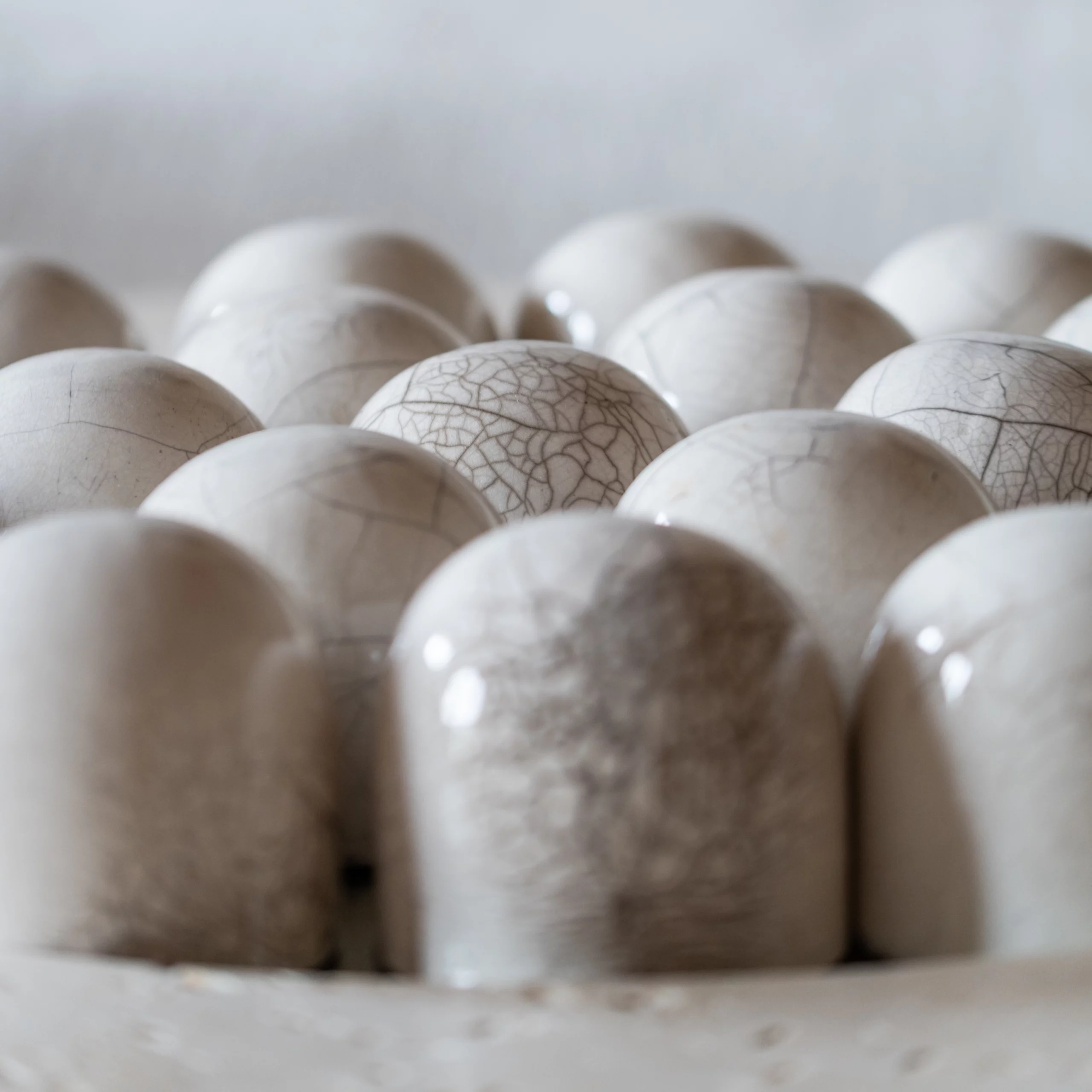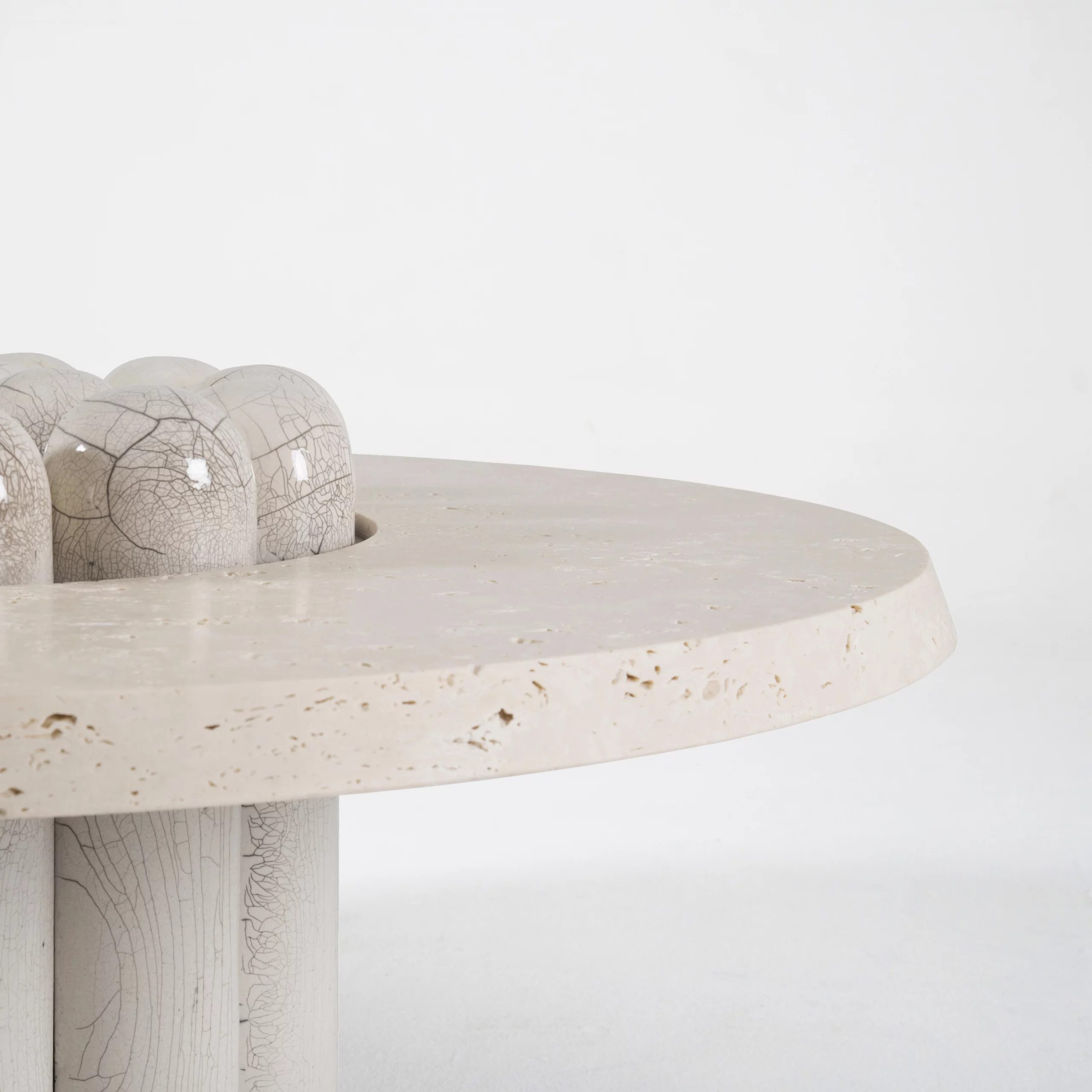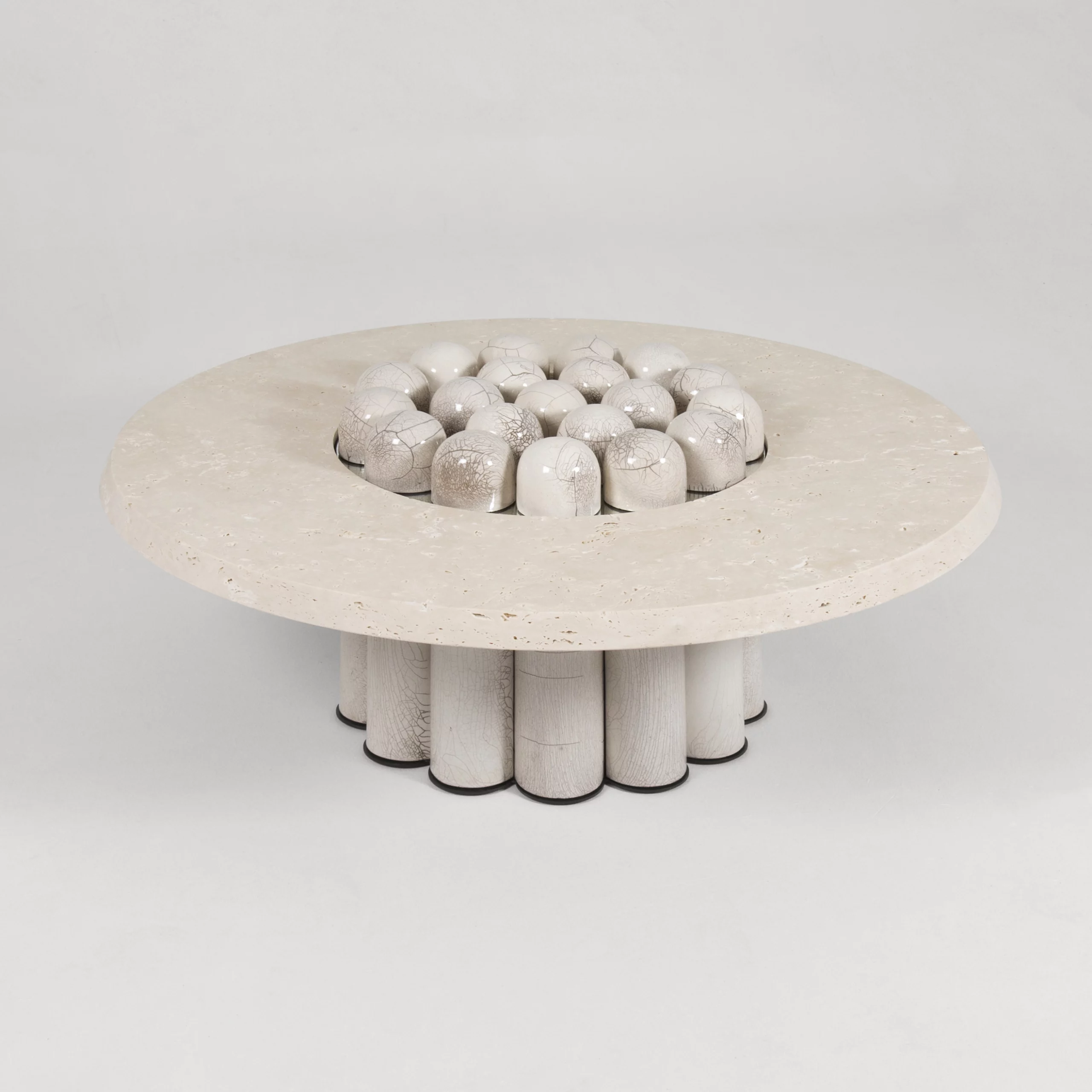 The RAKU-YAKI collection consists of bold and ambitious pieces. The tiles adorning the furniture and lighting fixtures are crafted using Raku, an ancient Japanese ceramic technique. The thermal shock creates cracks in the glaze and reveals subtle black lines, forming random patterns like a landscape seen from above. This technique makes each piece unique, showcasing the power and magic of handcrafted materials in lighting, tables, sideboards, and bar or wall cabinets. These pieces exude a subtle refinement, both in their design and in the aura of the material.