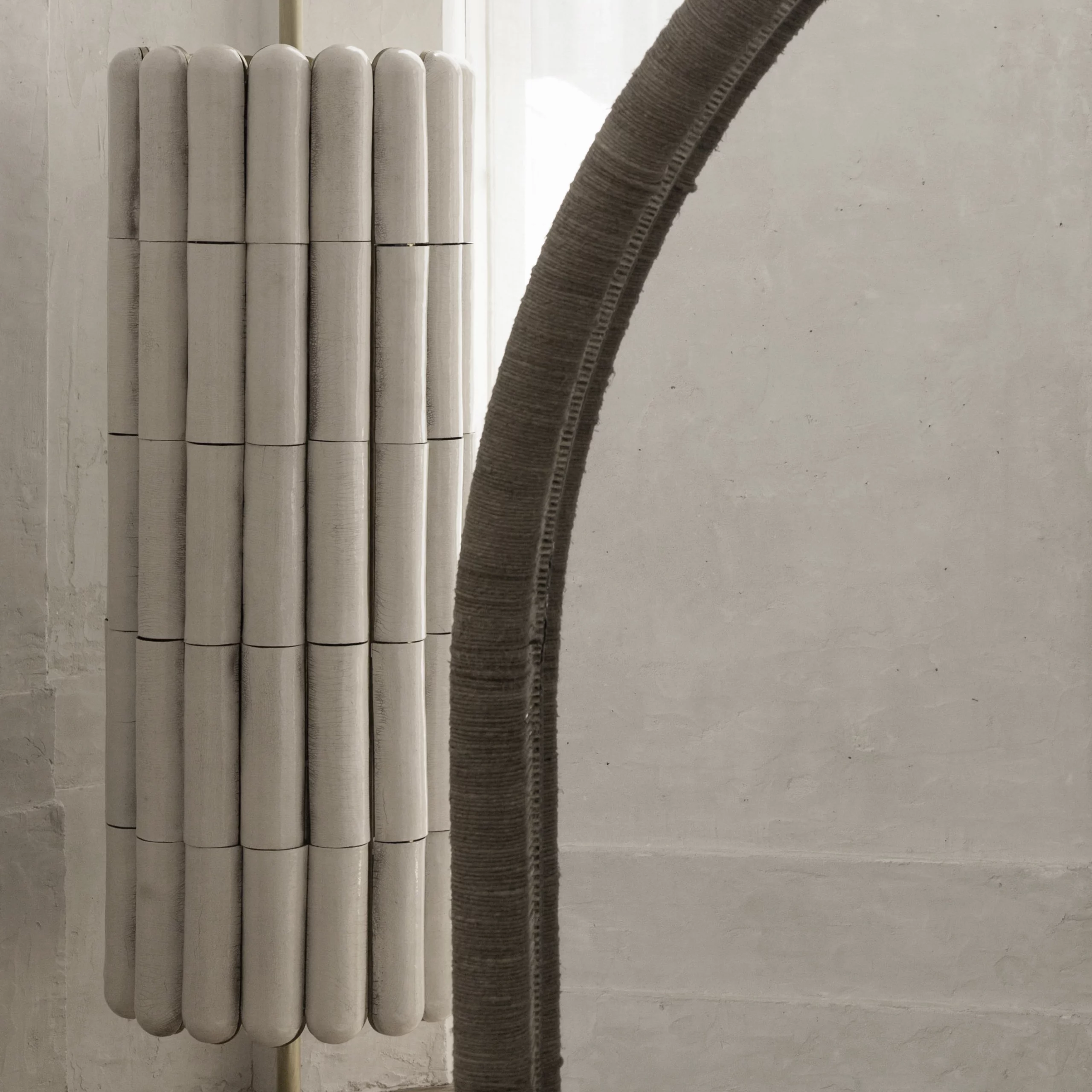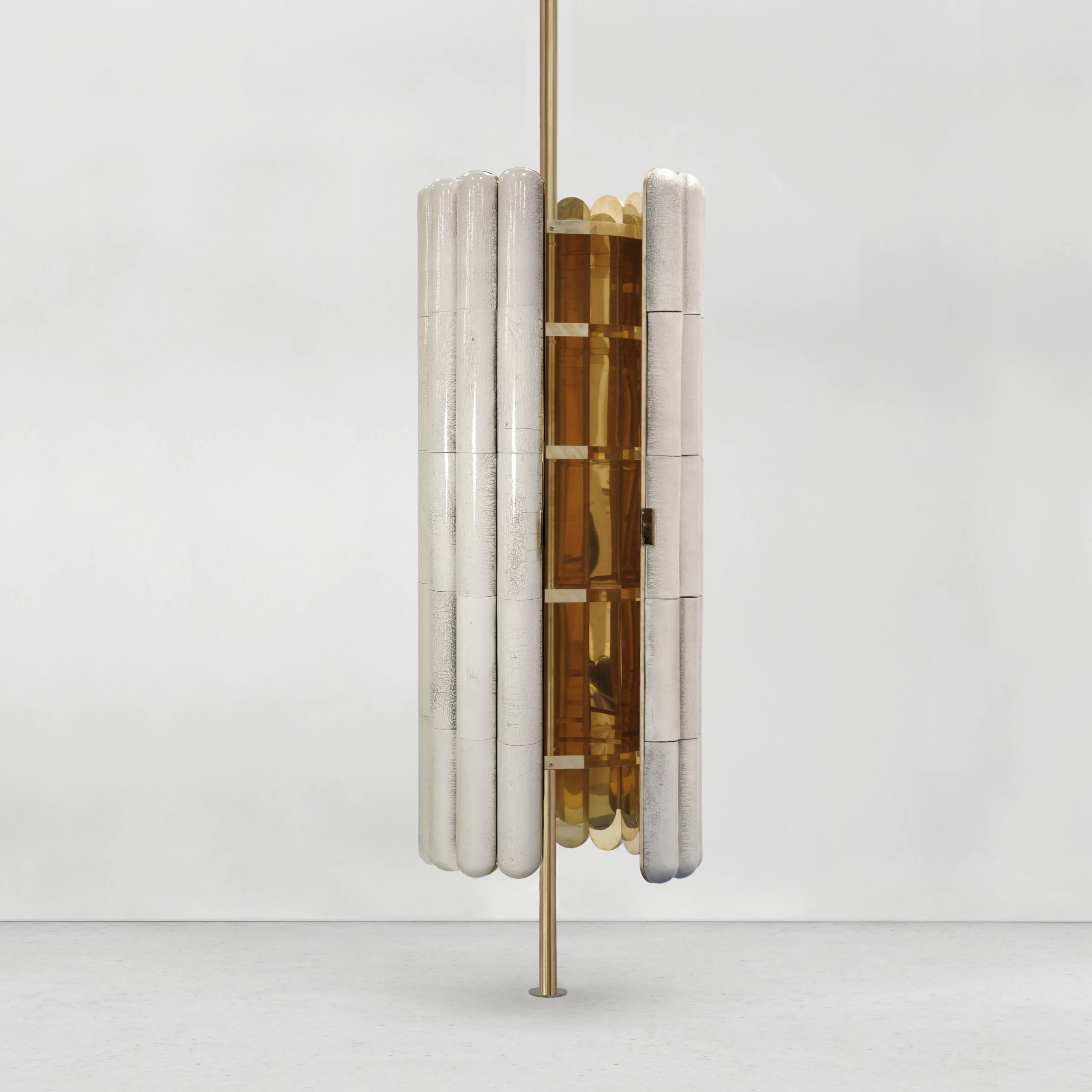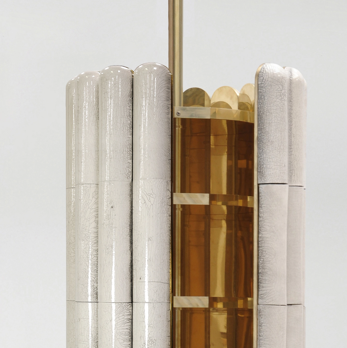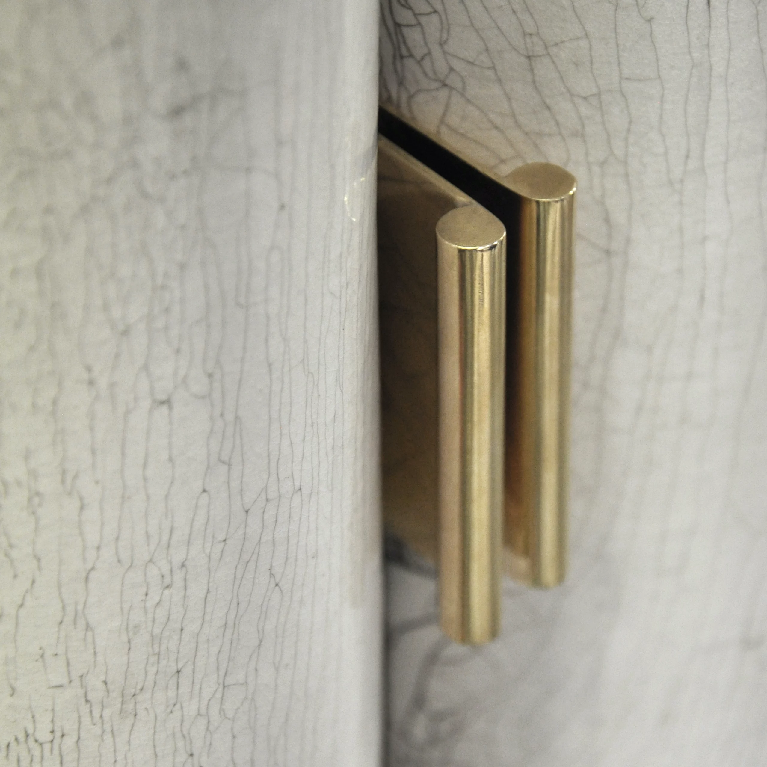 The RAKU-YAKI collection consists of bold and ambitious pieces. The tiles adorning the furniture and lighting fixtures are crafted using Raku, an ancient Japanese ceramic technique. The thermal shock creates cracks in the glaze and reveals subtle black lines, forming random patterns like a landscape seen from above. This technique makes each piece unique, showcasing the power and magic of handcrafted materials in lighting, tables, sideboards, and bar or wall cabinets. These pieces exude a subtle refinement, both in their design and in the aura of the material.
