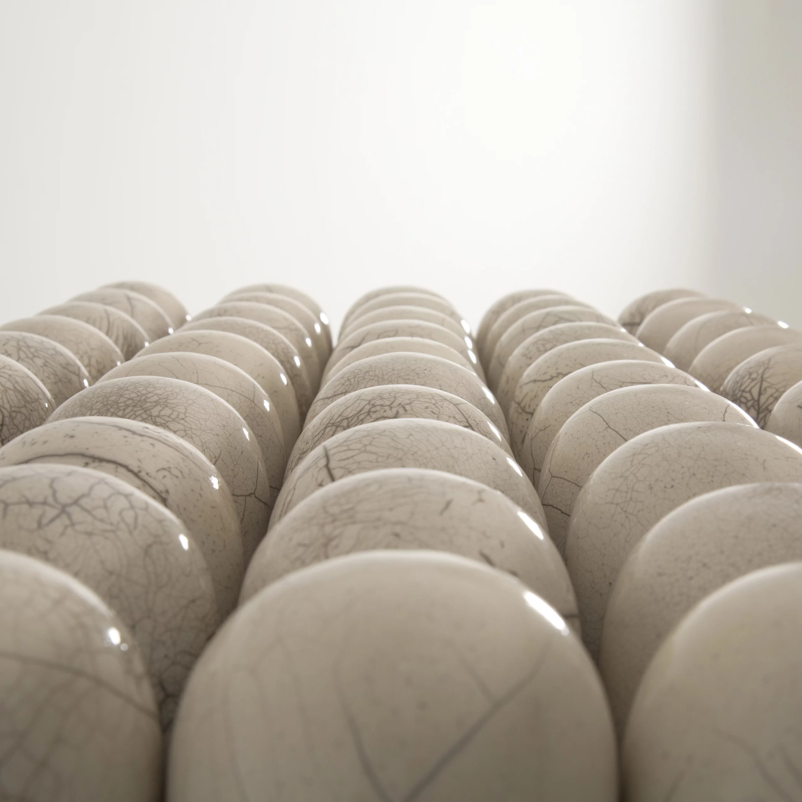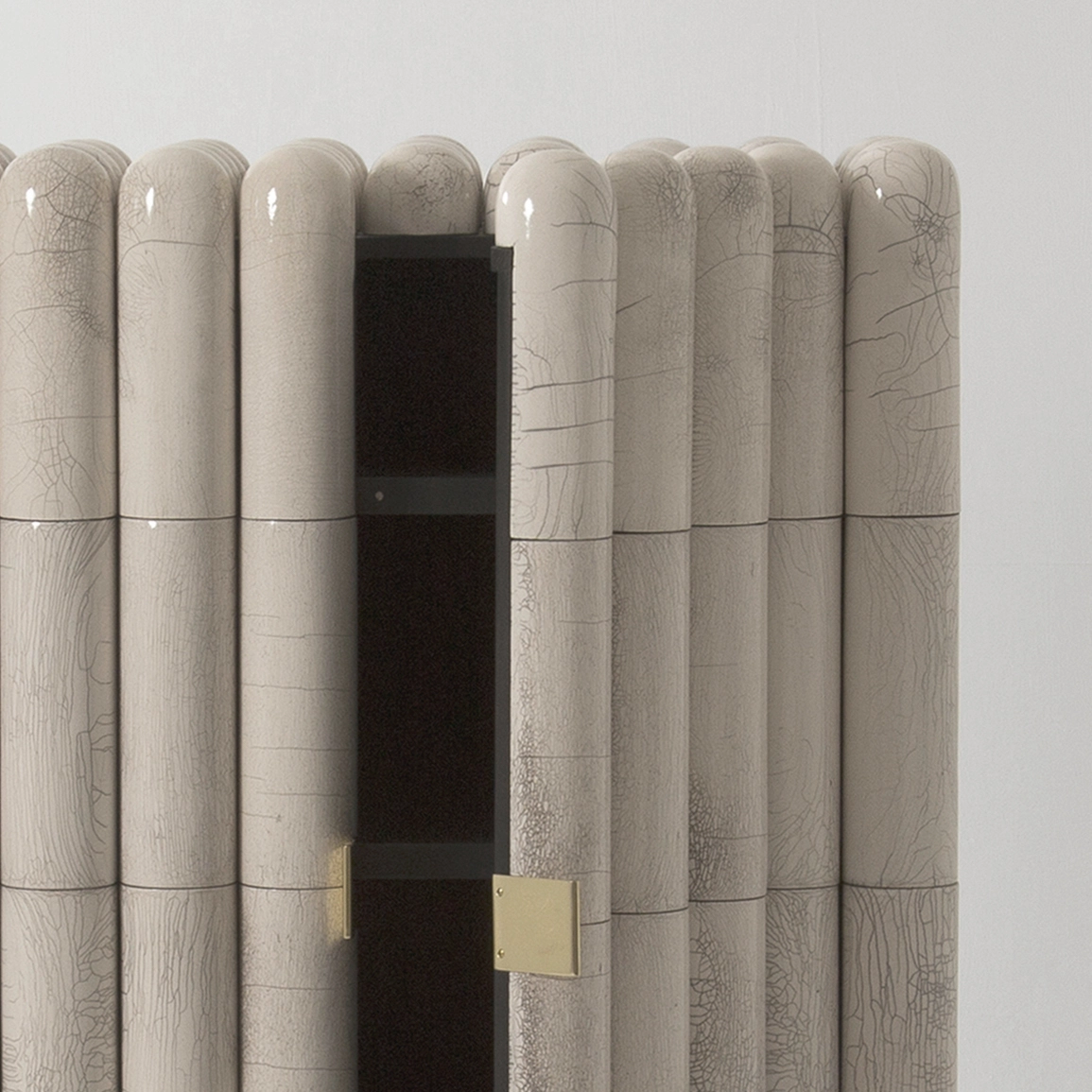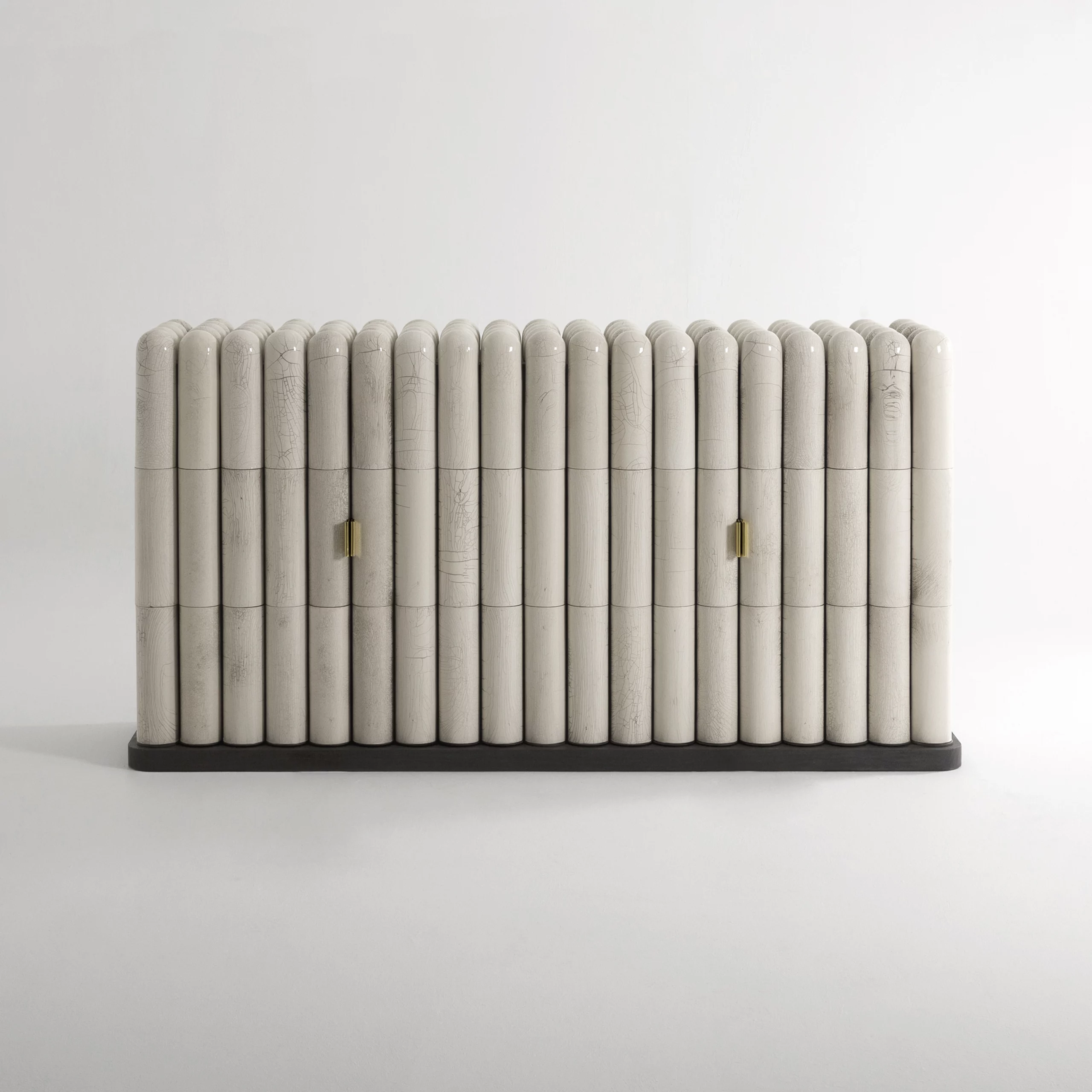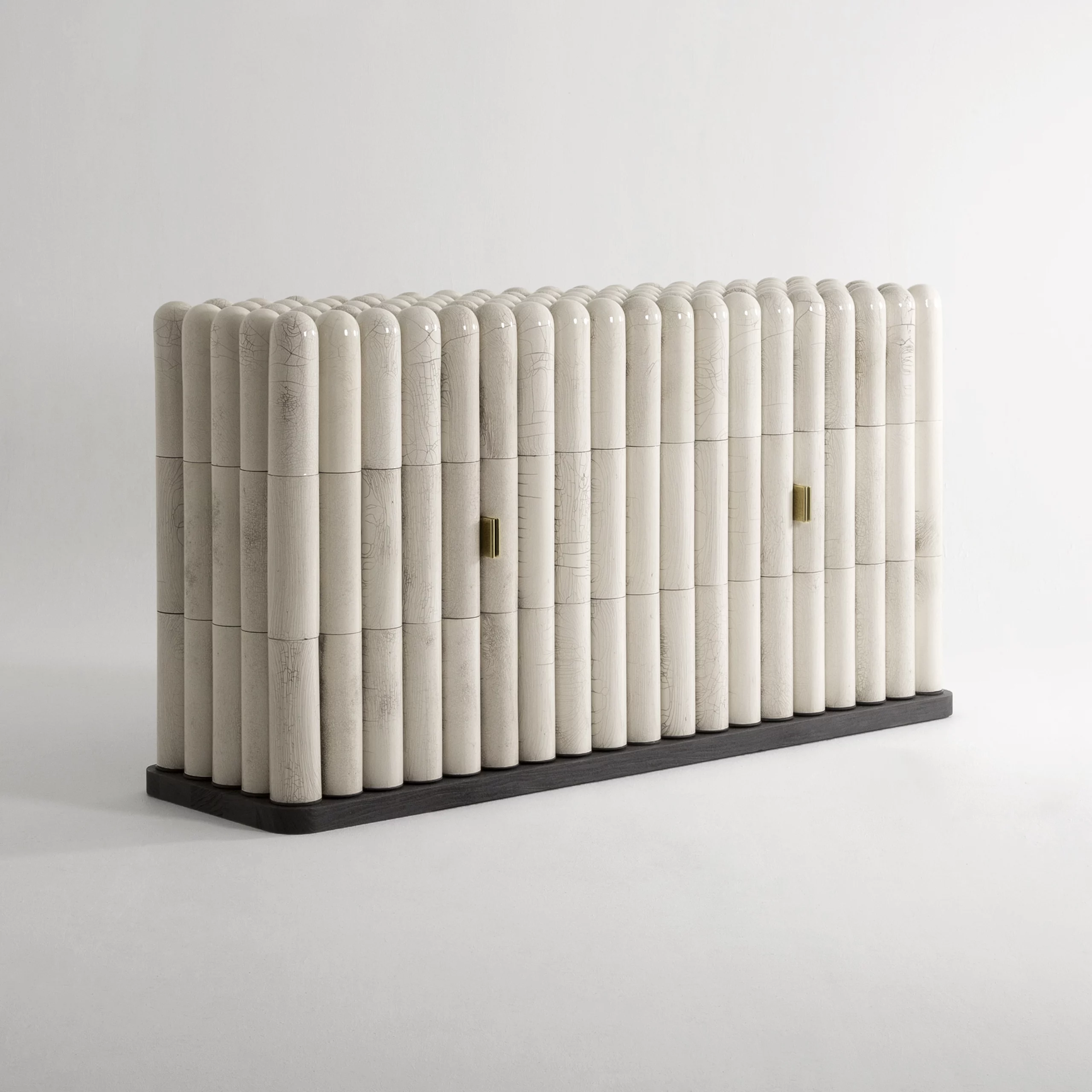 The RAKU-YAKI collection consists of bold and ambitious pieces. The tiles adorning the furniture and lighting fixtures are crafted using Raku, an ancient Japanese ceramic technique. The thermal shock creates cracks in the glaze and reveals subtle black lines, forming random patterns like a landscape seen from above. This technique makes each piece unique, showcasing the power and magic of handcrafted materials in lighting, tables, sideboards, and bar or wall cabinets. These pieces exude a subtle refinement, both in their design and in the aura of the material.