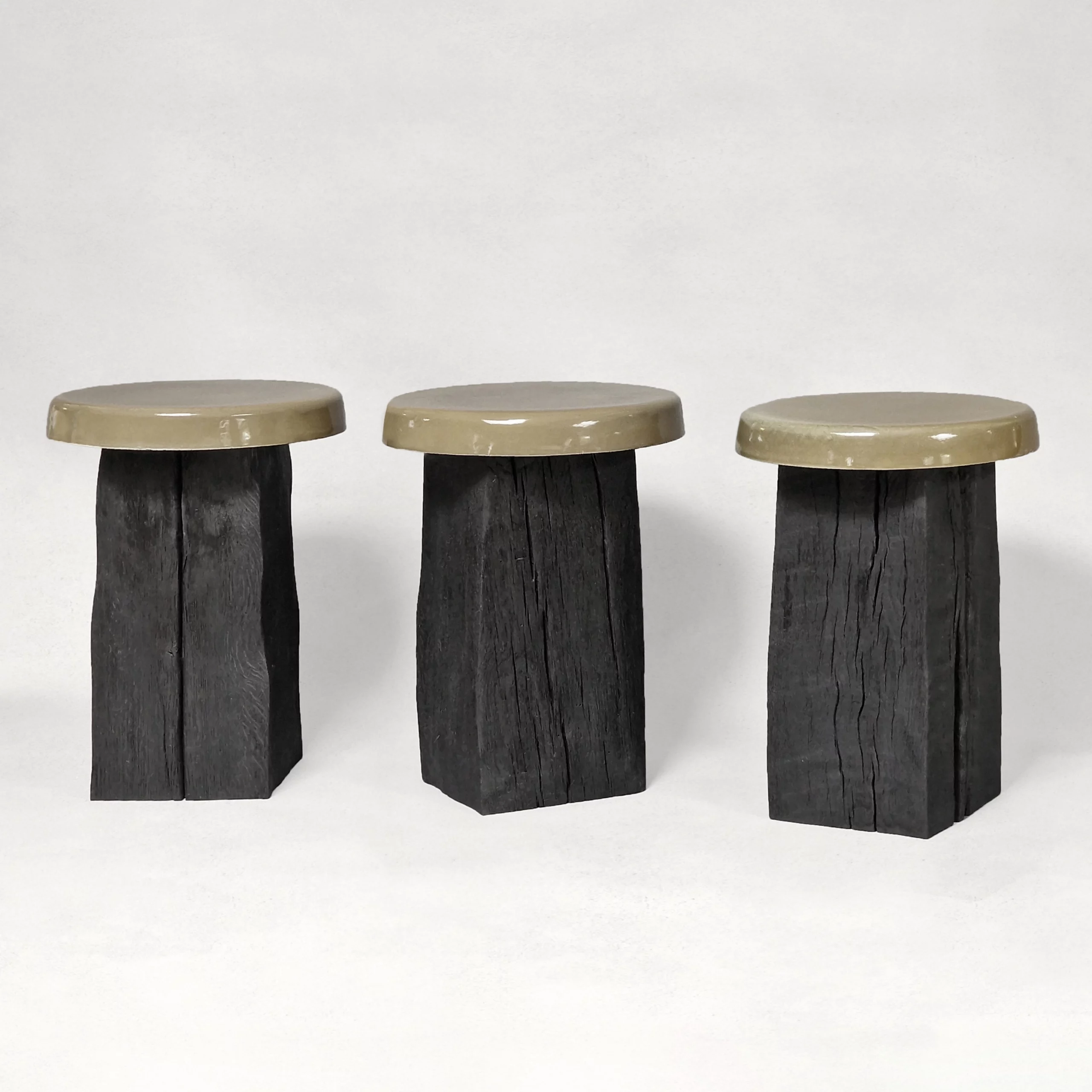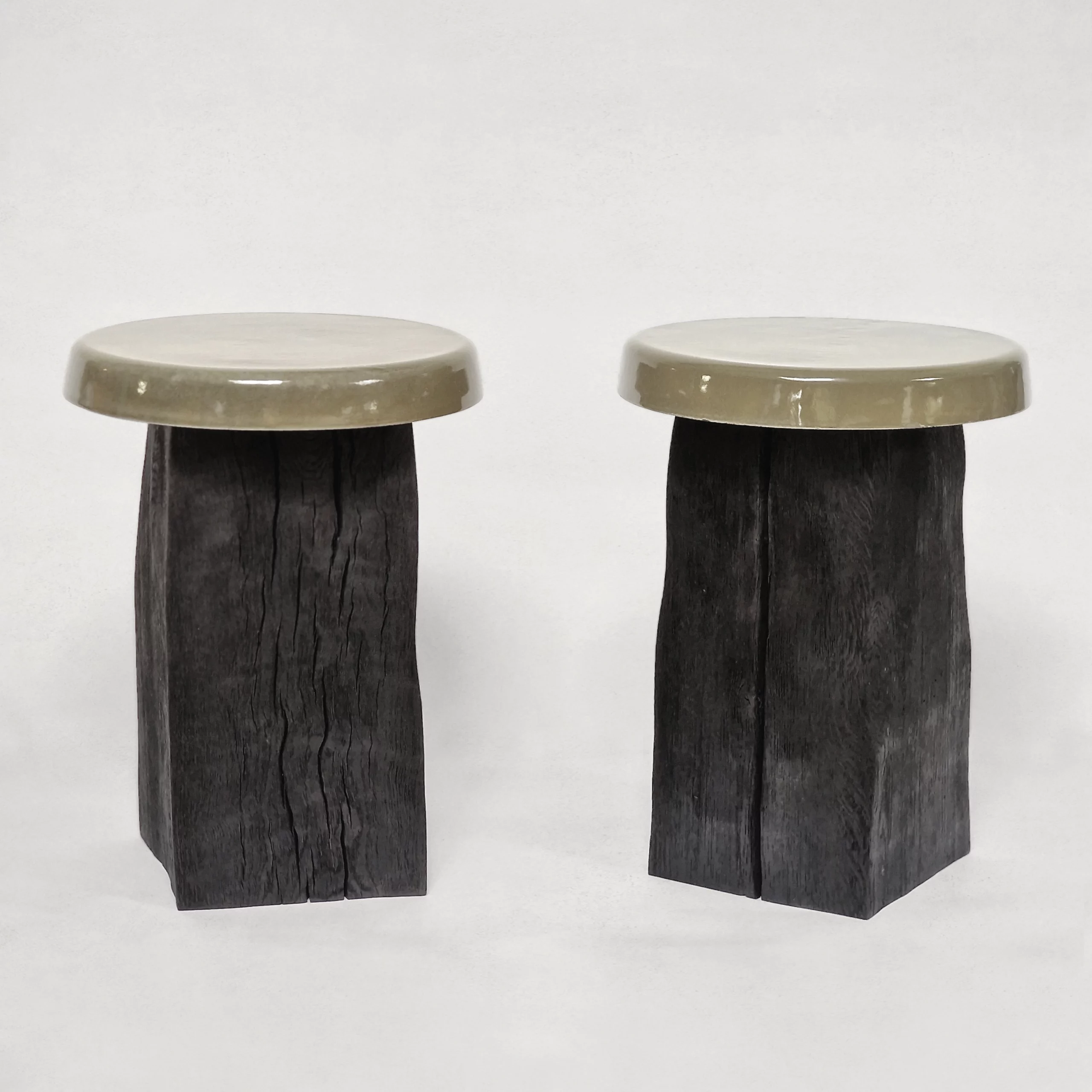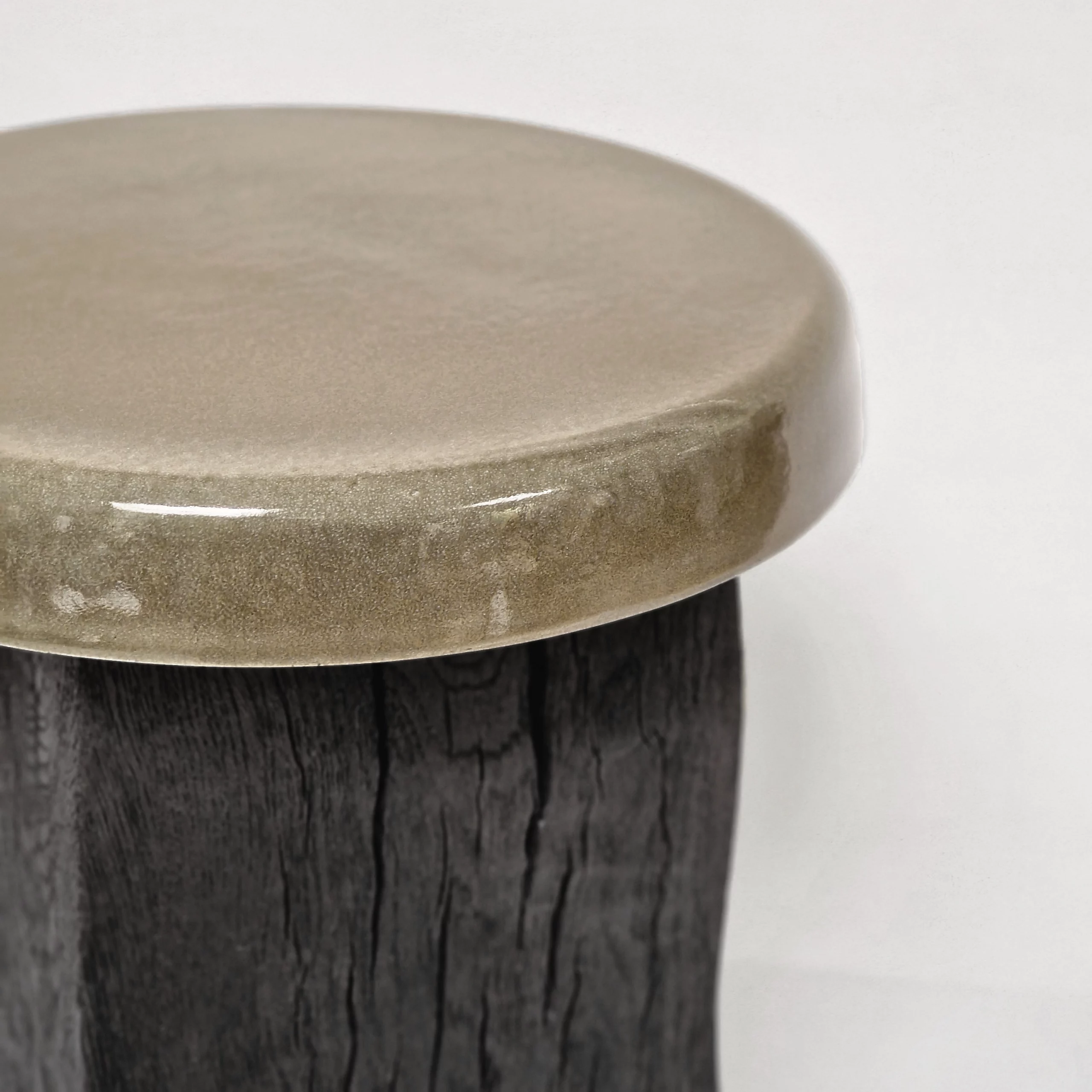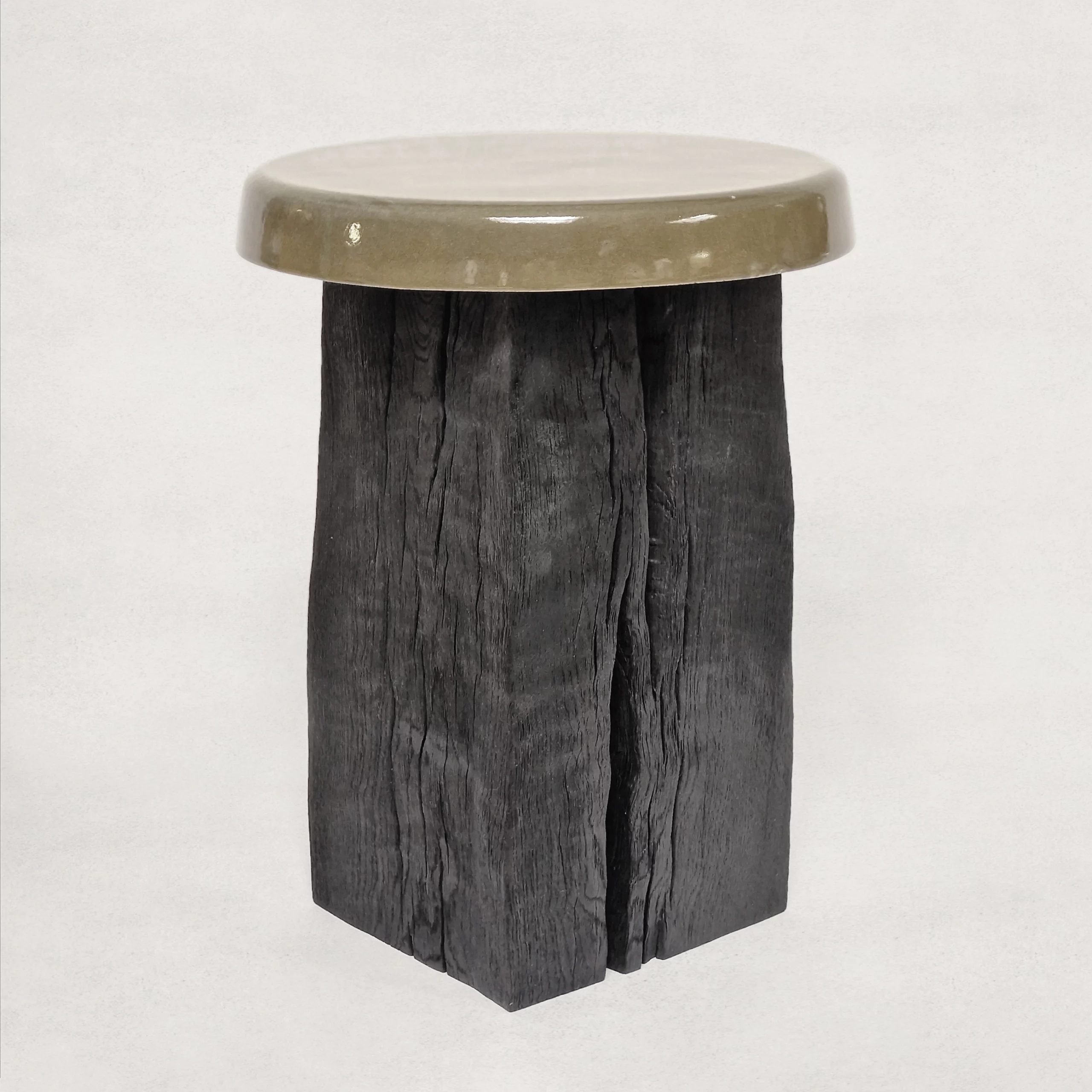 Unique side table sculpted in blackened solid wood, with a ceramic top.