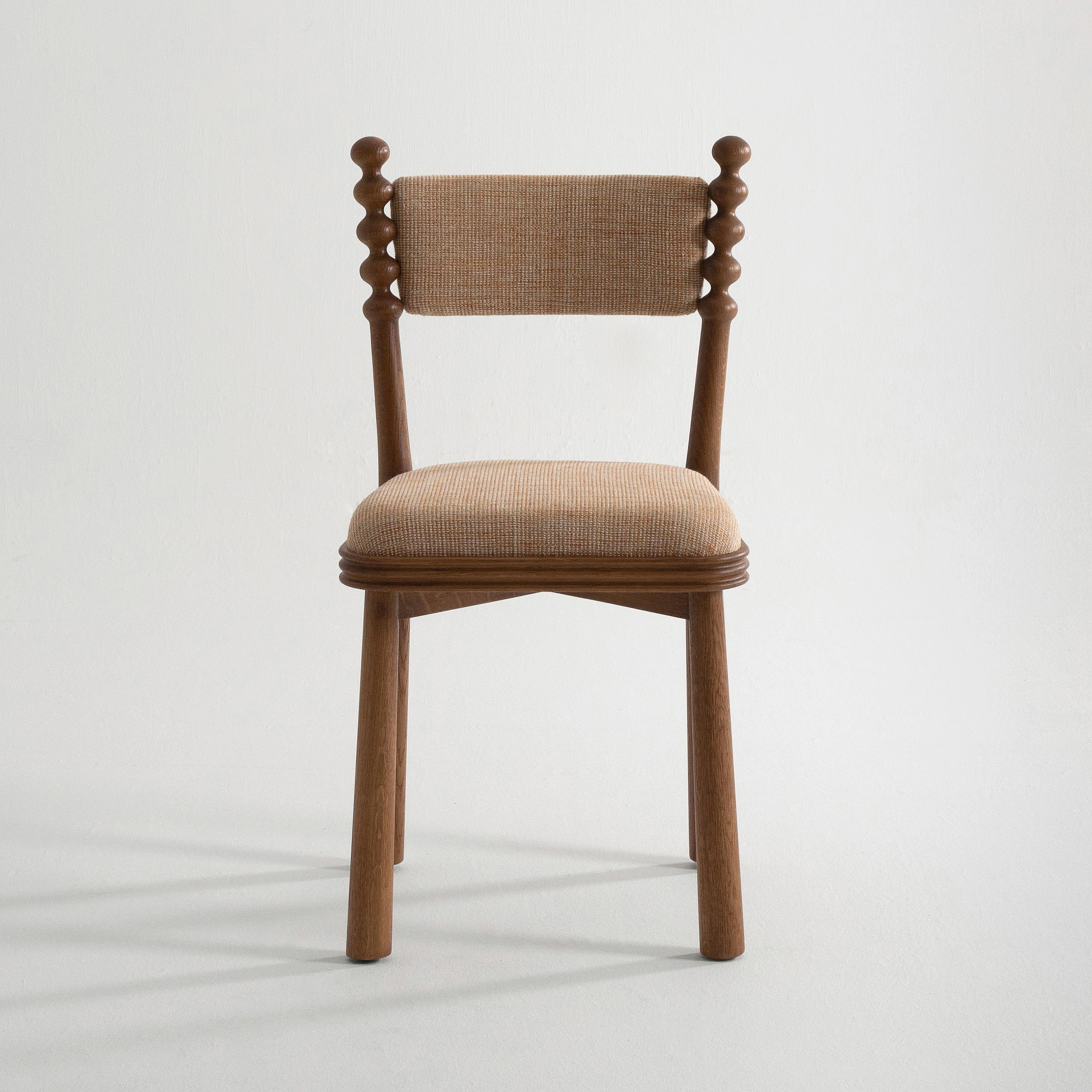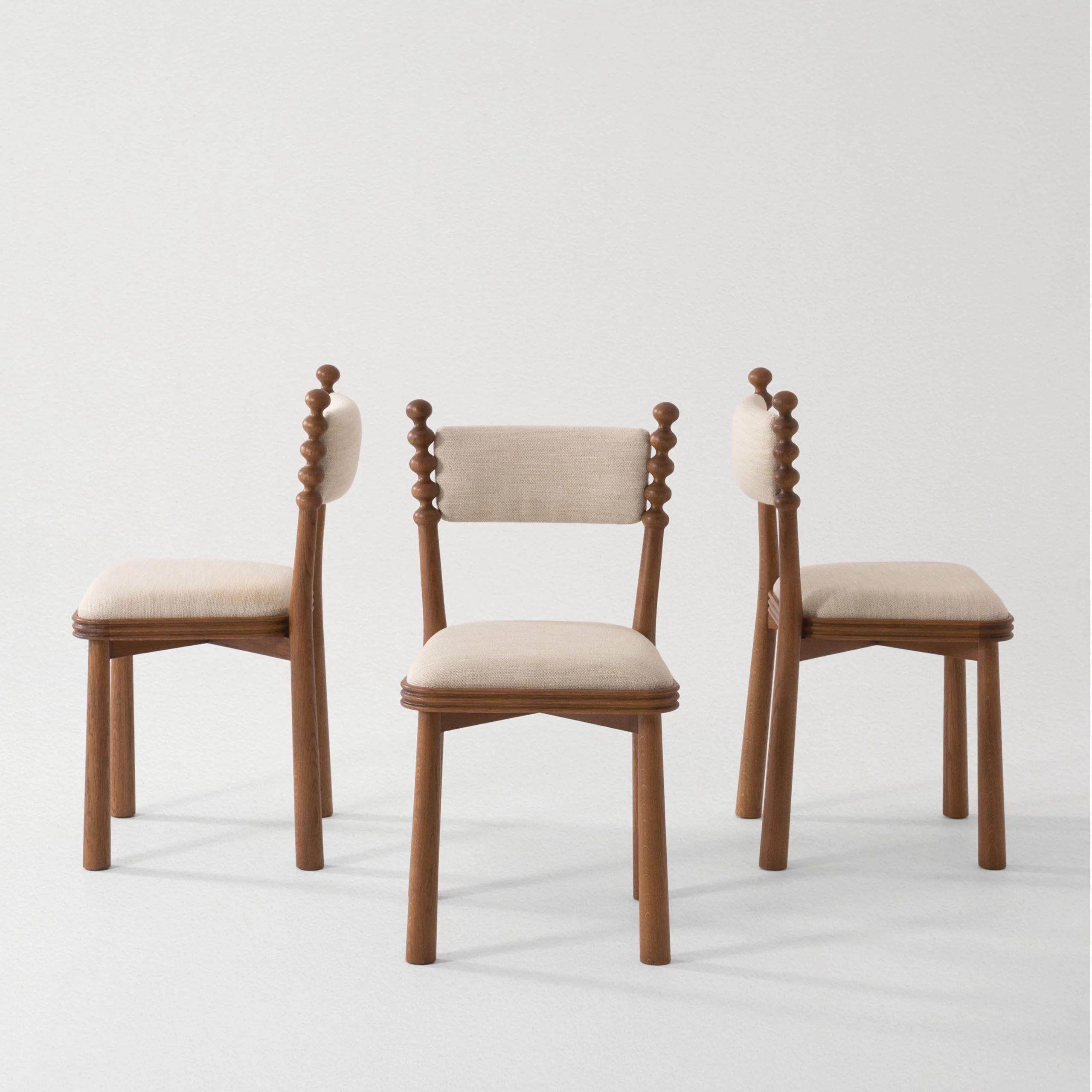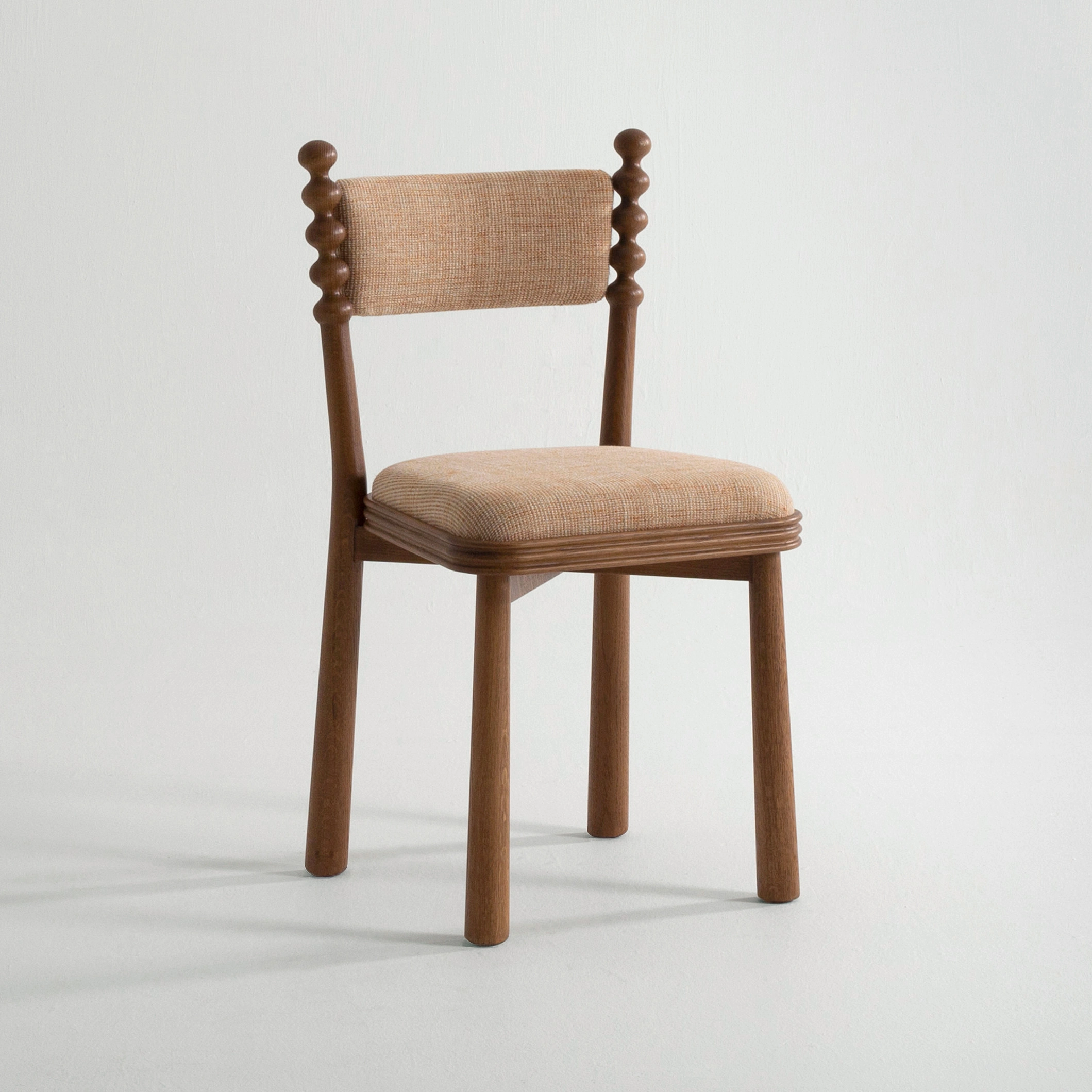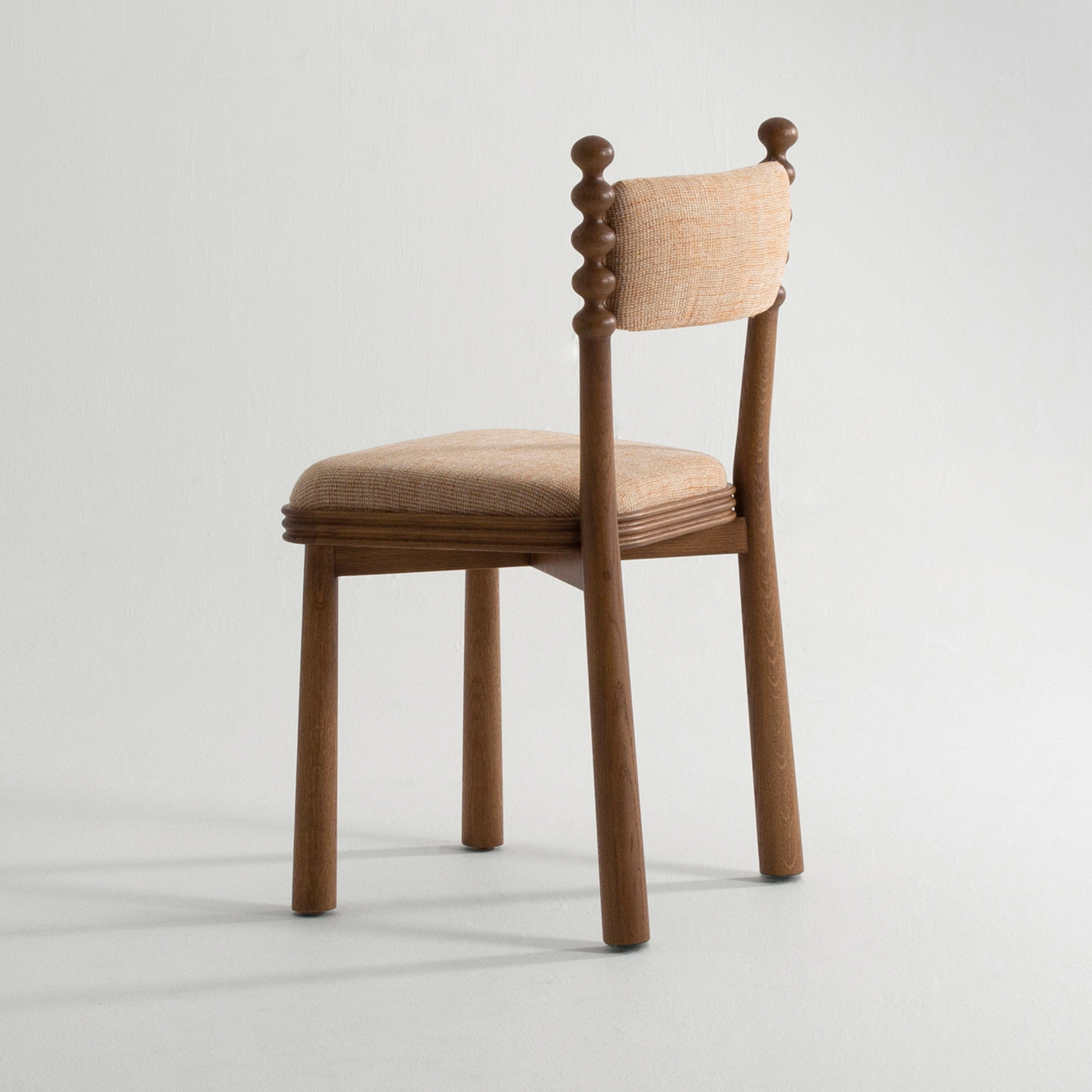 The TAMA chair, meaning ‘ball’ in Japanese, exudes a distinct personality with its base topped by turned wooden balls. Its upholstered seat, combined with a fluted wooden frame, blends comfort and elegance.