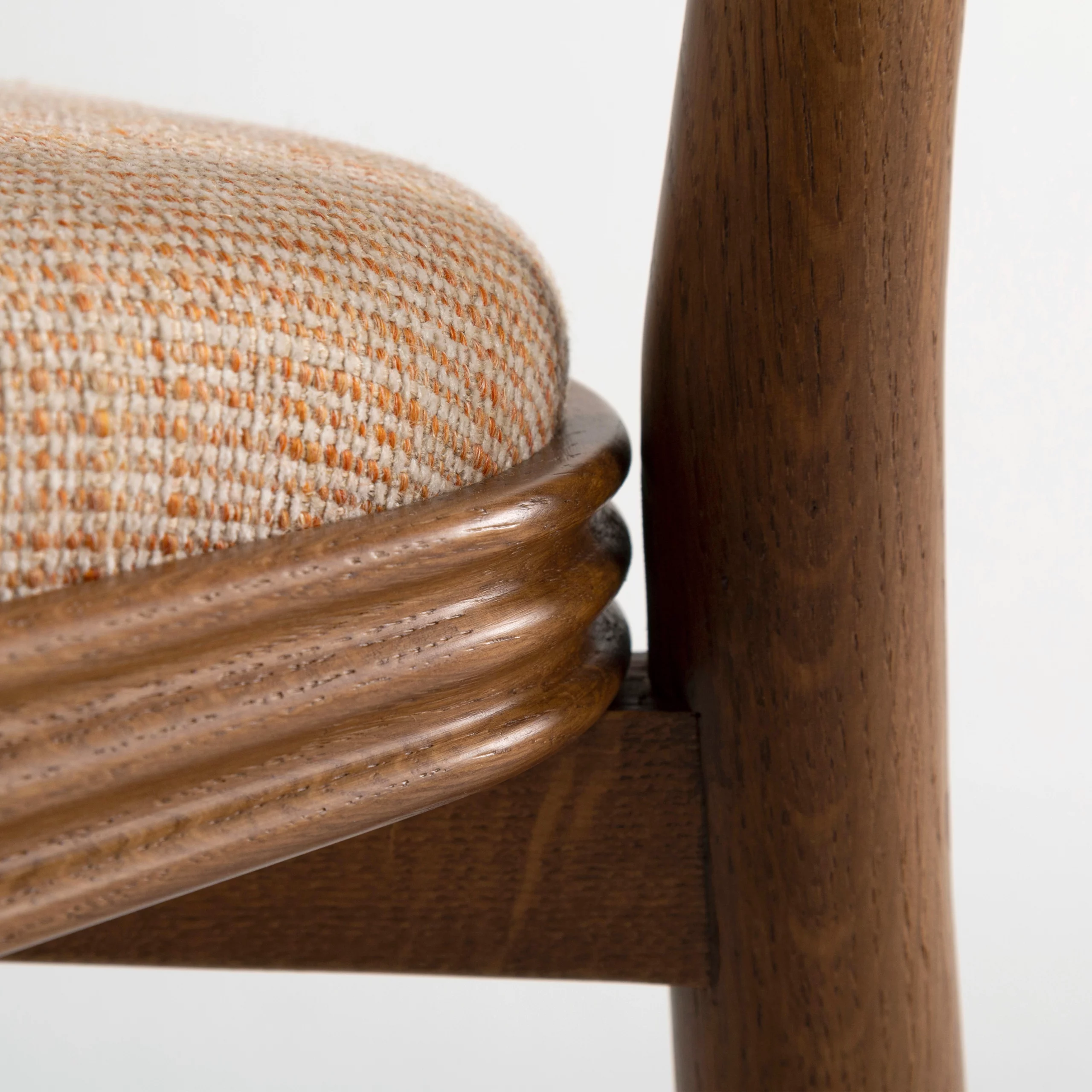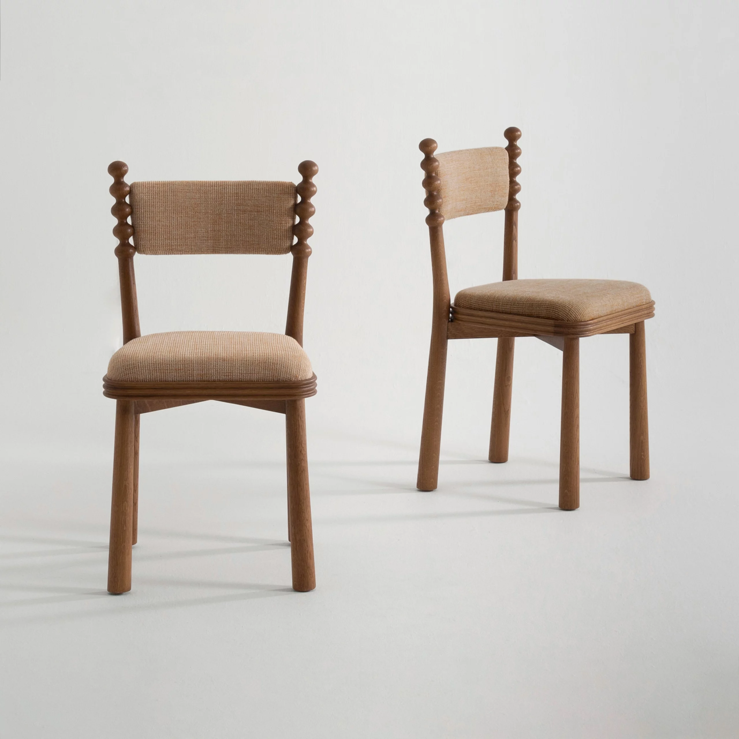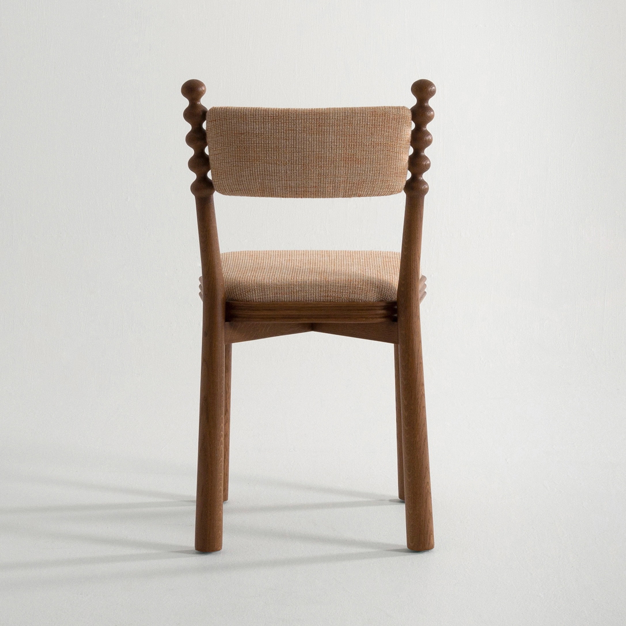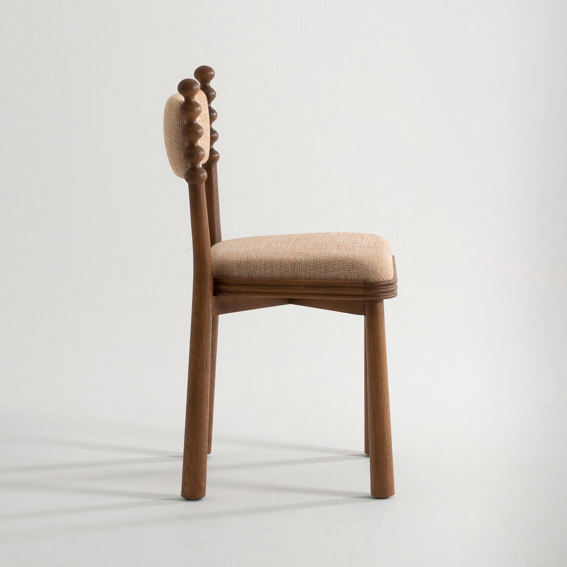The TAMA chair, meaning ‘ball’ in Japanese, exudes a distinct personality with its base topped by turned wooden balls. Its upholstered seat, combined with a fluted wooden frame, blends comfort and elegance.