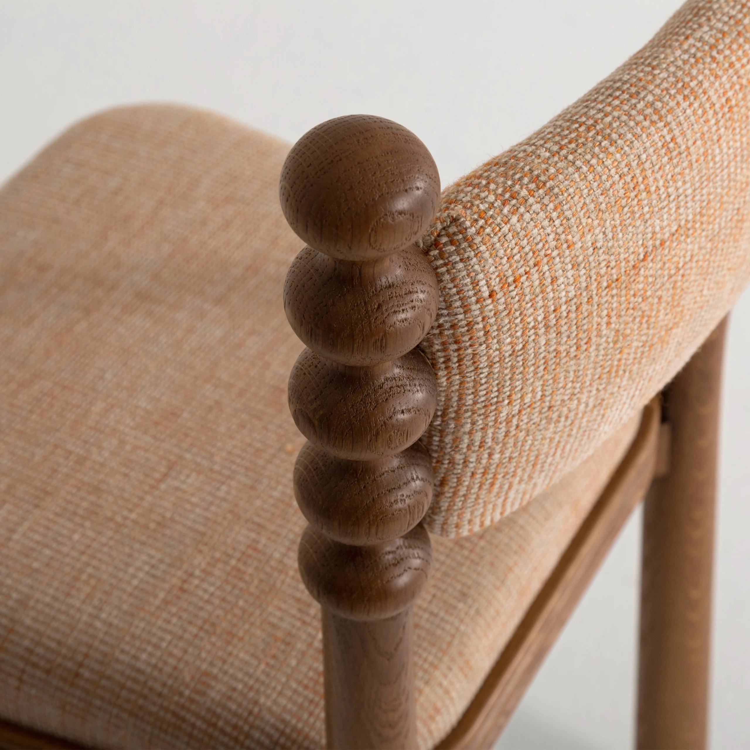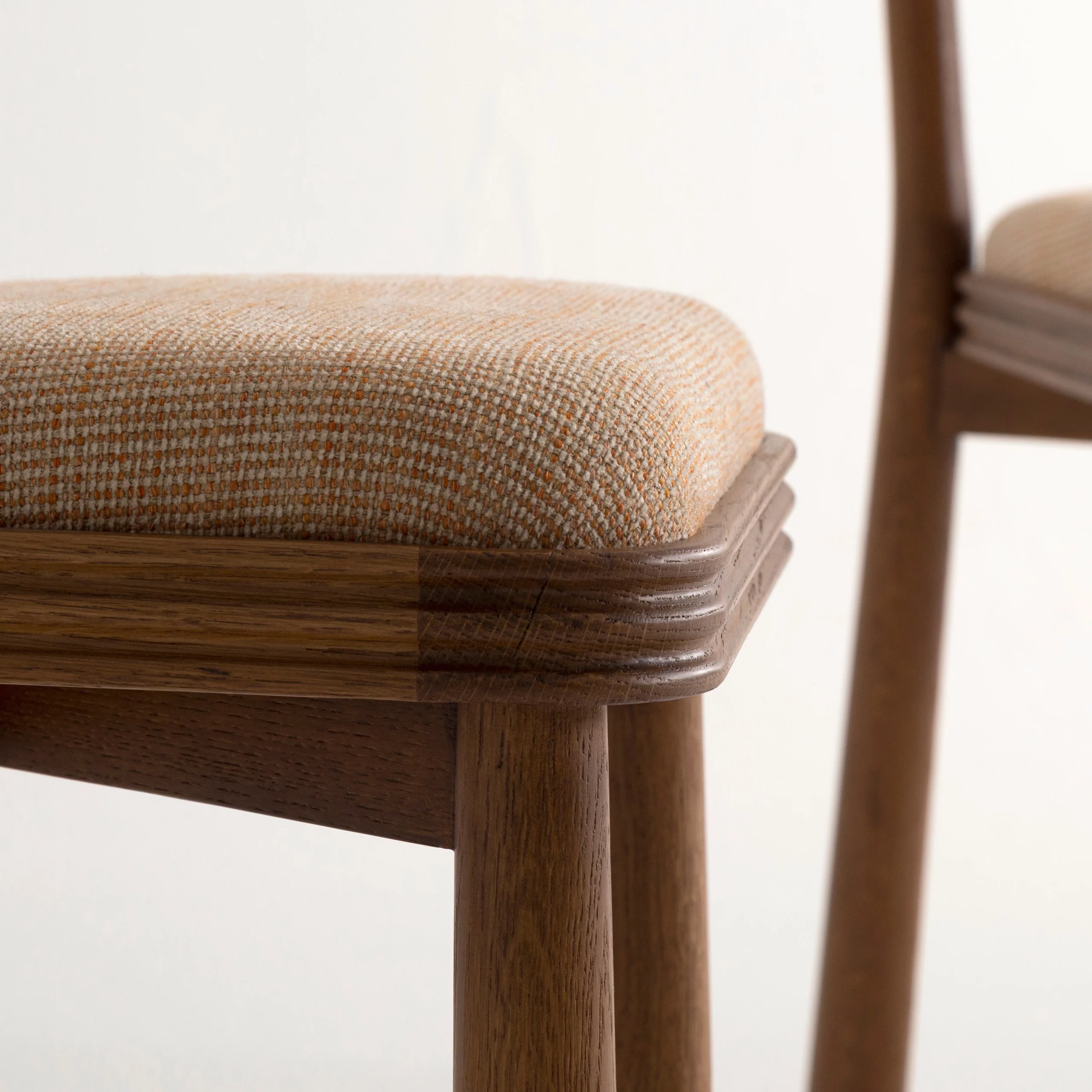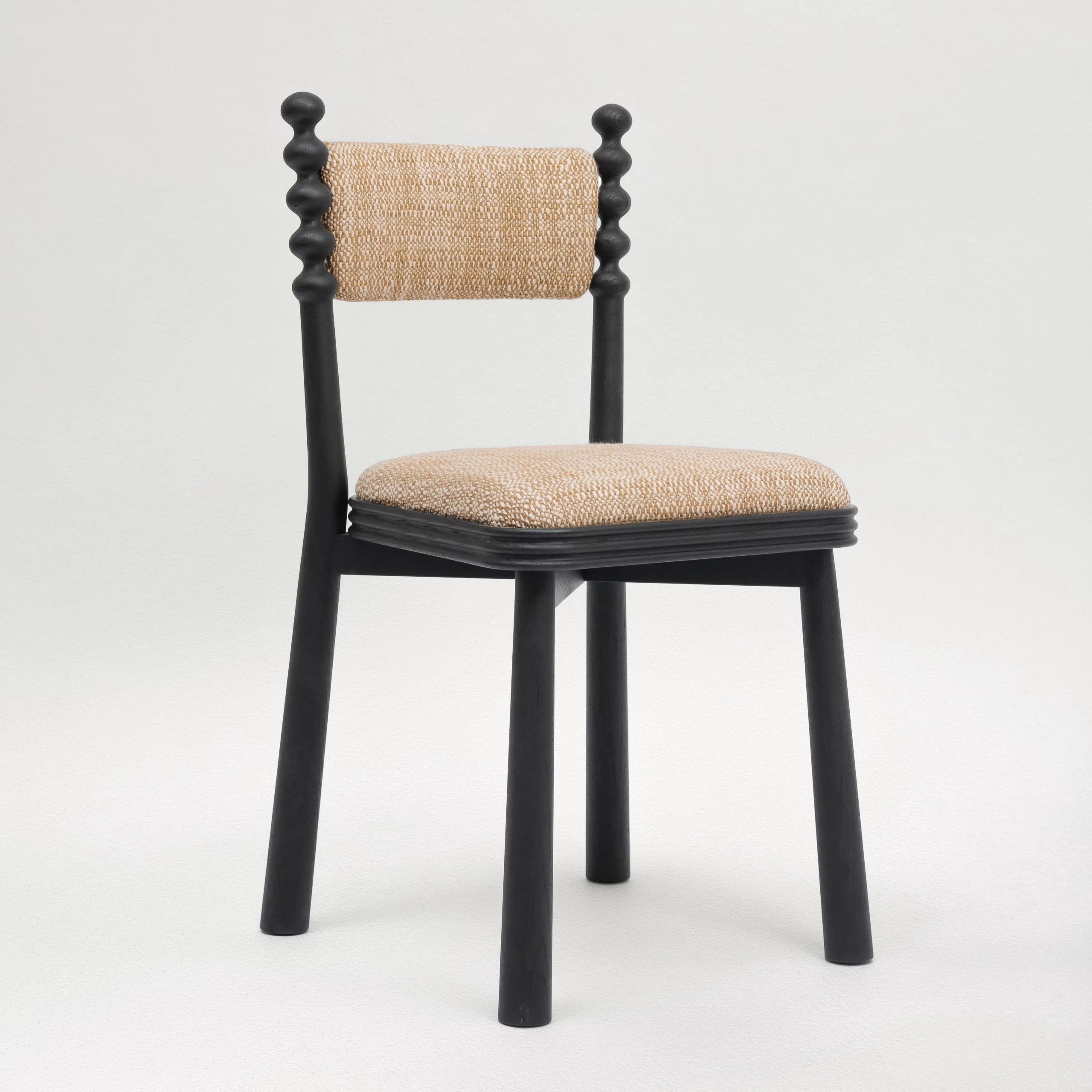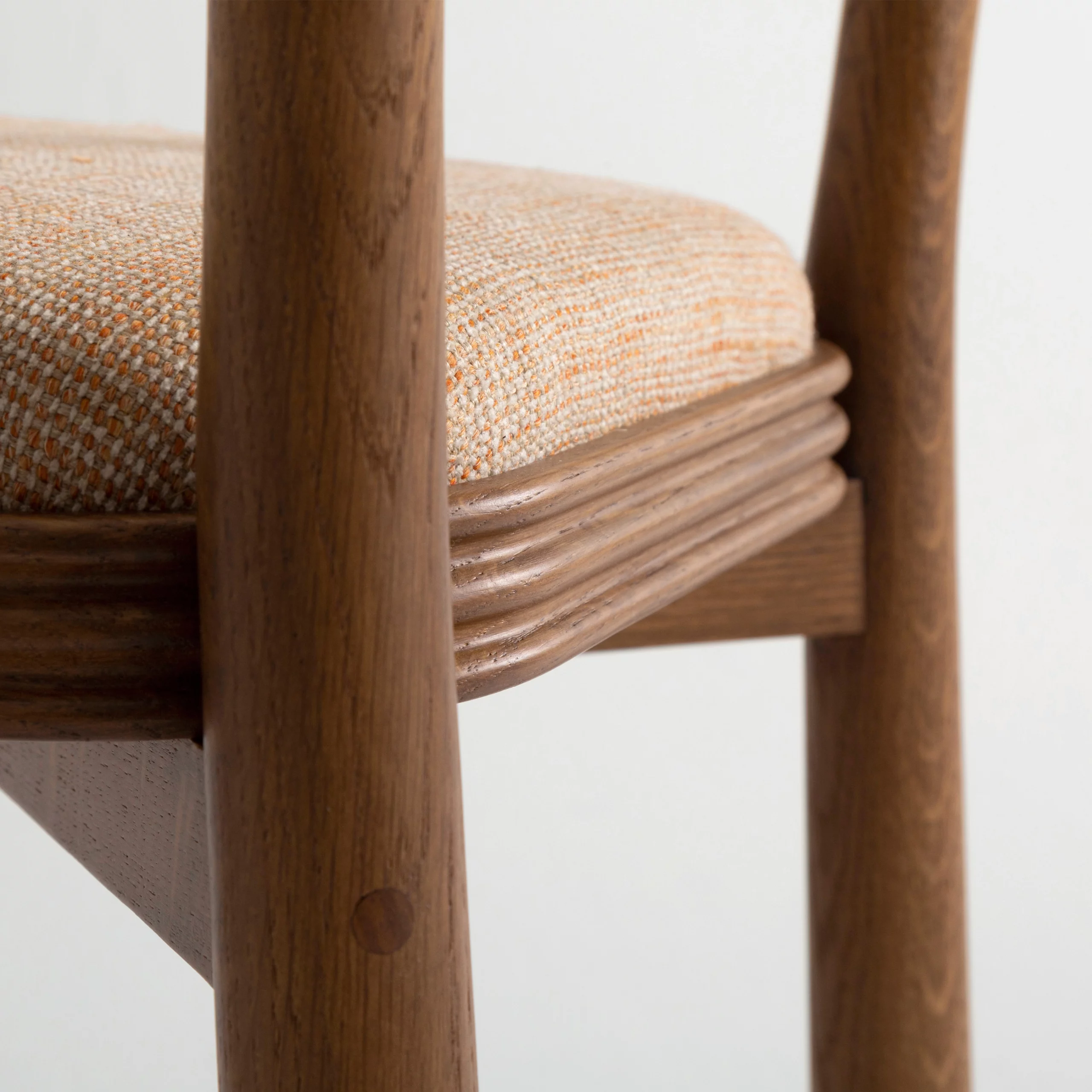 The TAMA chair, meaning ‘ball’ in Japanese, exudes a distinct personality with its base topped by turned wooden balls. Its upholstered seat, combined with a fluted wooden frame, blends comfort and elegance.