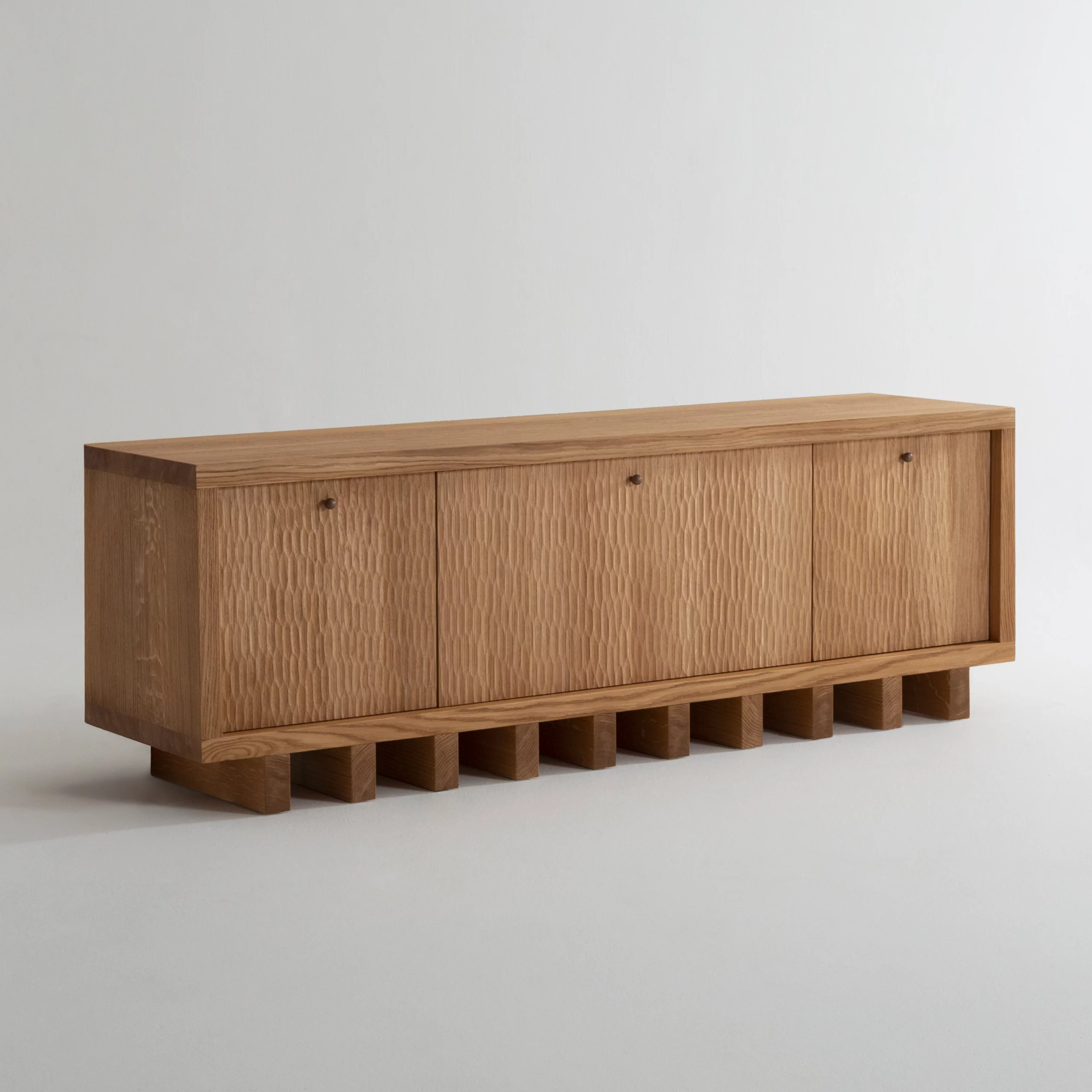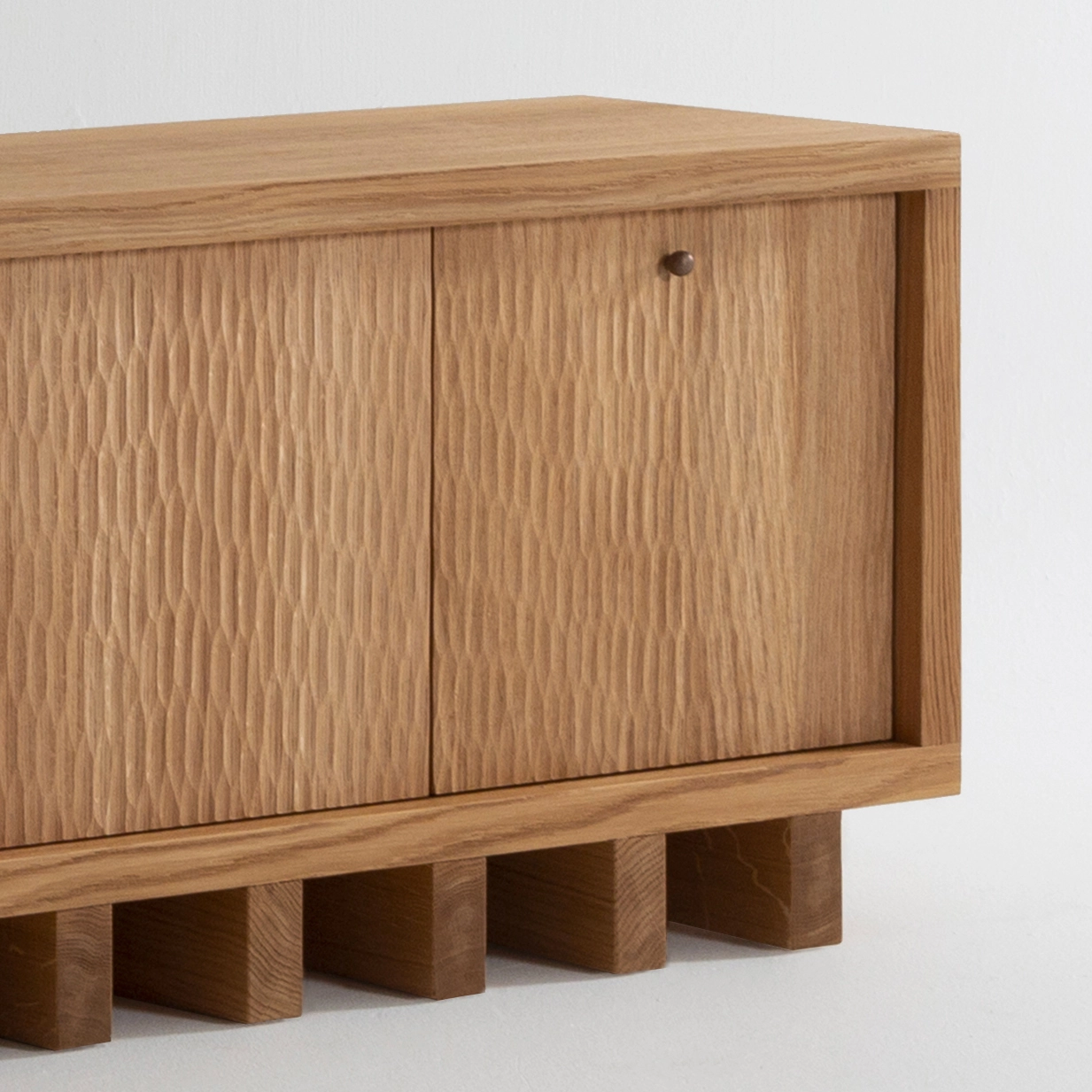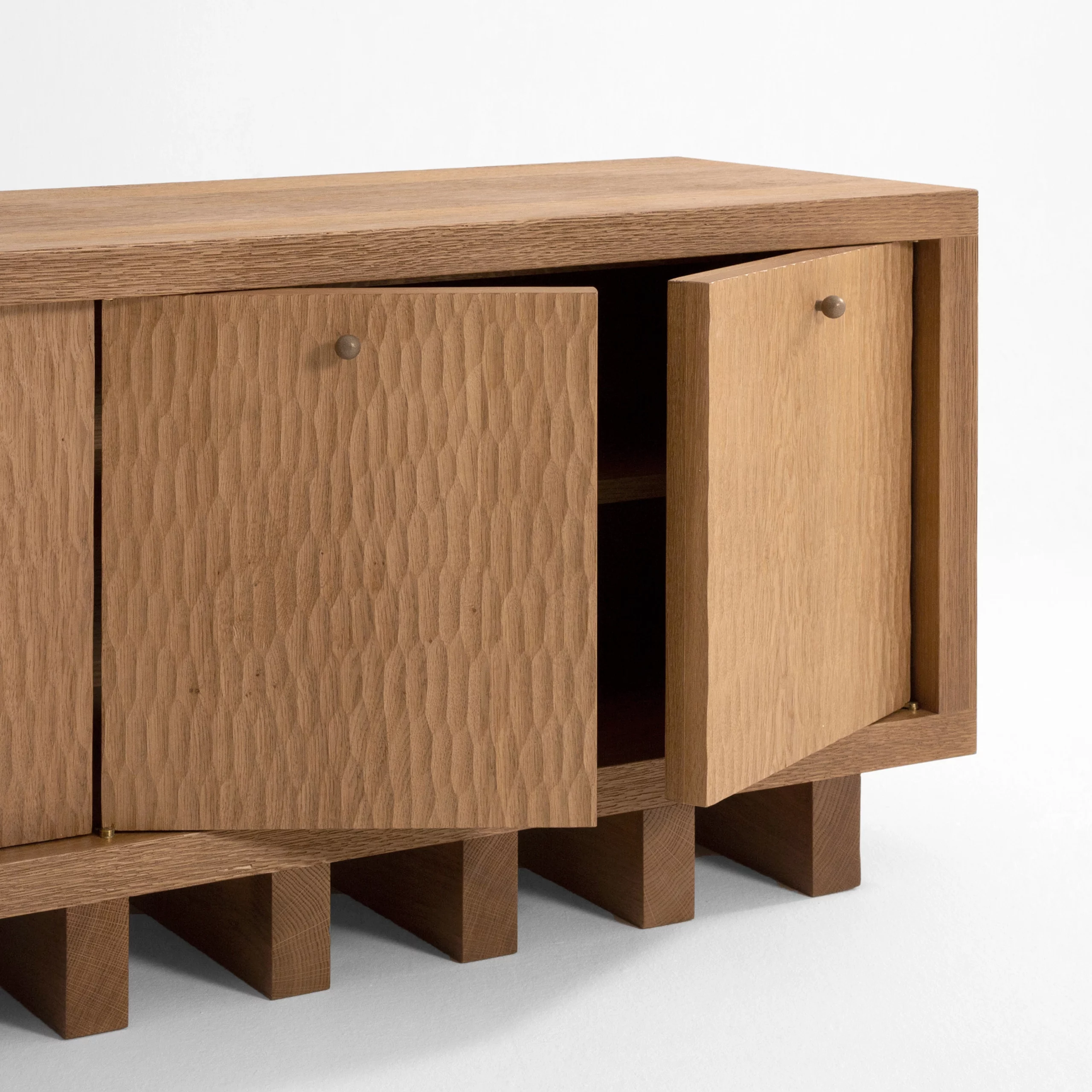 The hand-carved gouged woodwork in the TIGA collection highlights a precious artisanal craftsmanship. These random shapes create vibrations through a play of shadows and light.