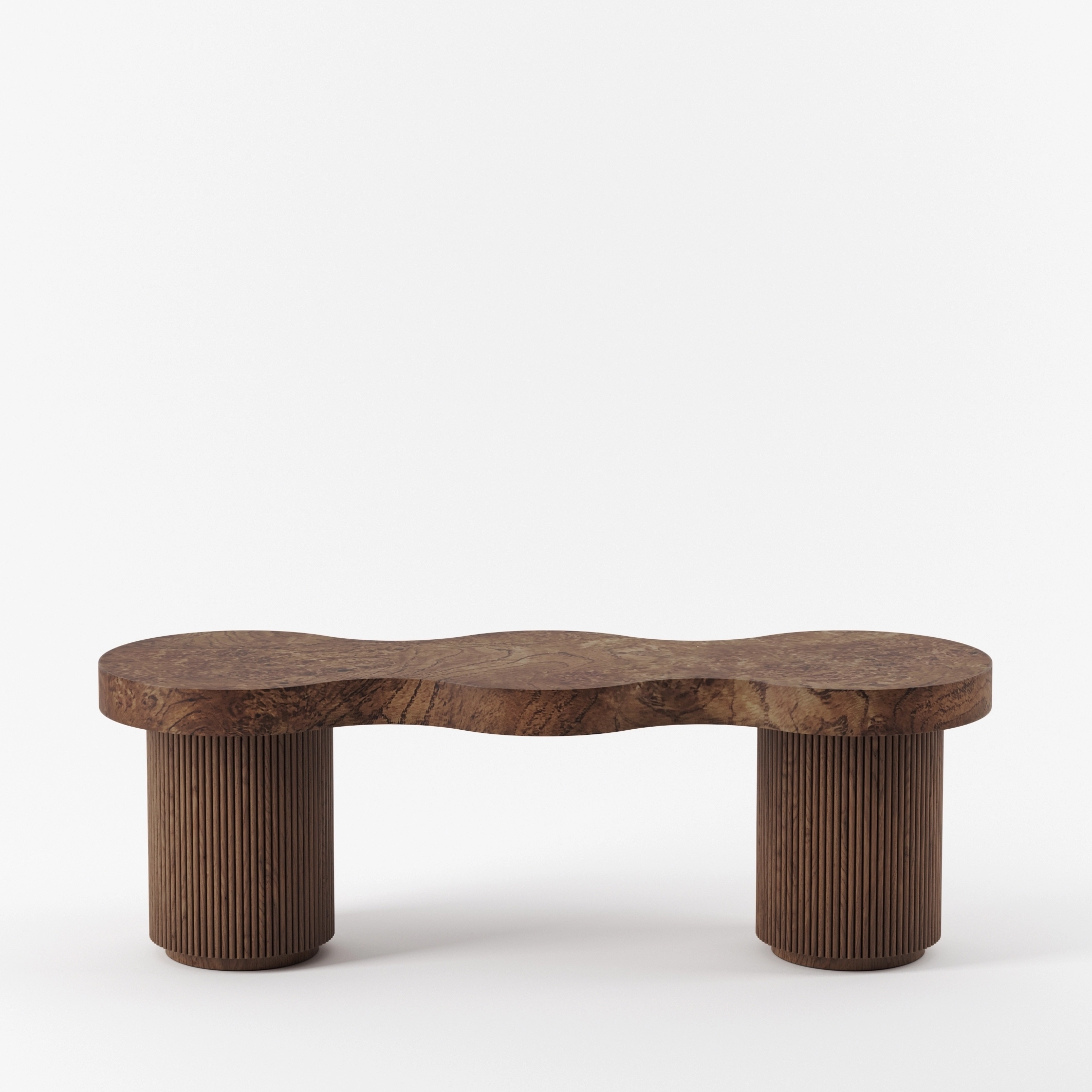 La collection ARY interpelle par ses formes libres et sa virtuosité artisanale. Les ondulations formées par le bois cannelé créent un rythme fluide et confèrent au mobilier toute sa rareté et sa singularité. La loupe de chêne qui habille les plateaux, laisse apparaître des paysages imaginaires et uniques, et anime table, chevet, banc ou enfilade.
