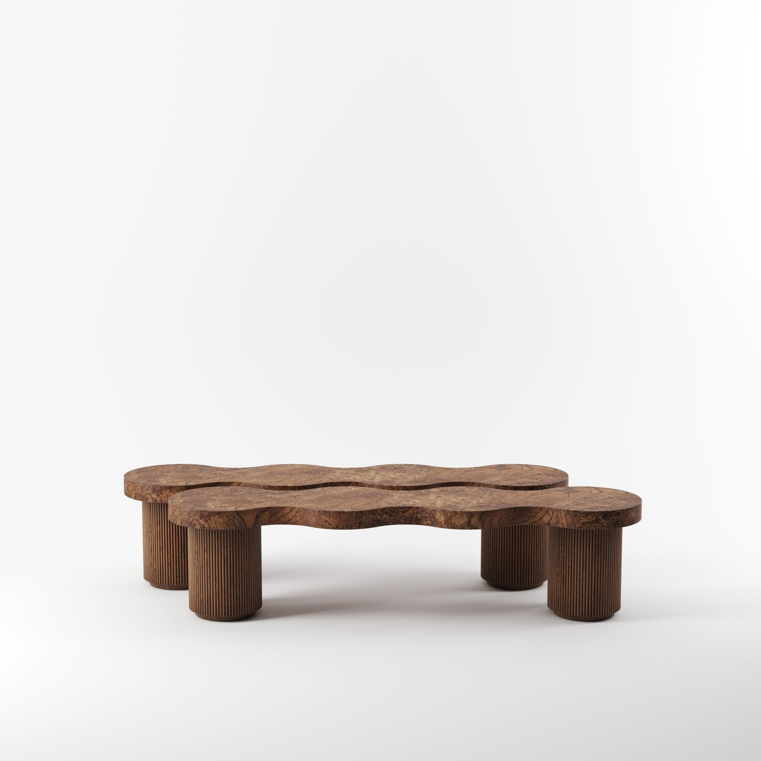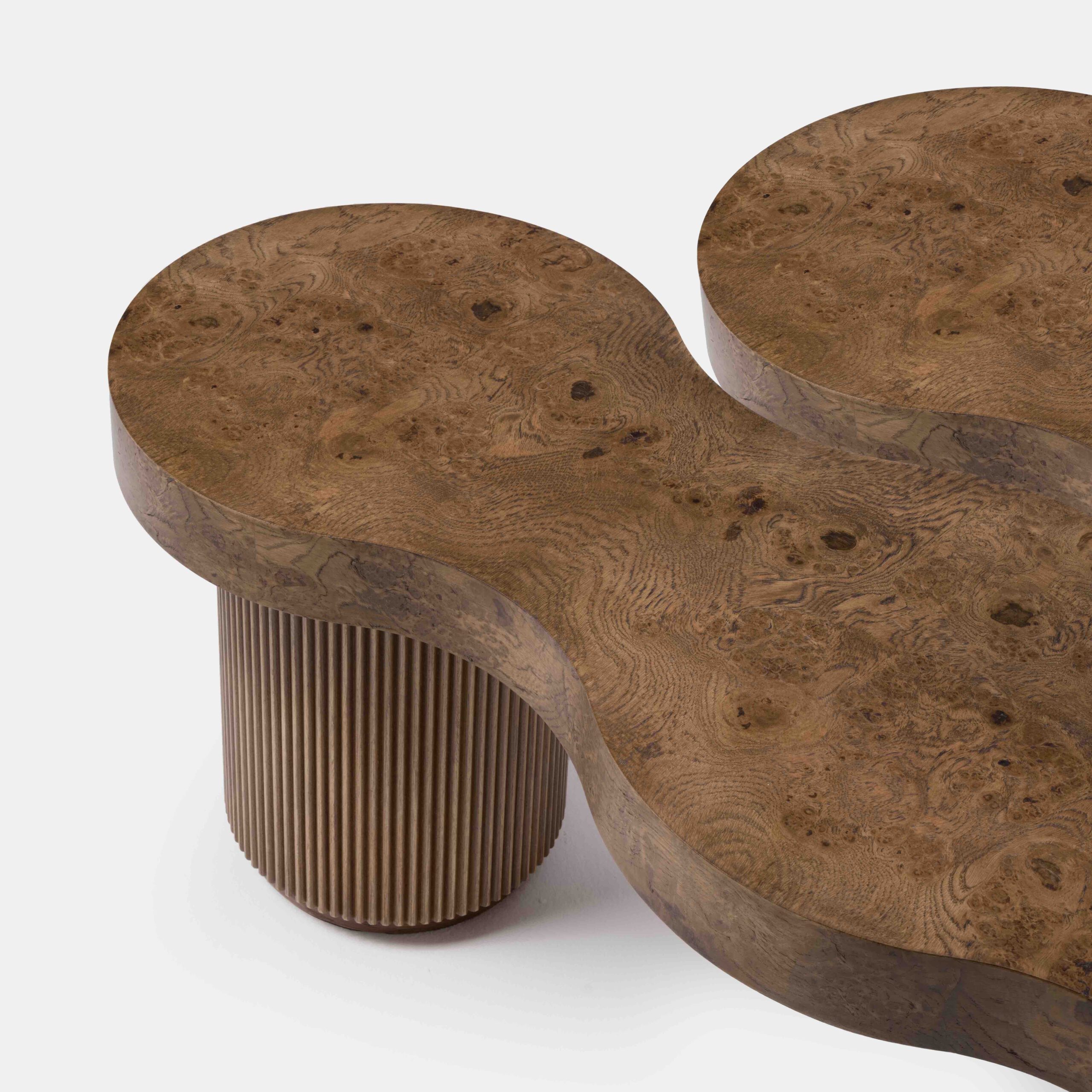 La collection ARY interpelle par ses formes libres et sa virtuosité artisanale. Les ondulations formées par le bois cannelé créent un rythme fluide et confèrent au mobilier toute sa rareté et sa singularité. La loupe de chêne qui habille les plateaux, laisse apparaître des paysages imaginaires et uniques, et anime table, chevet, banc ou enfilade.