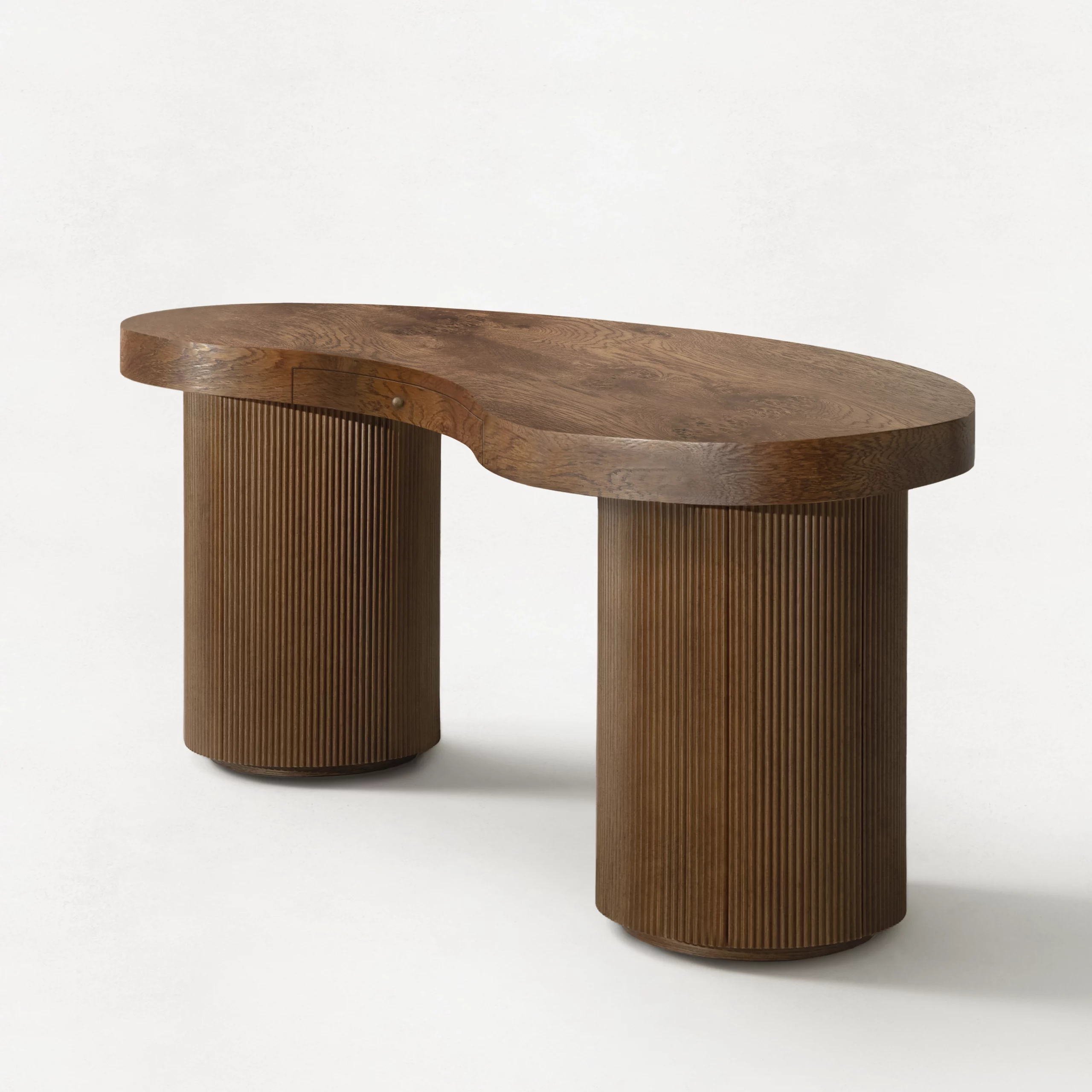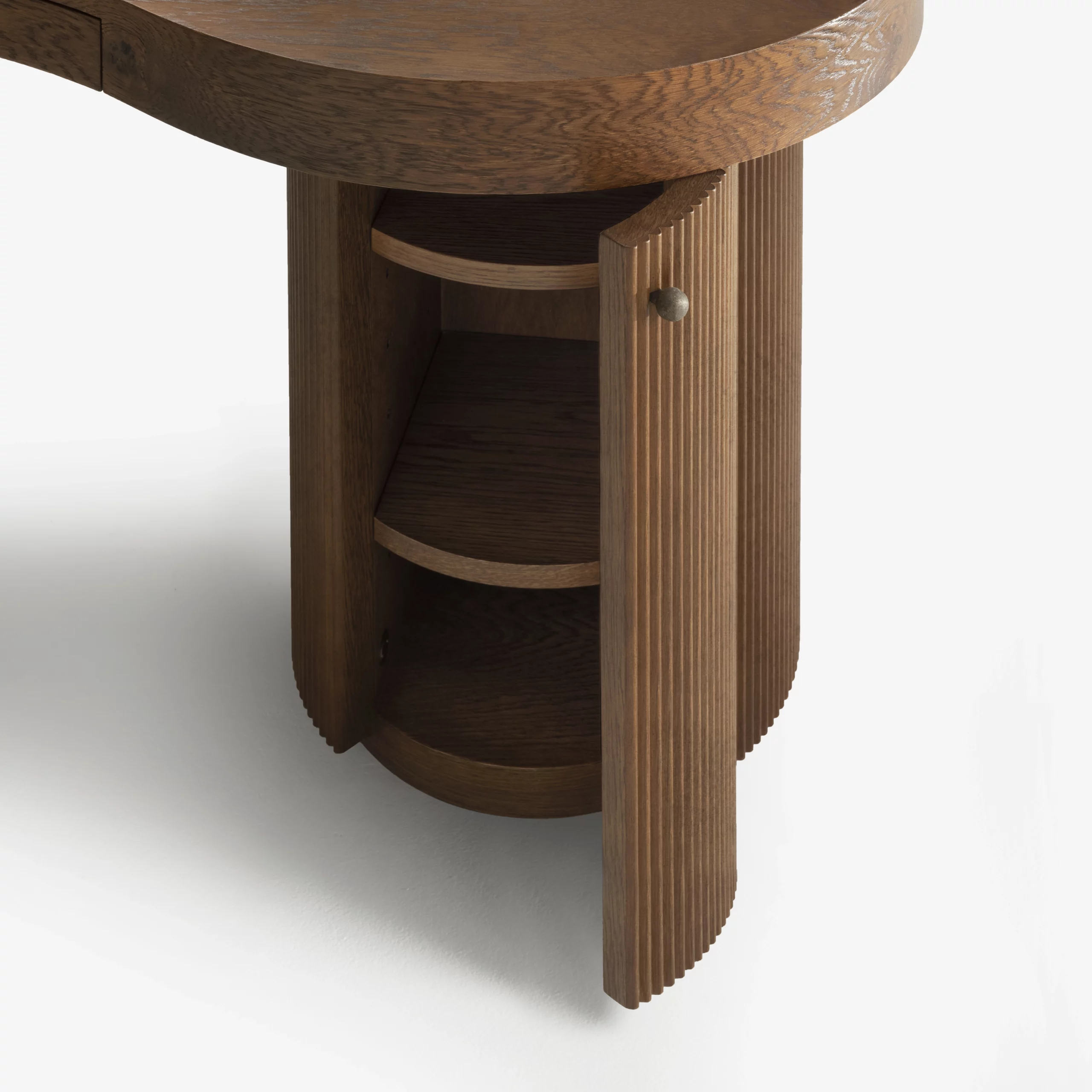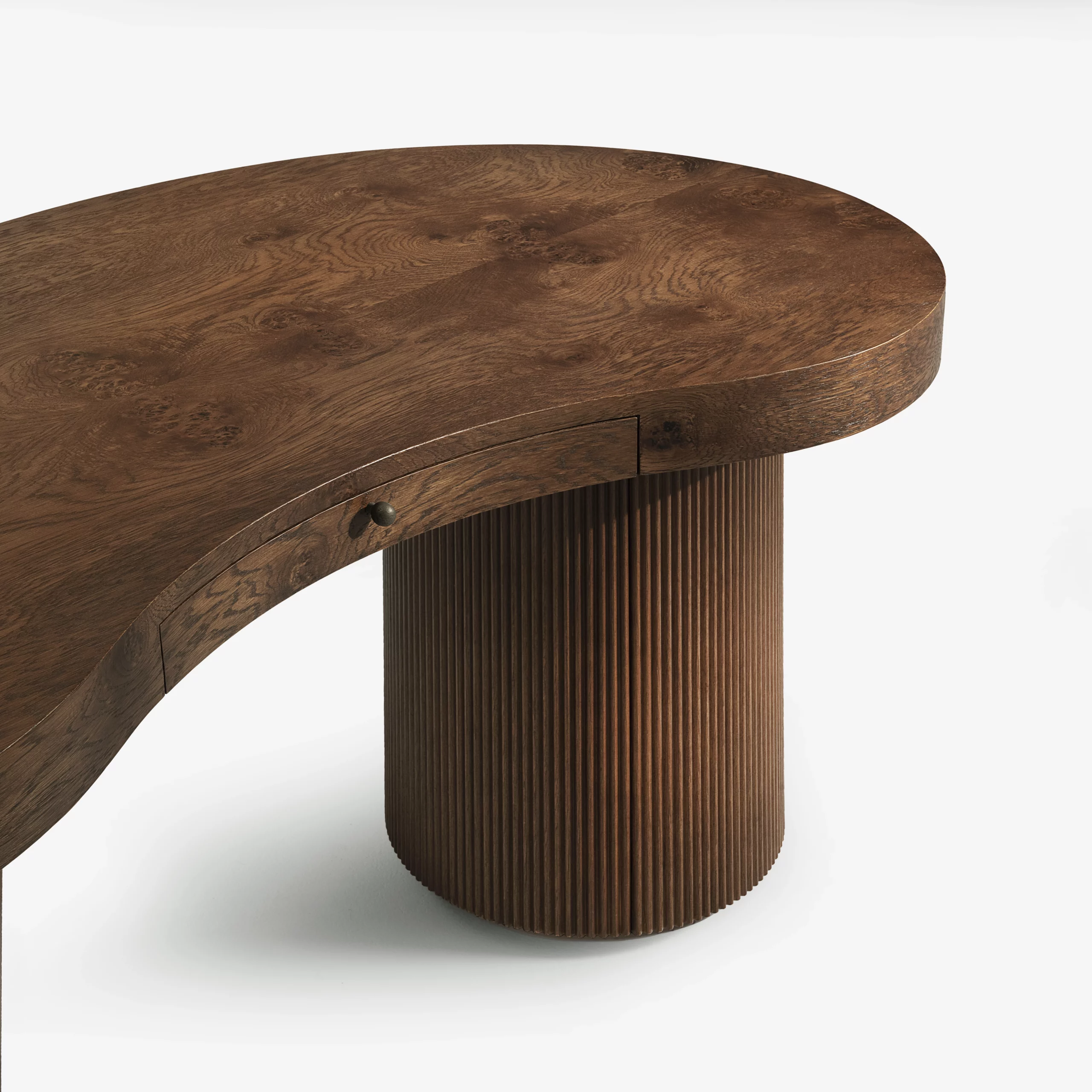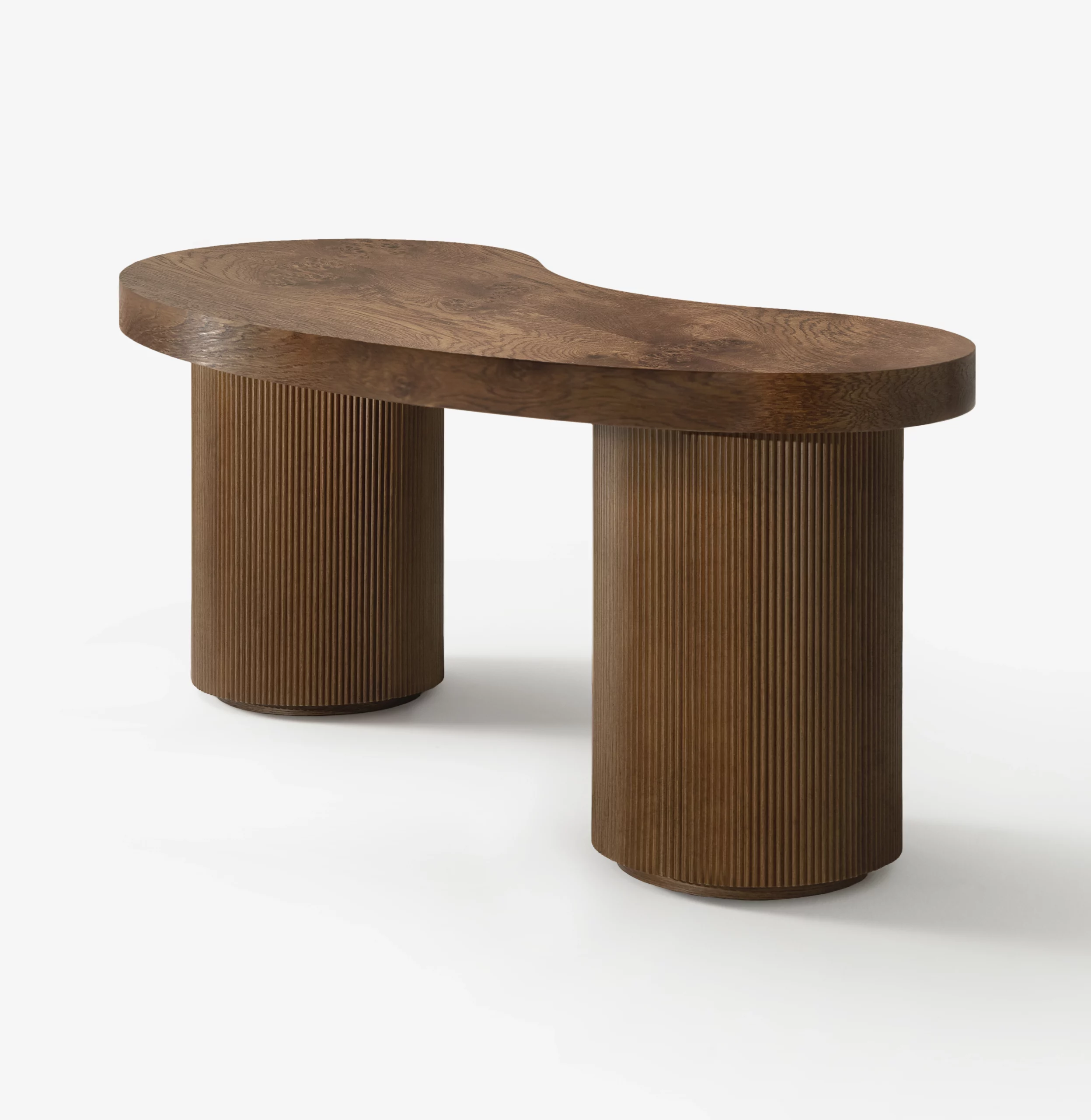 La collection ARY interpelle par ses formes libres et sa virtuosité artisanale. Les ondulations formées par le bois cannelé créent un rythme fluide et confèrent au mobilier toute sa rareté et sa singularité. La loupe de chêne qui habille les plateaux, laisse apparaître des paysages imaginaires et uniques, et anime table, chevet, banc ou enfilade.