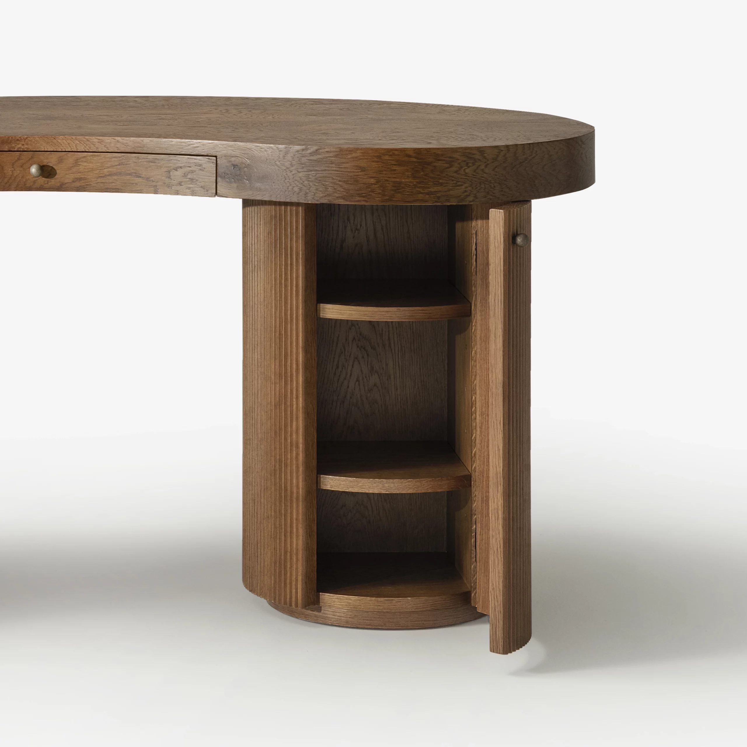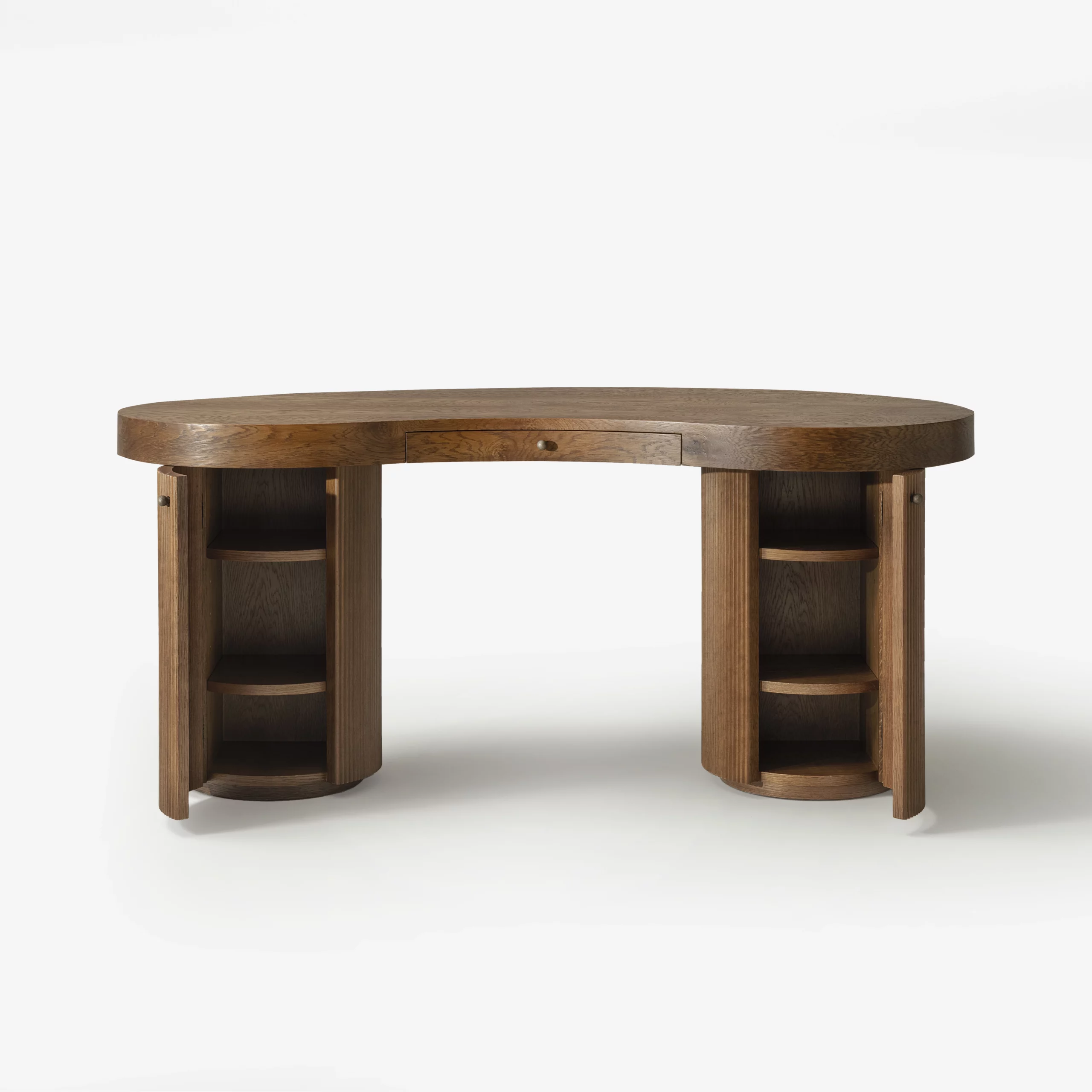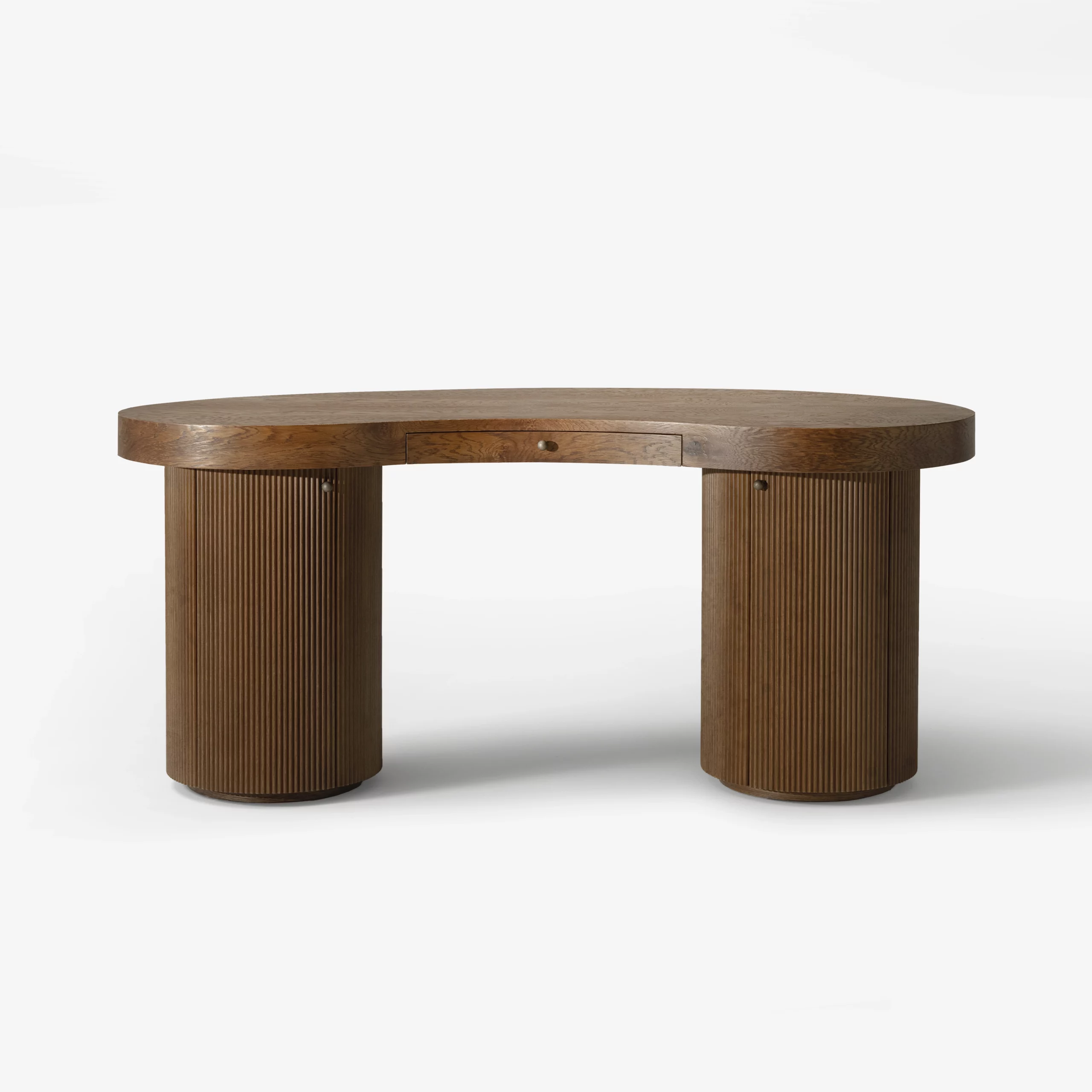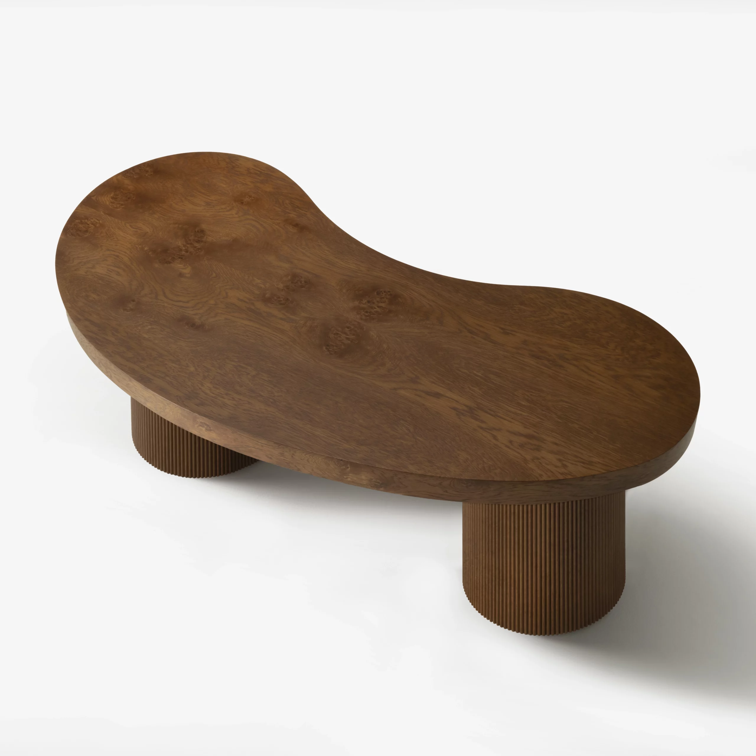 La collection ARY interpelle par ses formes libres et sa virtuosité artisanale. Les ondulations formées par le bois cannelé créent un rythme fluide et confèrent au mobilier toute sa rareté et sa singularité. La loupe de chêne qui habille les plateaux, laisse apparaître des paysages imaginaires et uniques, et anime table, chevet, banc ou enfilade.