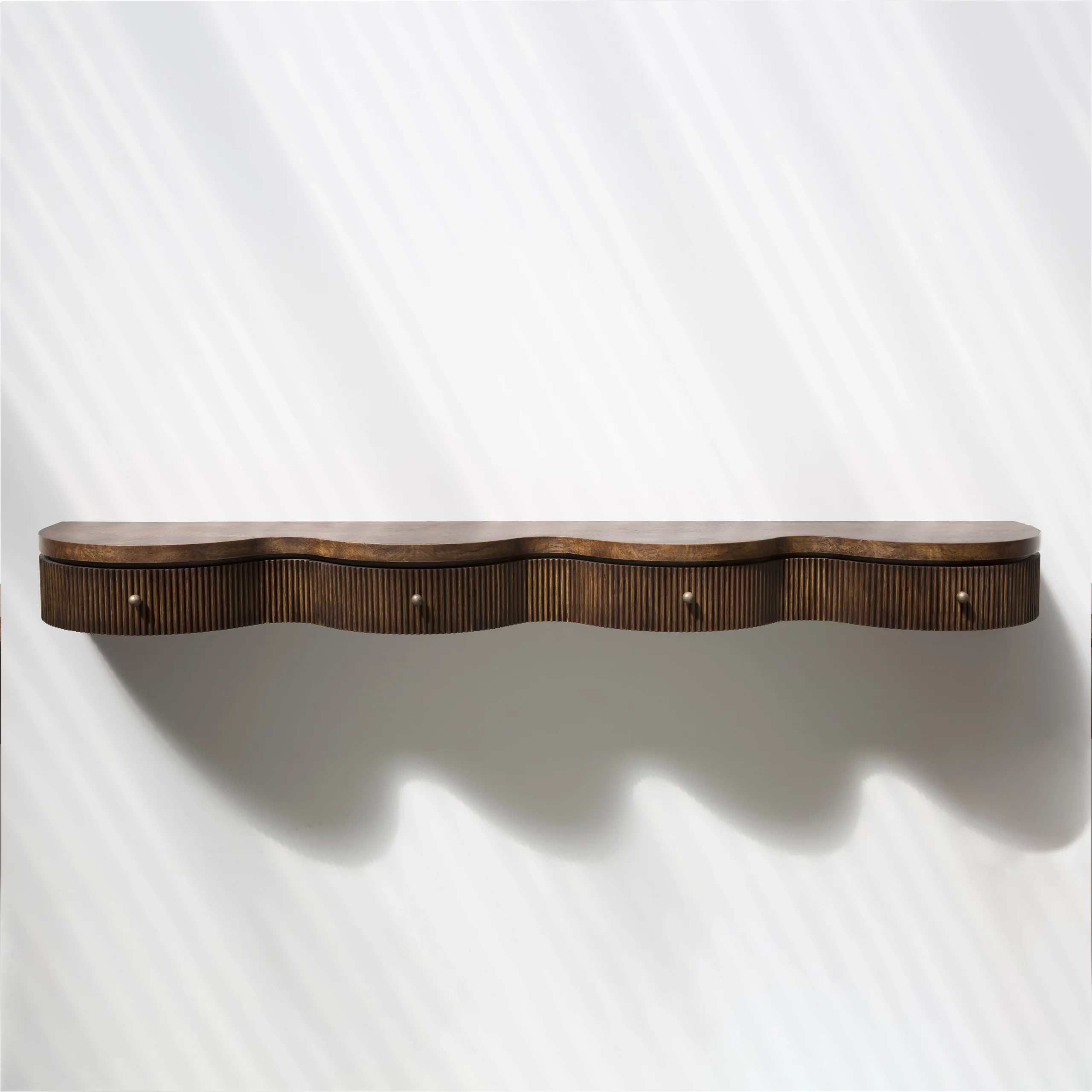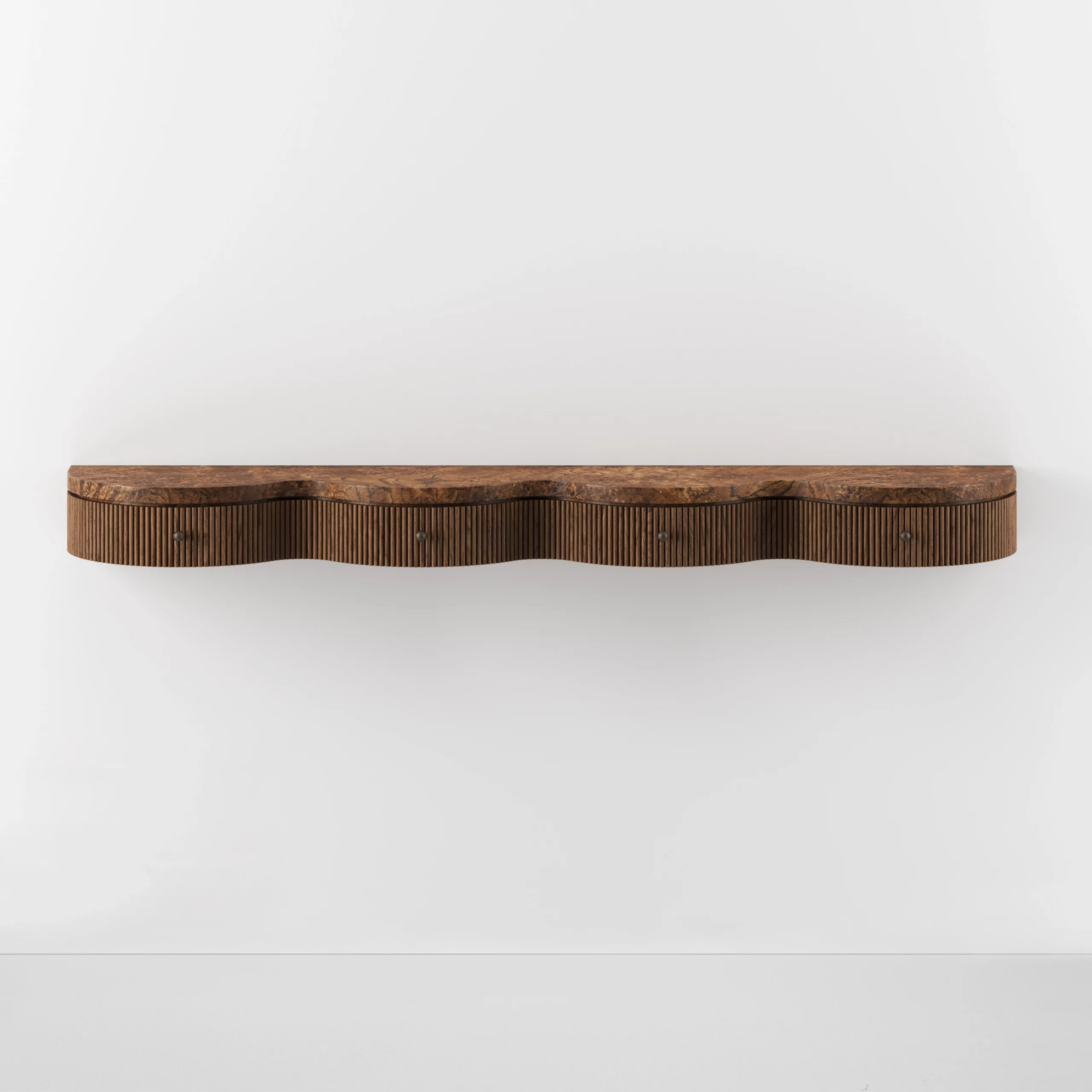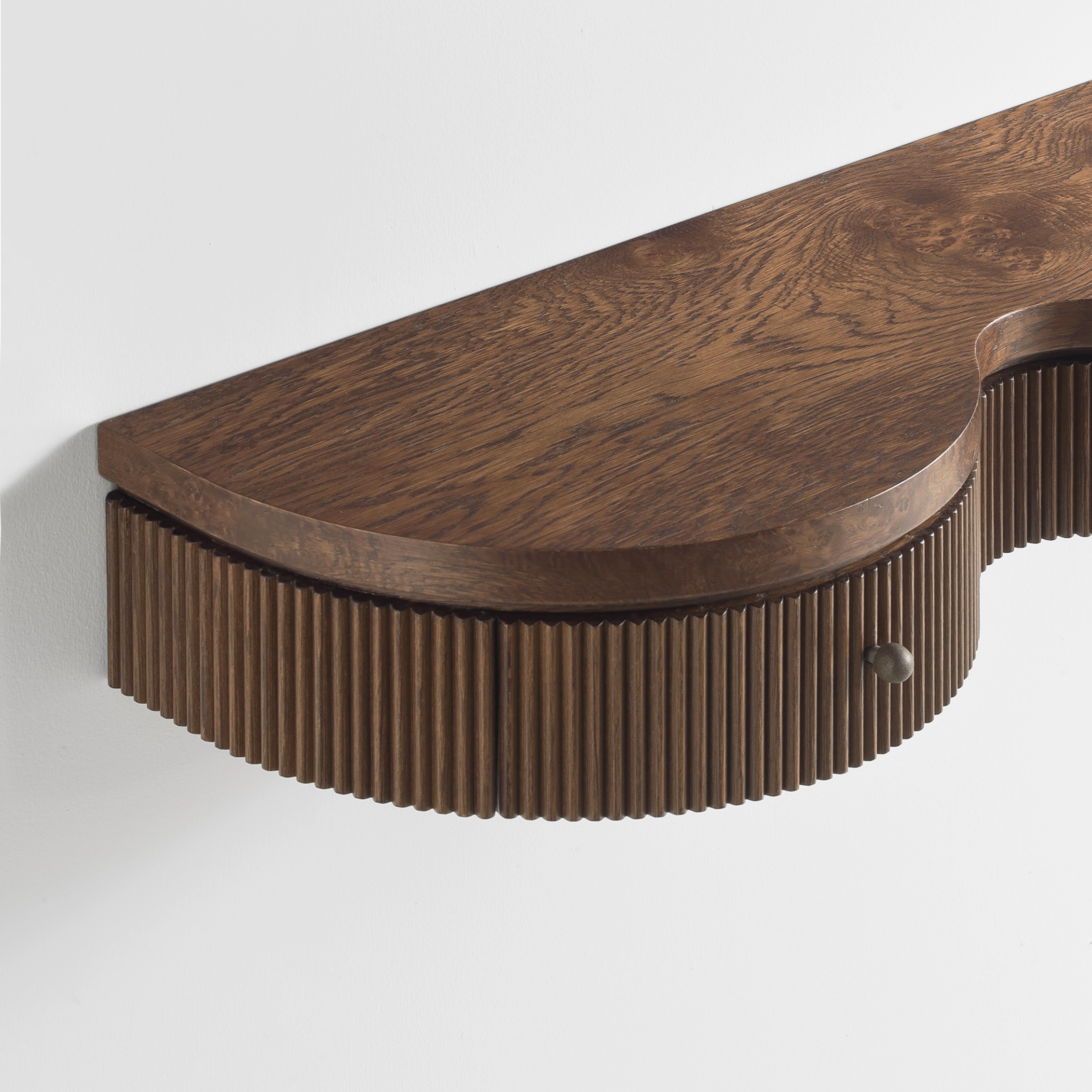 La collection ARY interpelle par ses formes libres et sa virtuosité artisanale. Les ondulations formées par le bois cannelé créent un rythme fluide et confèrent au mobilier toute sa rareté et sa singularité. La loupe de chêne qui habille les plateaux, laisse apparaître des paysages imaginaires et uniques, et anime table, chevet, banc ou enfilade.