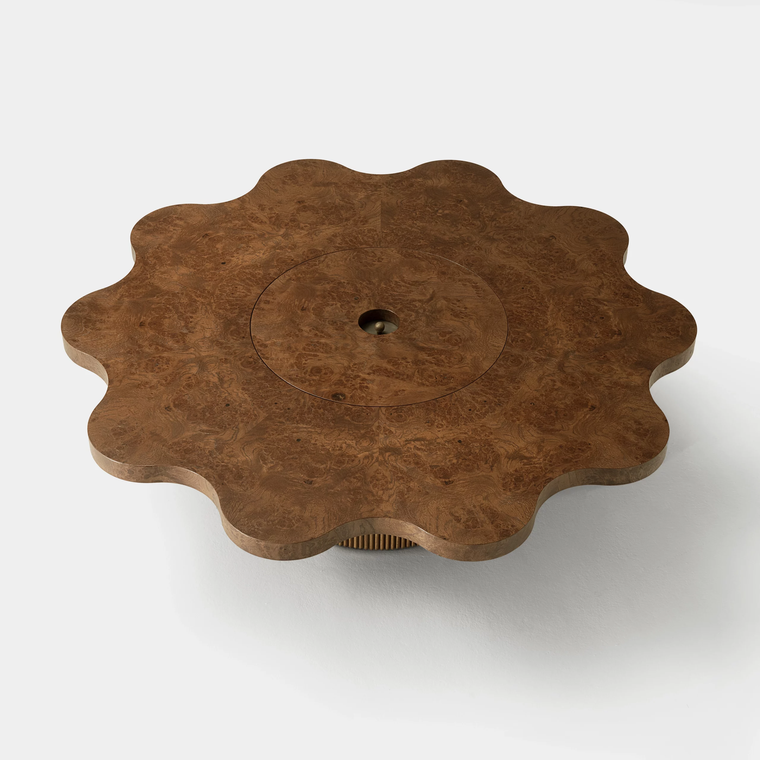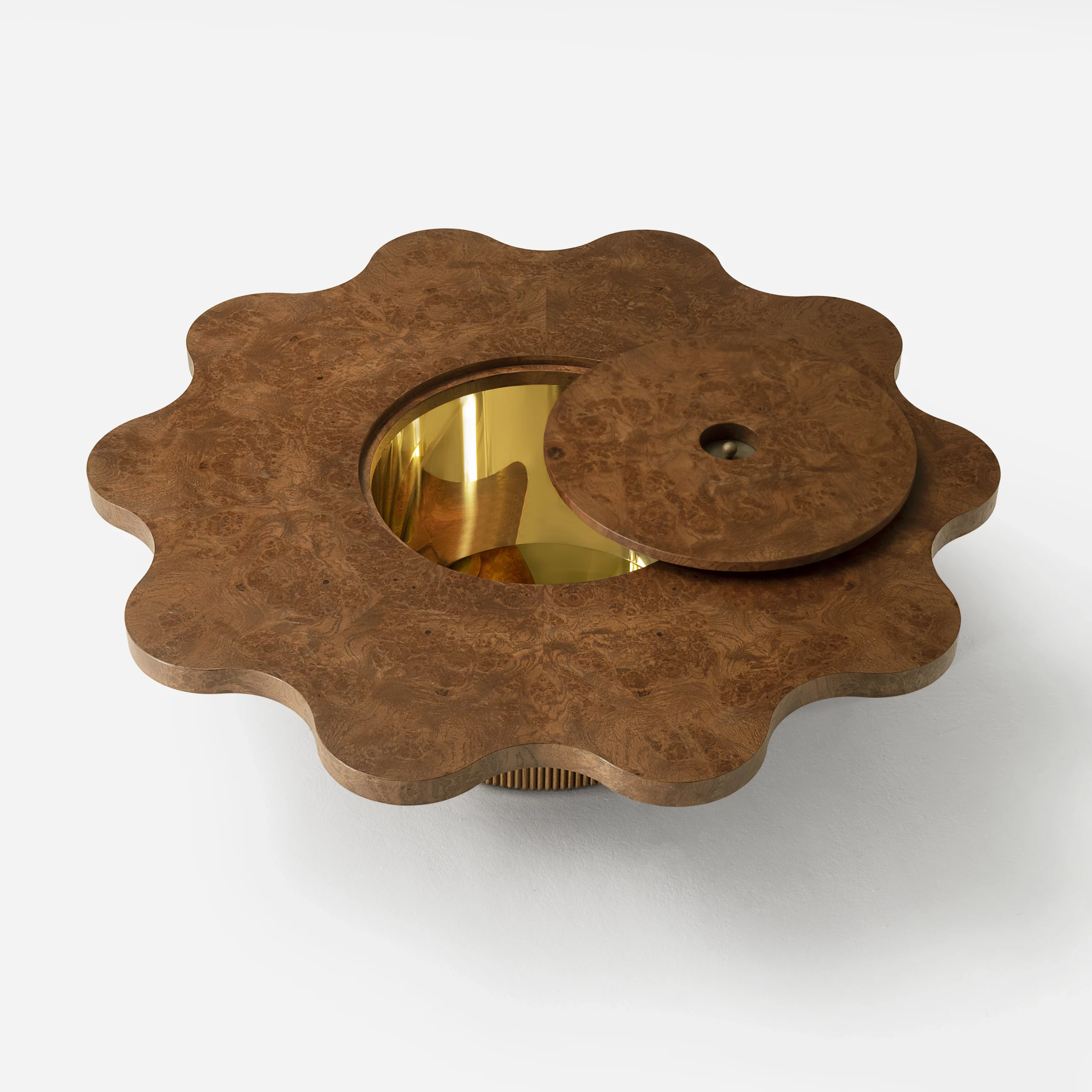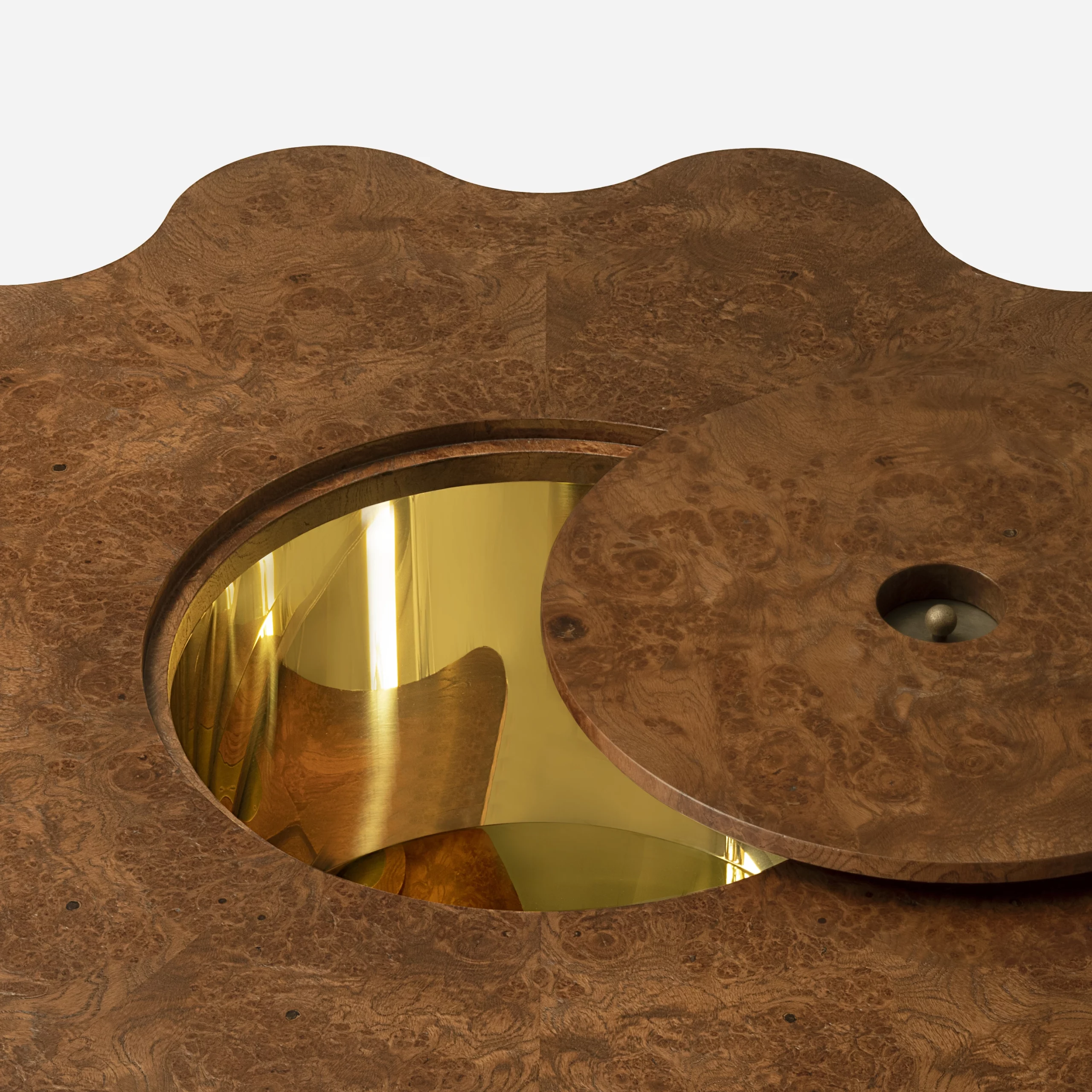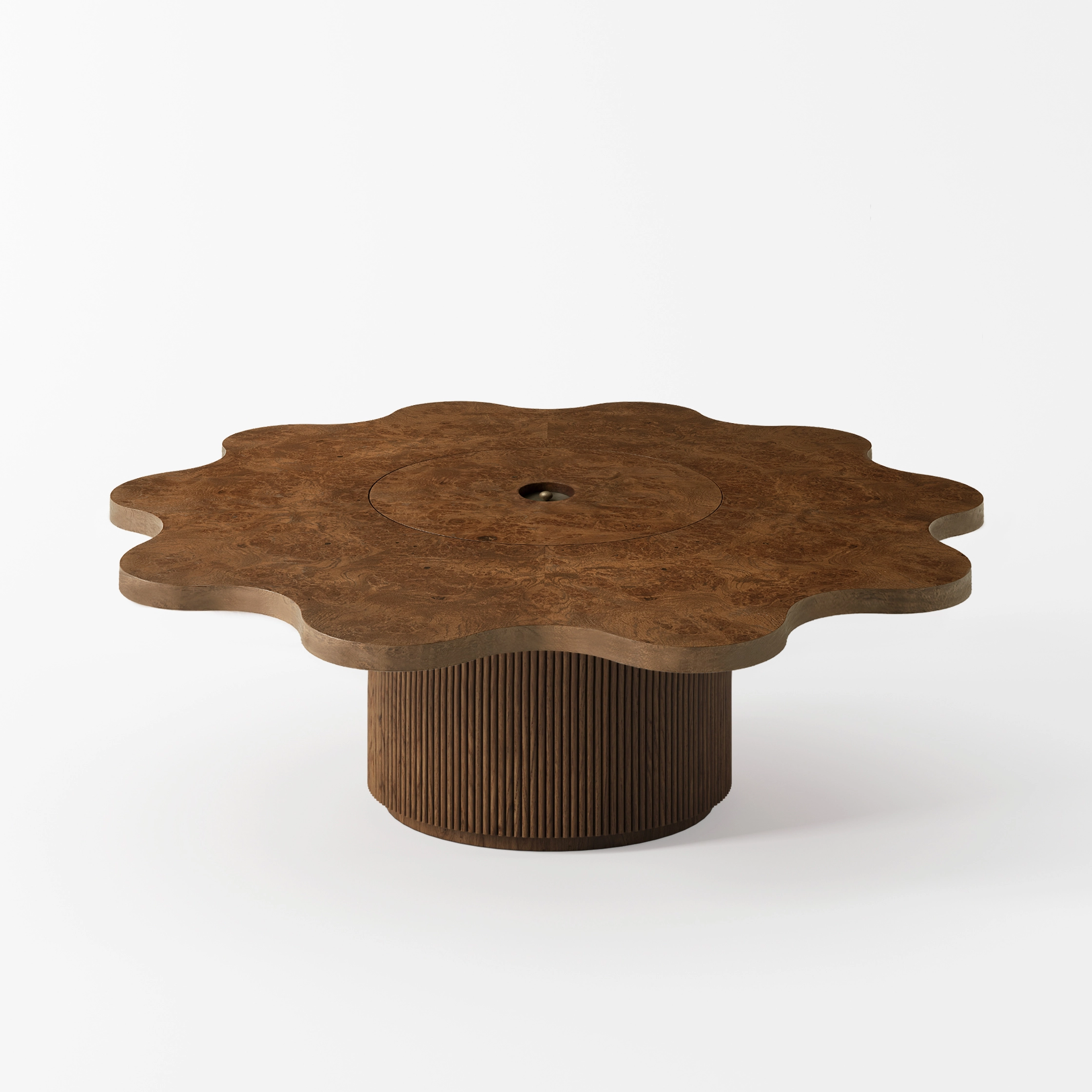 La collection ARY interpelle par ses formes libres et sa virtuosité artisanale. Les ondulations formées par le bois cannelé créent un rythme fluide et confèrent au mobilier toute sa rareté et sa singularité. La loupe de chêne qui habille les plateaux, laisse apparaître des paysages imaginaires et uniques, et anime table, chevet, banc ou enfilade.