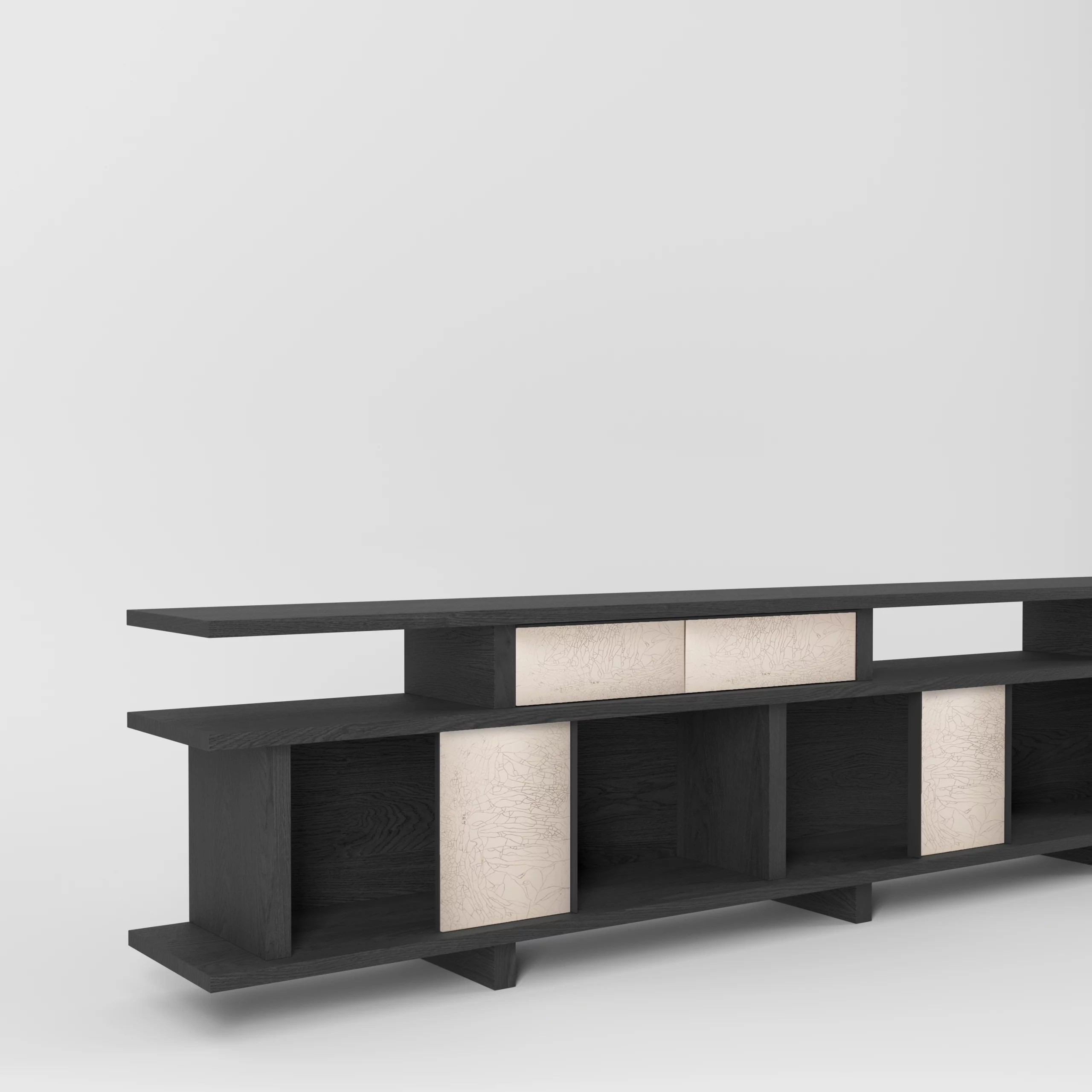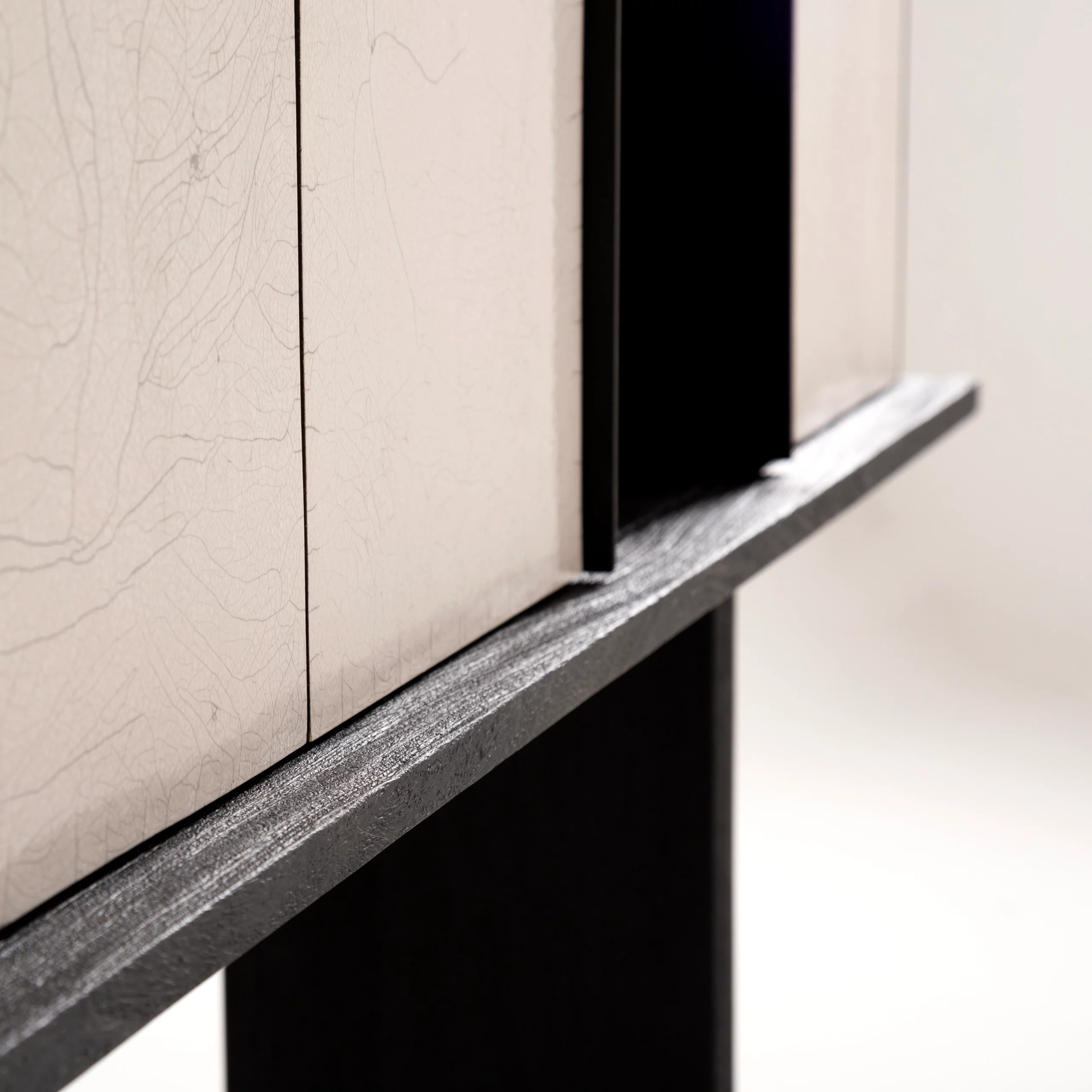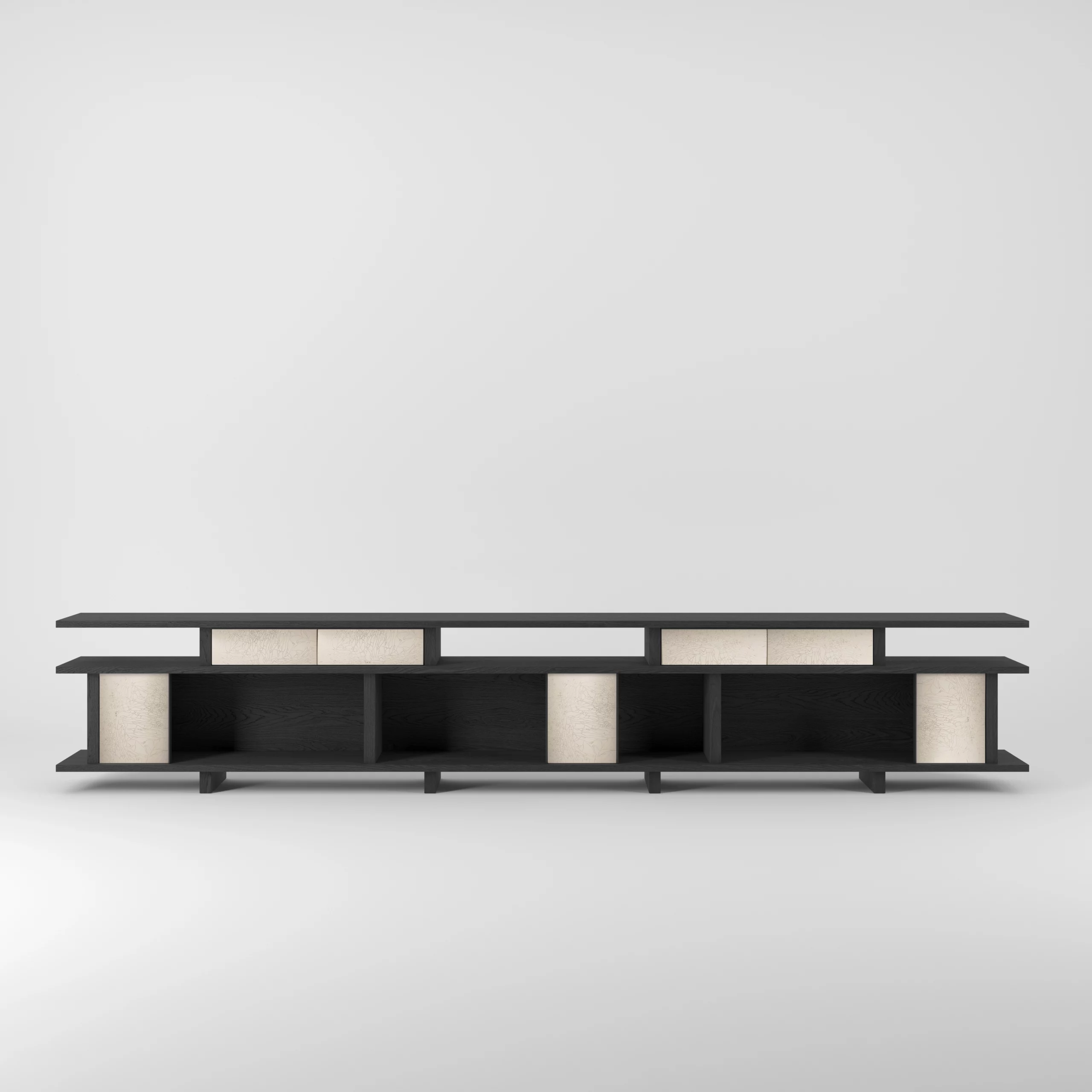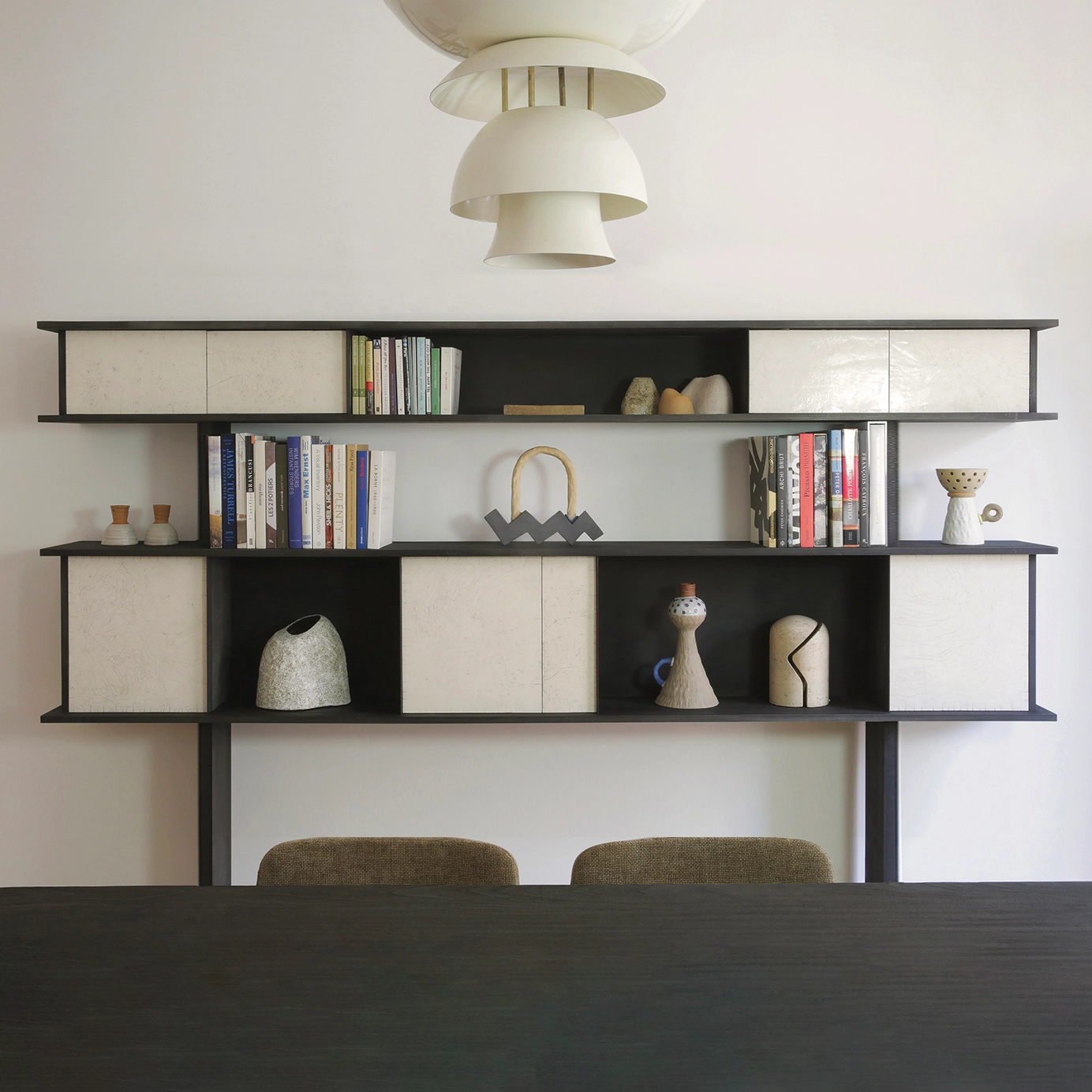 La collection Jonathan mêle fonctionnalité et esthétisme. Le système modulable et personnalisable de la bibliothèque assure une liberté de composition et une légèreté dans l’espace. L’assemblage de matériaux nobles tels que le Raku, le bois Assamela patiné et le métal noir lui donne une dimension à la fois fonctionnelle et extrêmement raffinée.