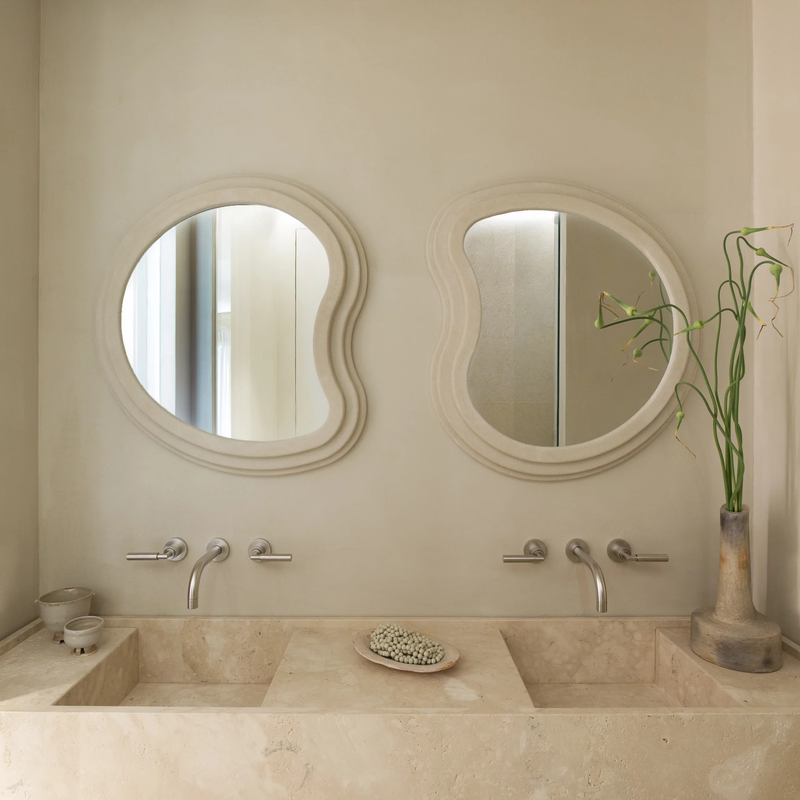 Tel un nuage vaporeux, tel un ciel qui se dessine, la collection NOA invite à l’évasion. Sa forme aléatoire en plâtre chamotté évoque les ondes d’un ricochet dans l’eau et lui confère toute sa poésie.