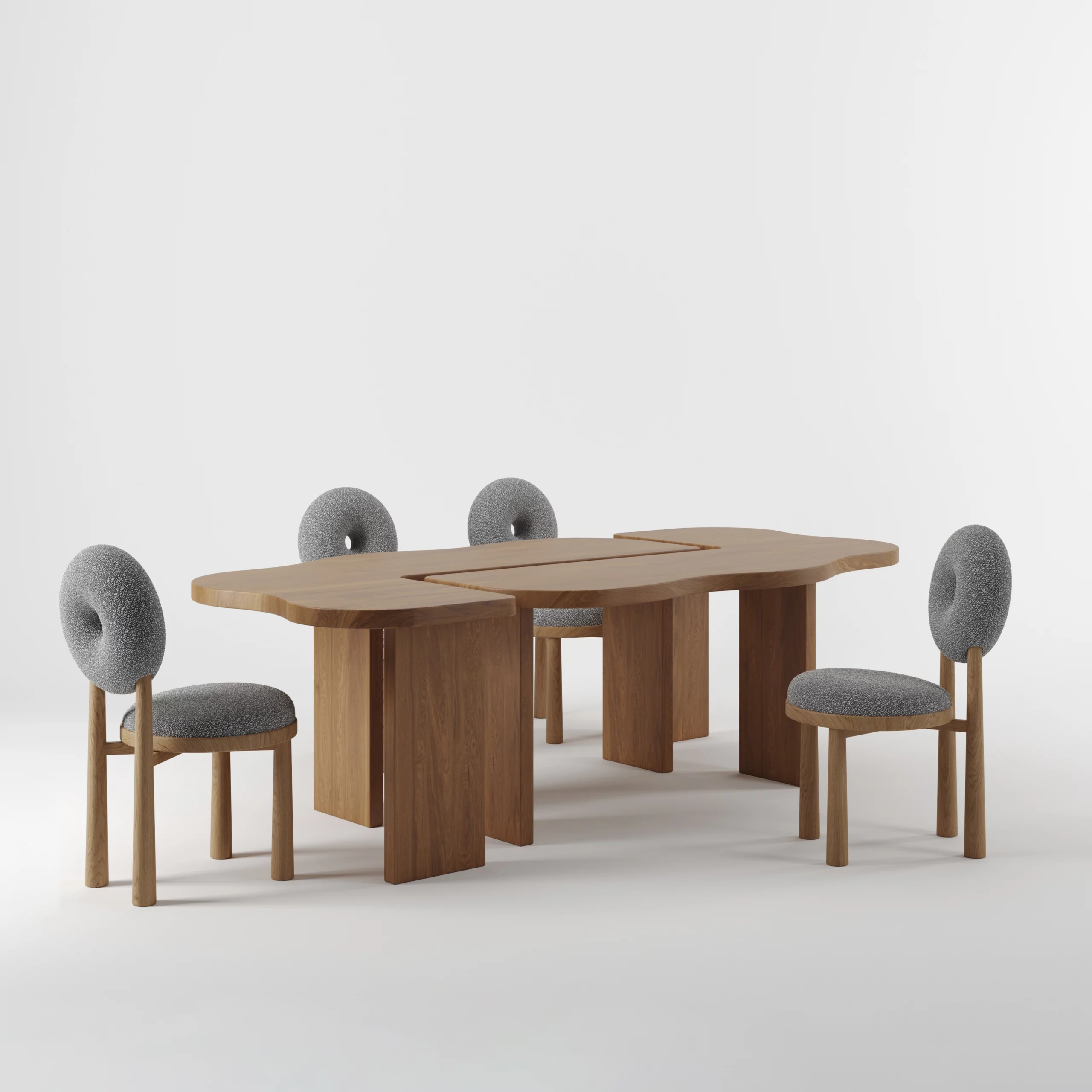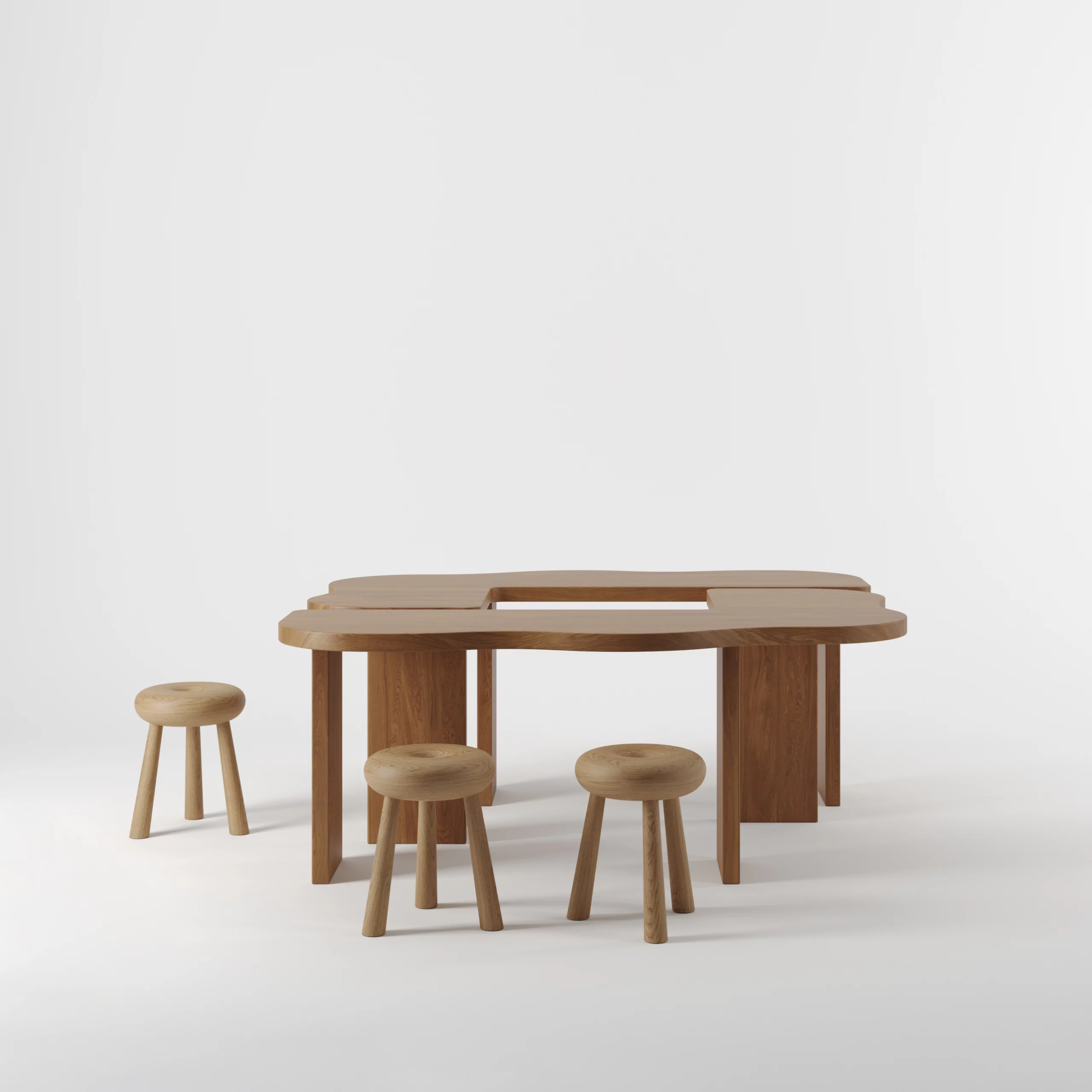Les tables évoquent un duo à la fois uni et libre qui se complète, s’emboîte et s’assemble. Tantôt carré, tantôt rectangle, les éléments se déplacent au gré de vos envies. La tête de lit, moelleuse et réconfortante, nous enveloppe par sa forme sensuelle et généreuse.
