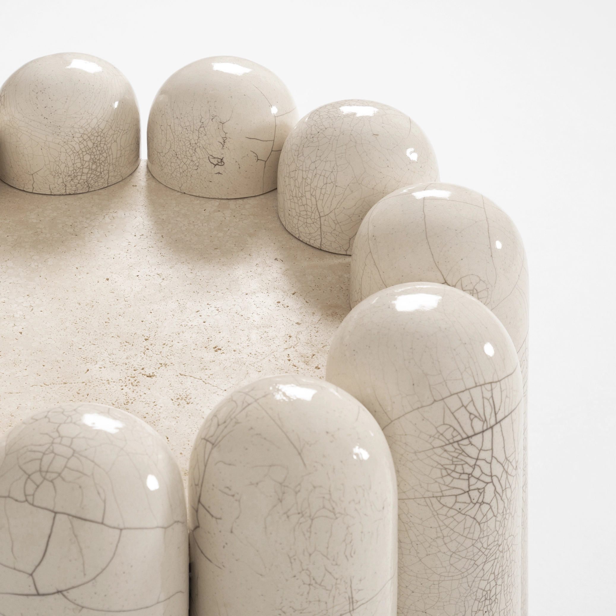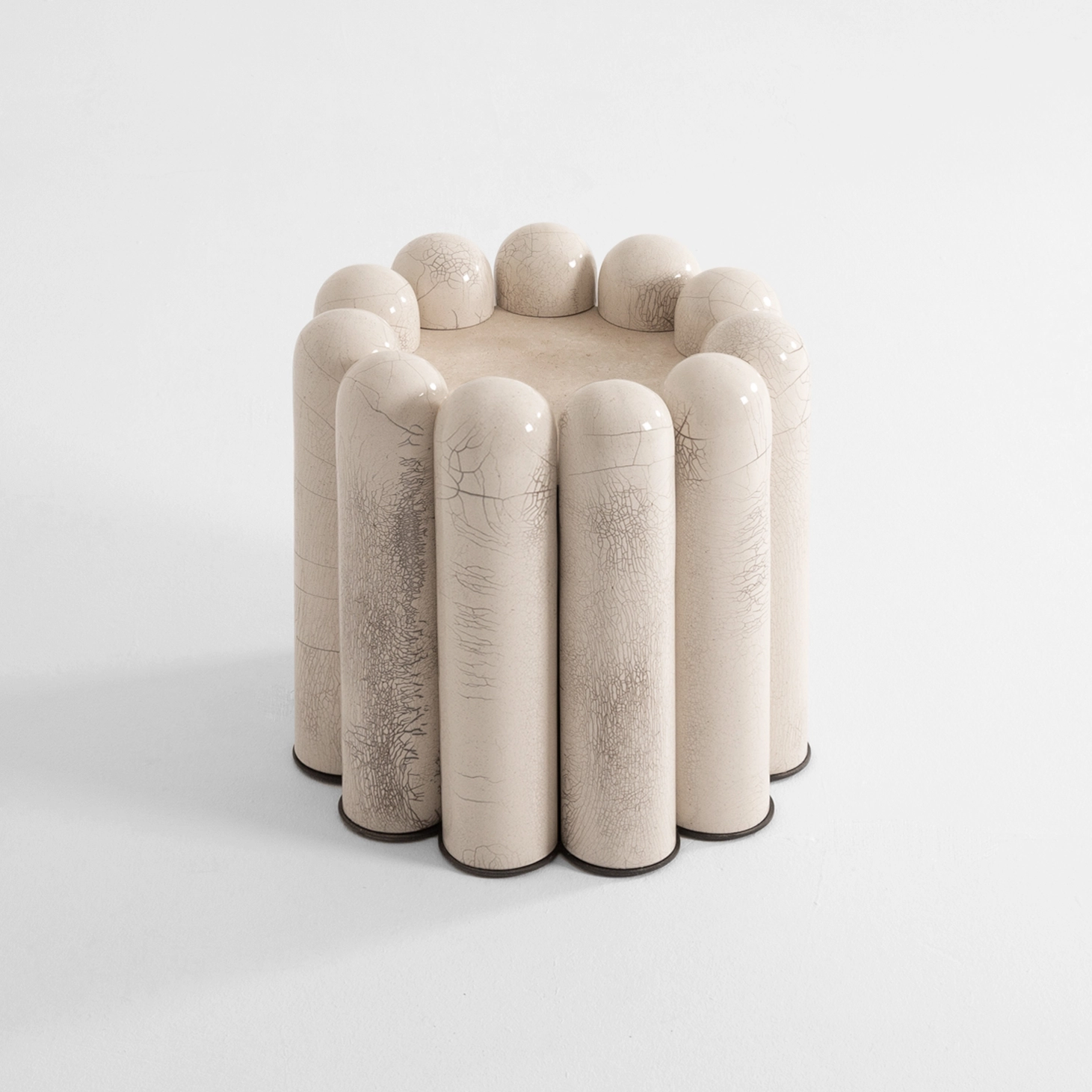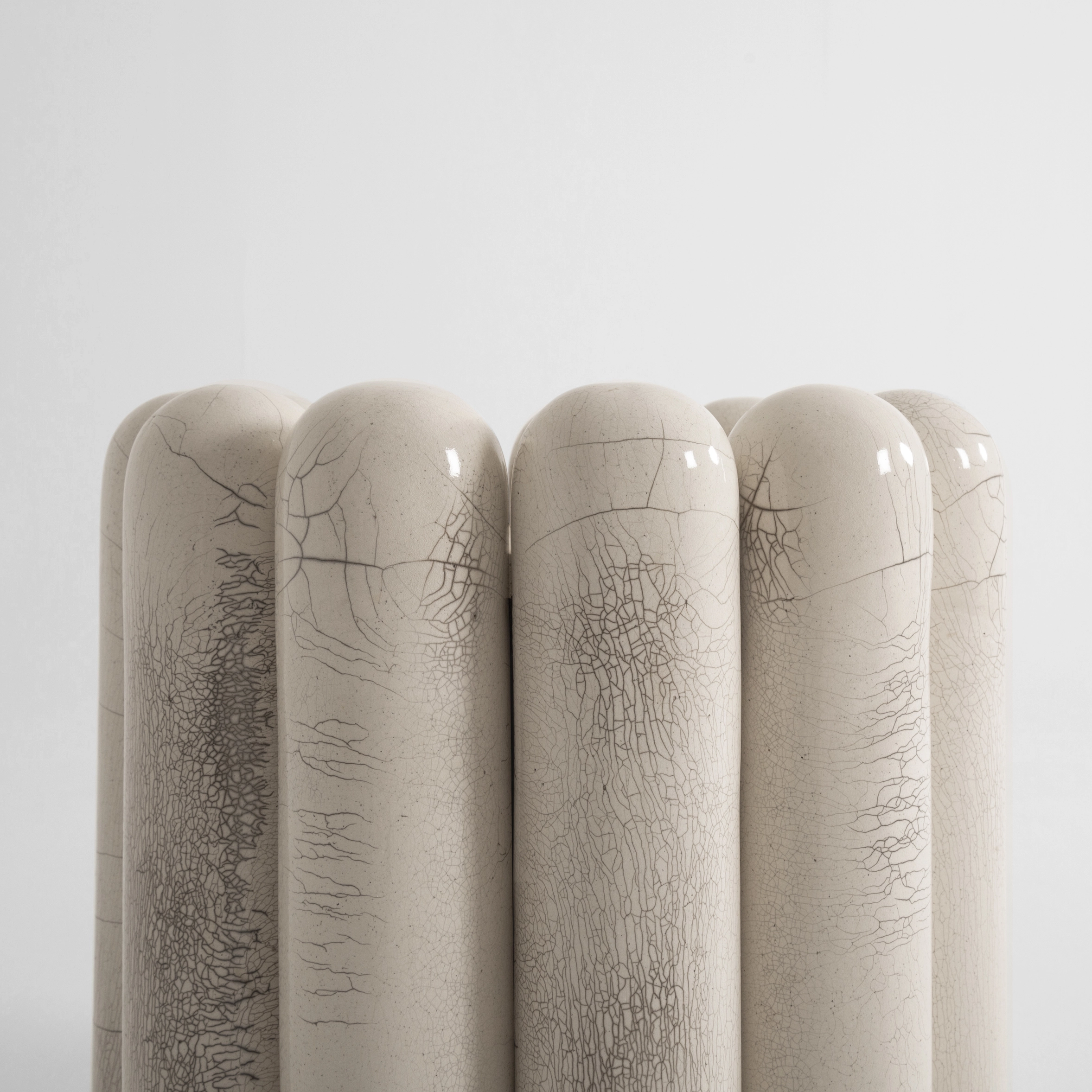 Les tuiles habillant les meubles et les luminaires sont réalisées en Raku, une technique ancestrale de céramique japonaise. Le choc thermique provoque des craquelures dans l’émail et révèlent de subtiles lignes noires créant des dessins aléatoires tel un paysage vu du ciel. Cette technique rend chaque pièce unique, le pouvoir et la magie de la matière artisanale se déclinent ici en luminaires, tables, buffet, cabinet bar ou mural. Il émane de ces pièces un subtil raffinement, tant par le dessin que l’aura de la matière.