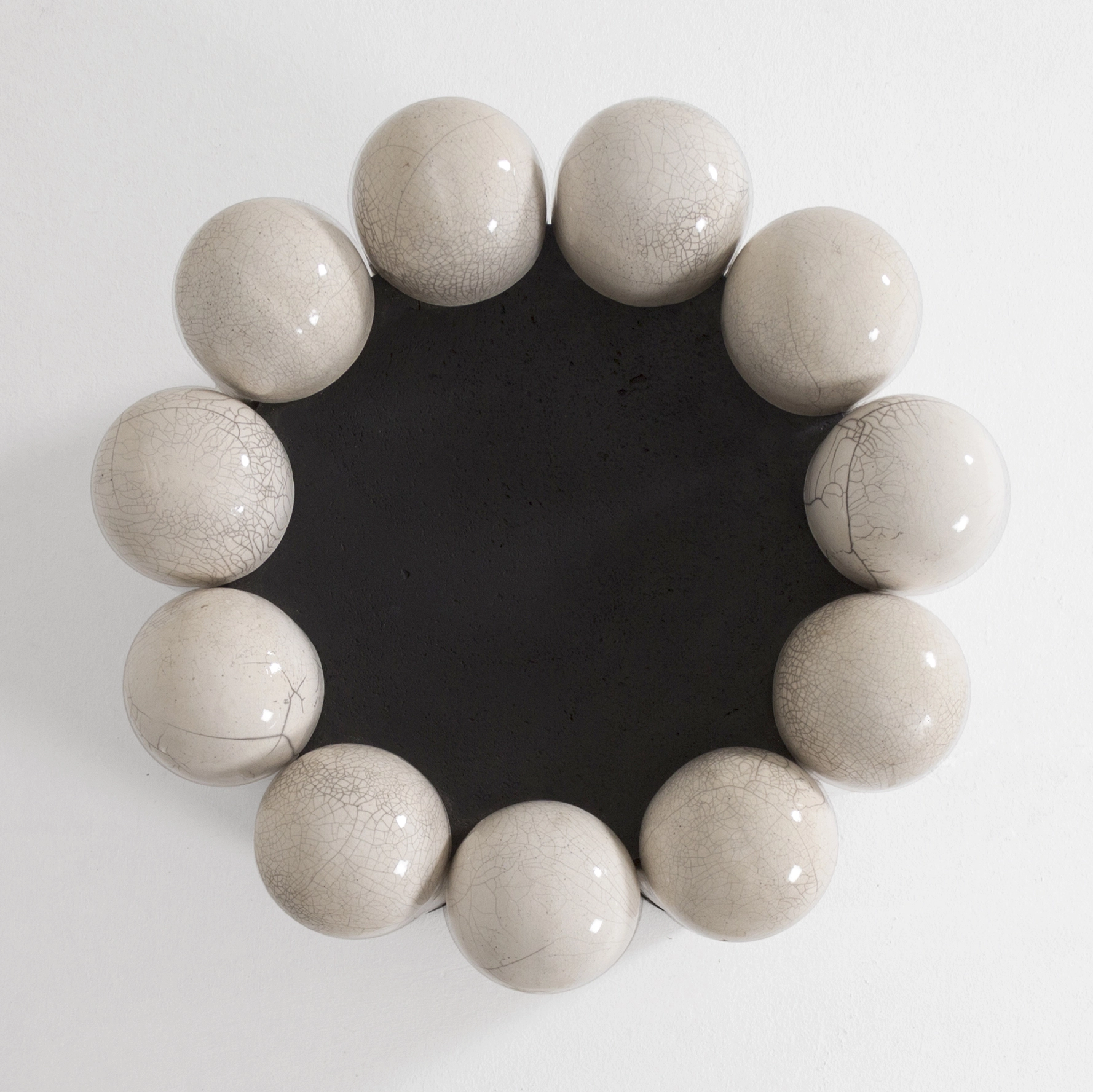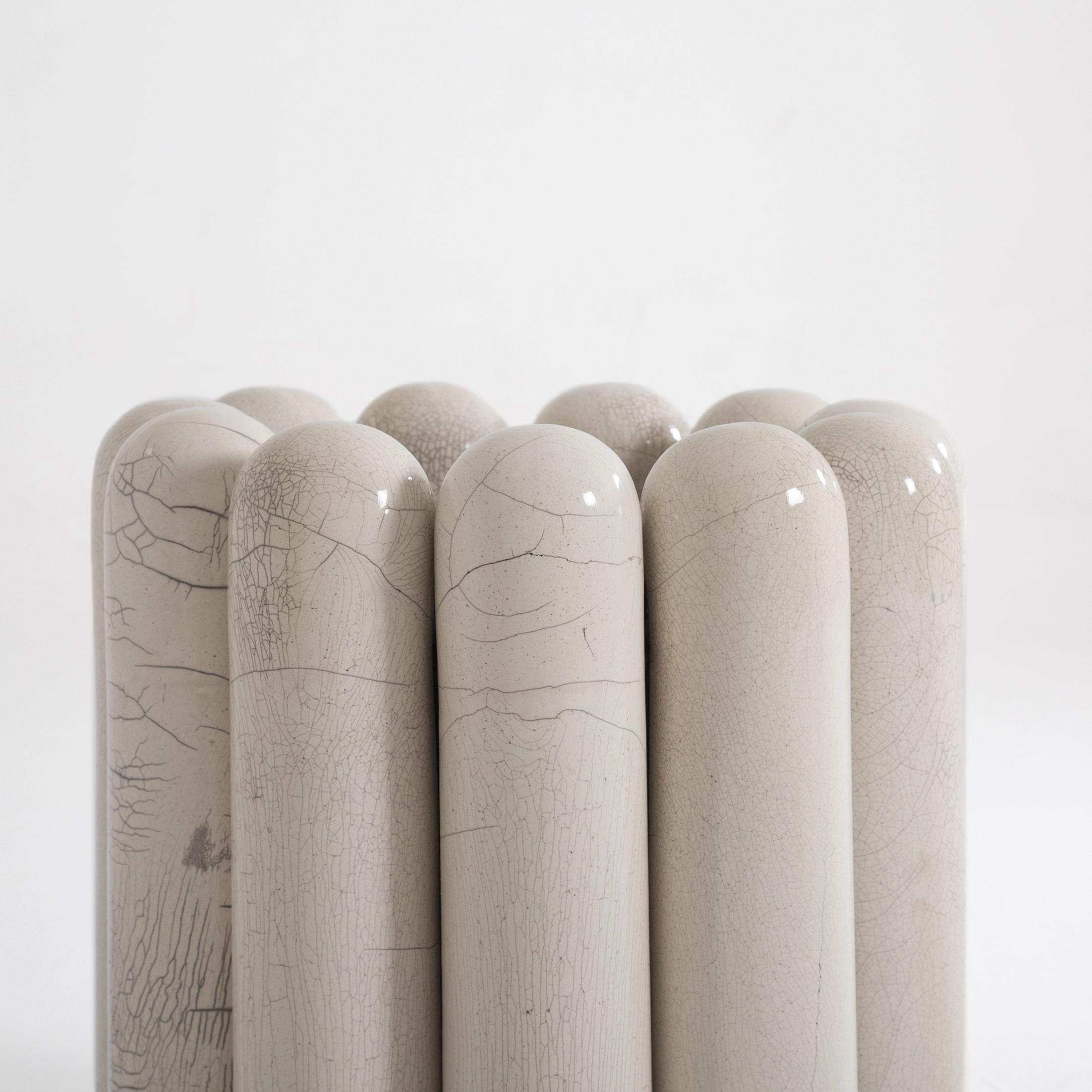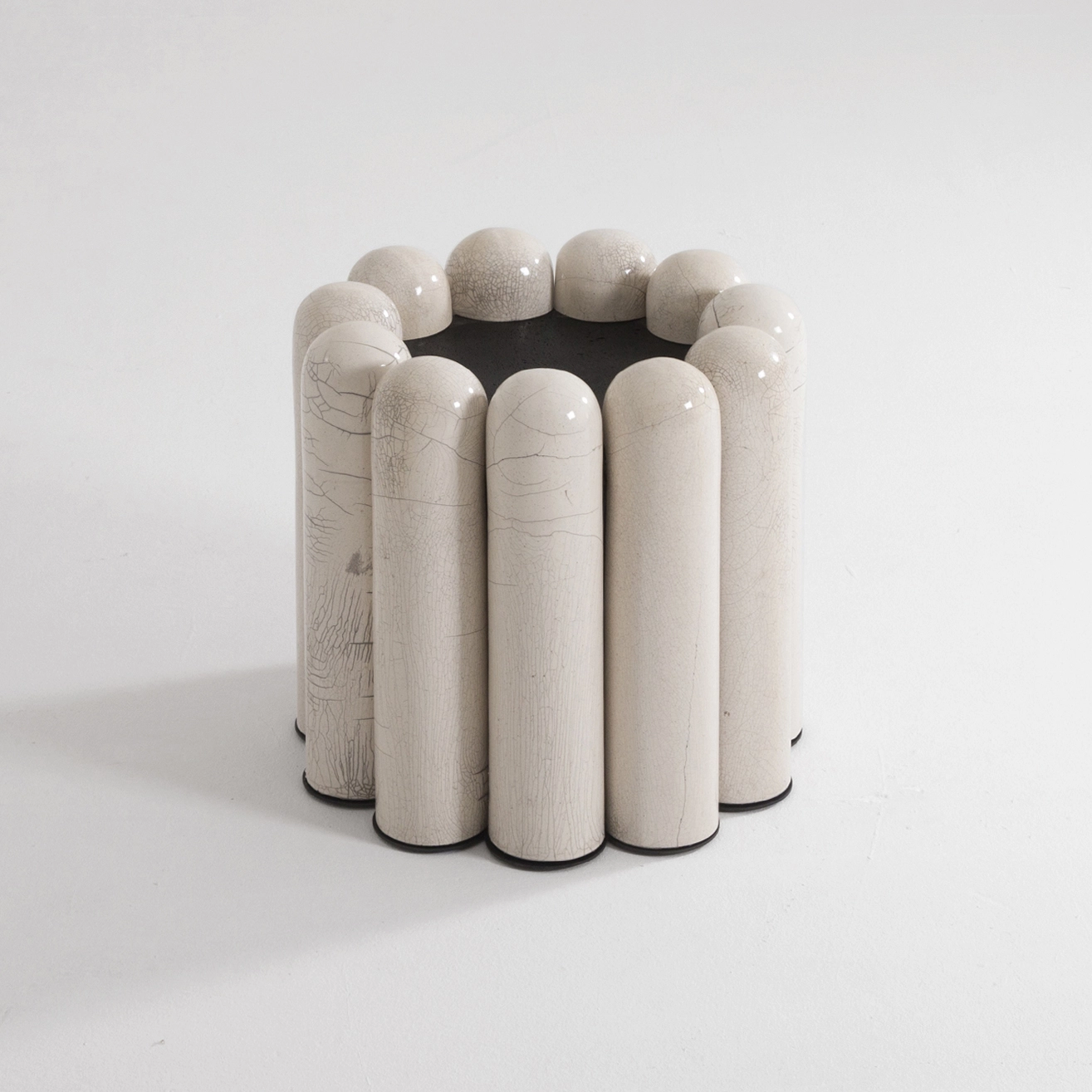 Les tuiles habillant les meubles et les luminaires sont réalisées en Raku, une technique ancestrale de céramique japonaise. Le choc thermique provoque des craquelures dans l’émail et révèlent de subtiles lignes noires créant des dessins aléatoires tel un paysage vu du ciel. Cette technique rend chaque pièce unique, le pouvoir et la magie de la matière artisanale se déclinent ici en luminaires, tables, buffet, cabinet bar ou mural. Il émane de ces pièces un subtil raffinement, tant par le dessin que l’aura de la matière.