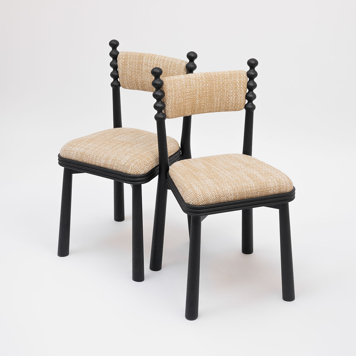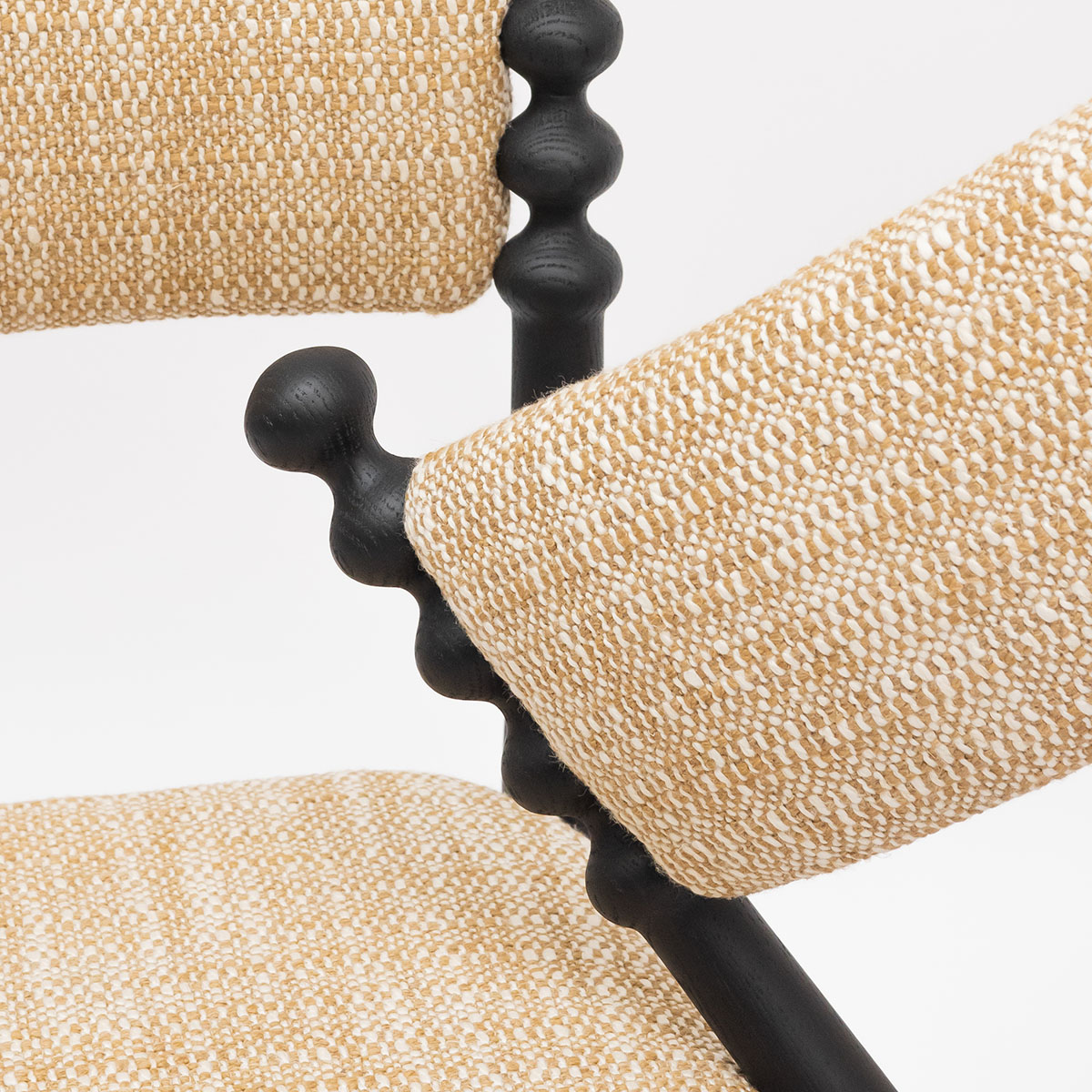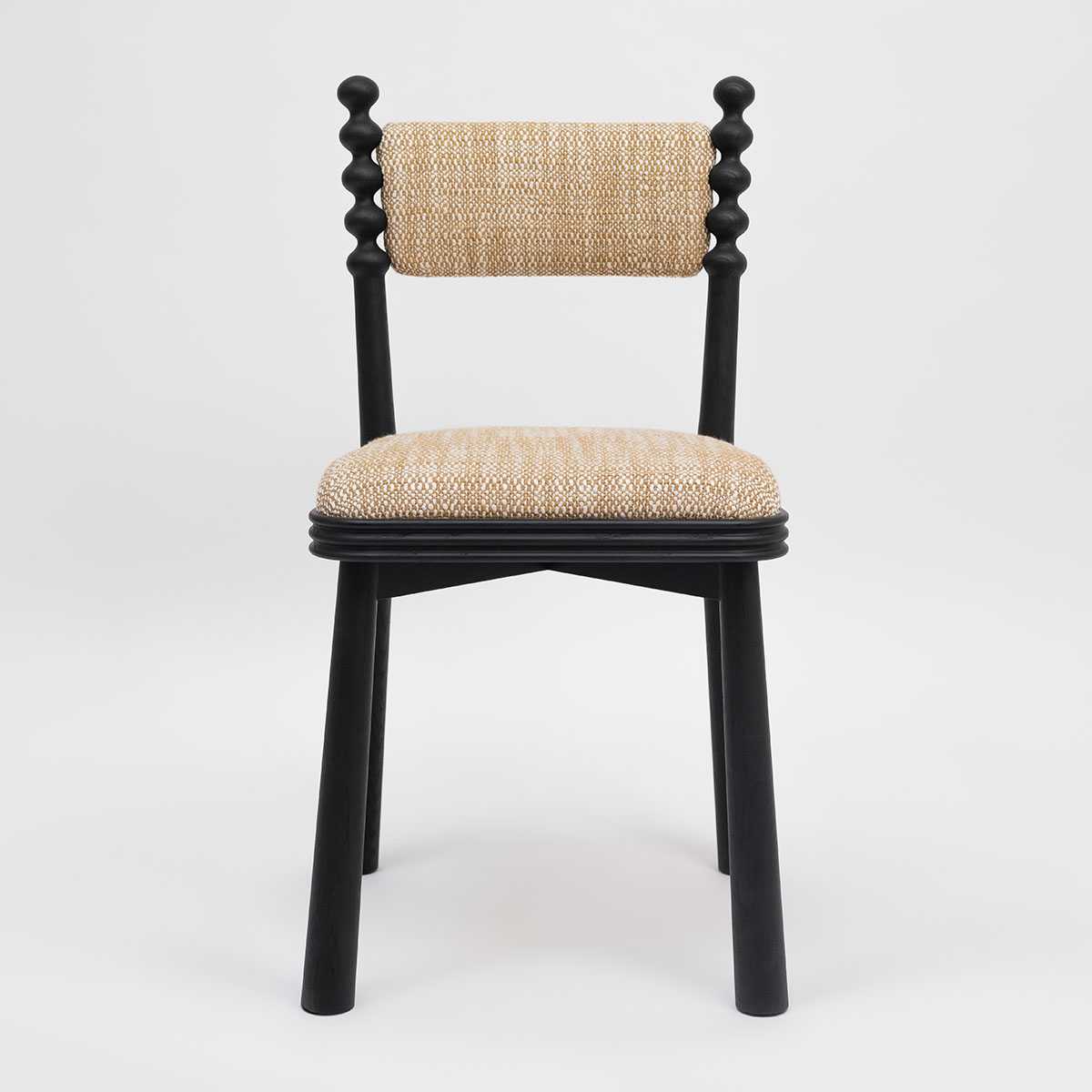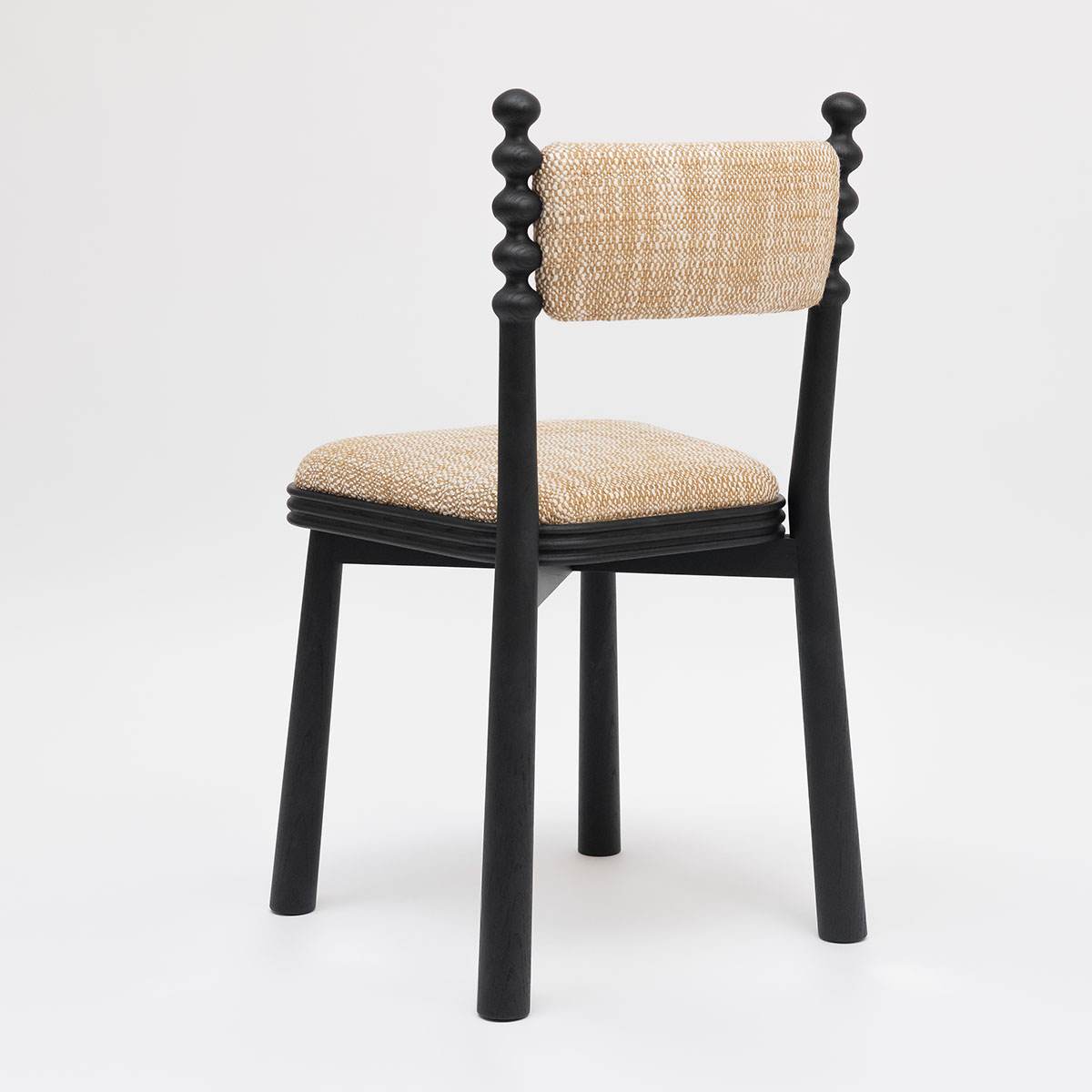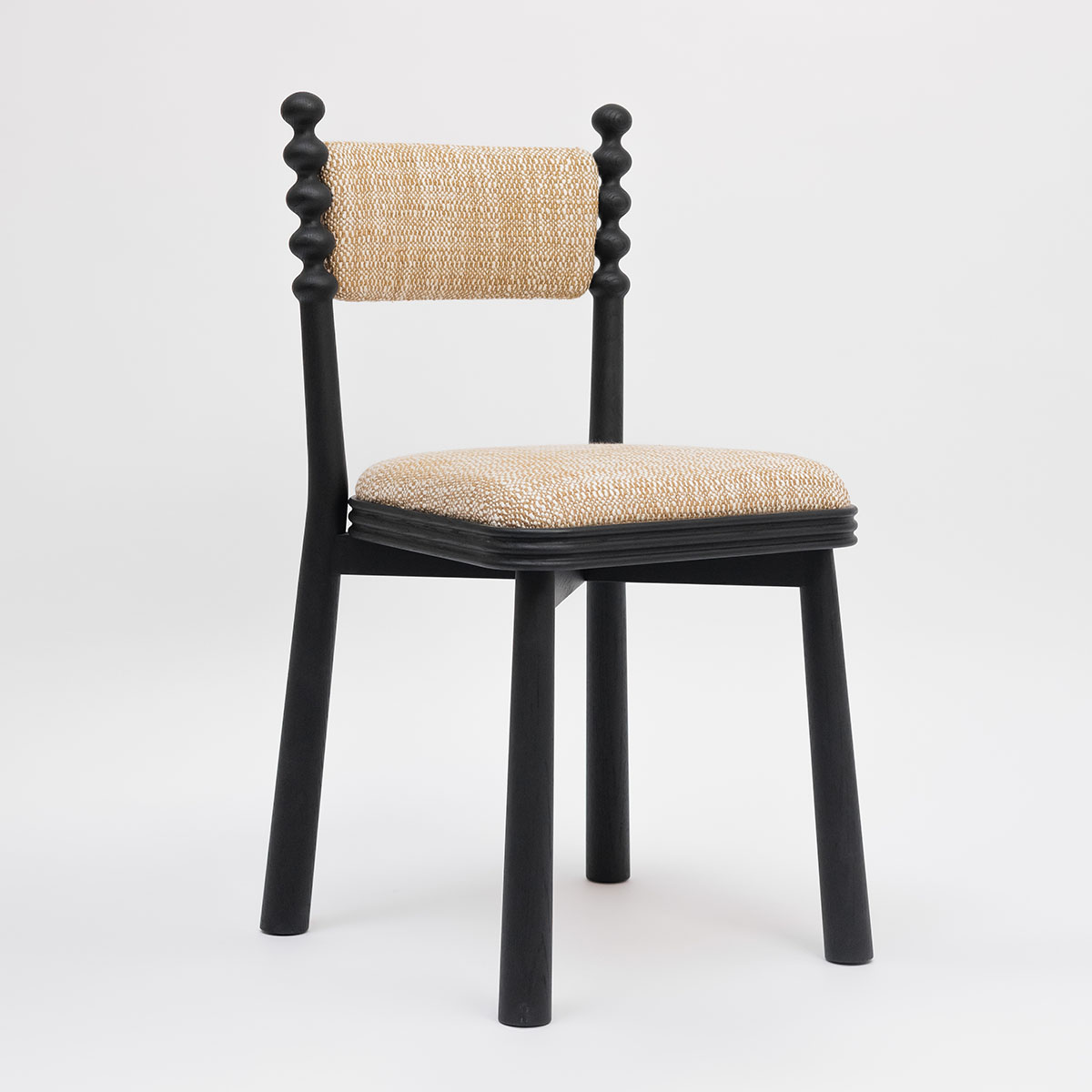 La chaise TAMA, boule en japonais, dégage une vraie personnalité grâce à son piètement surmonté de boules en bois tourné. Son assise tapissée avec son cadre en bois cannelé allie confort et élégance.