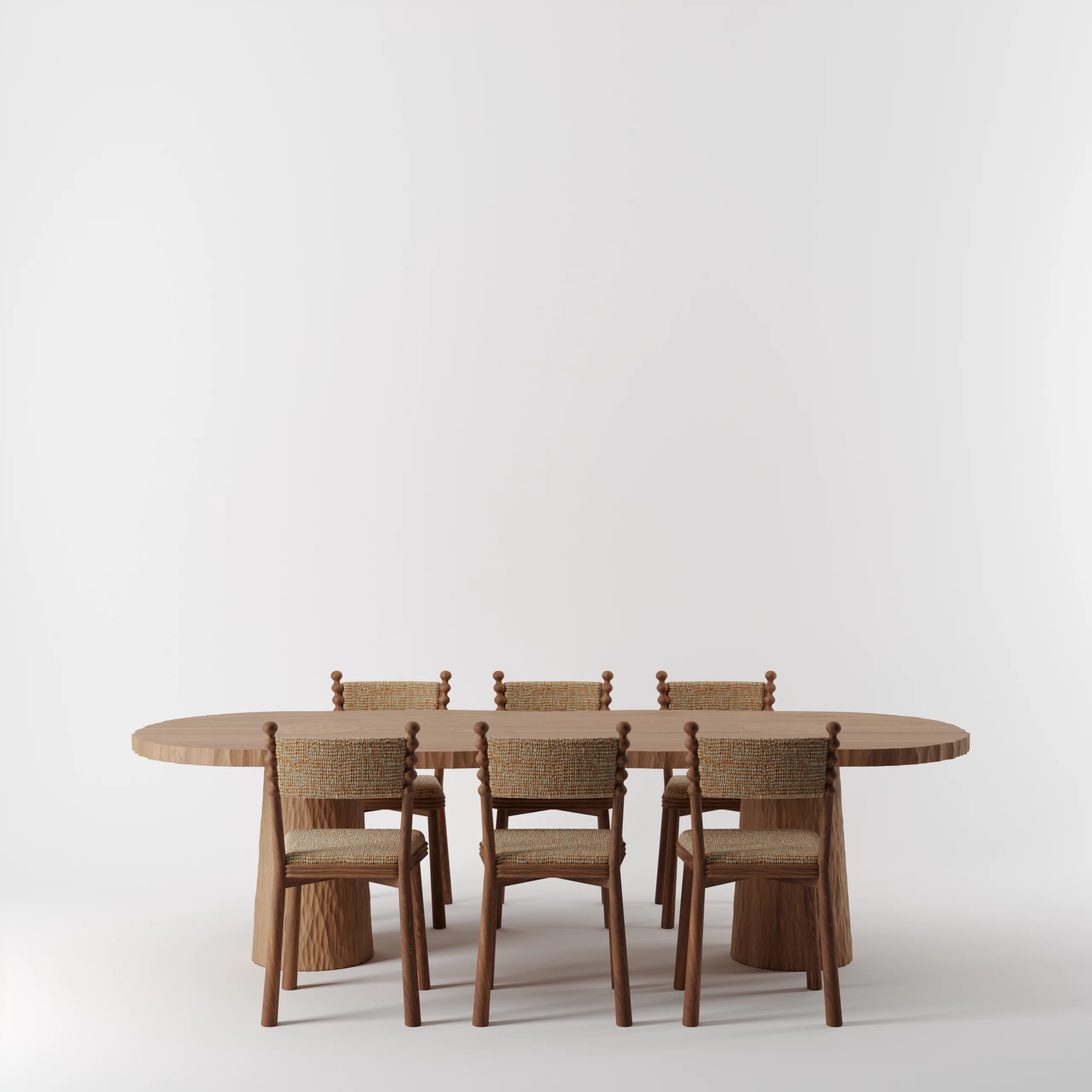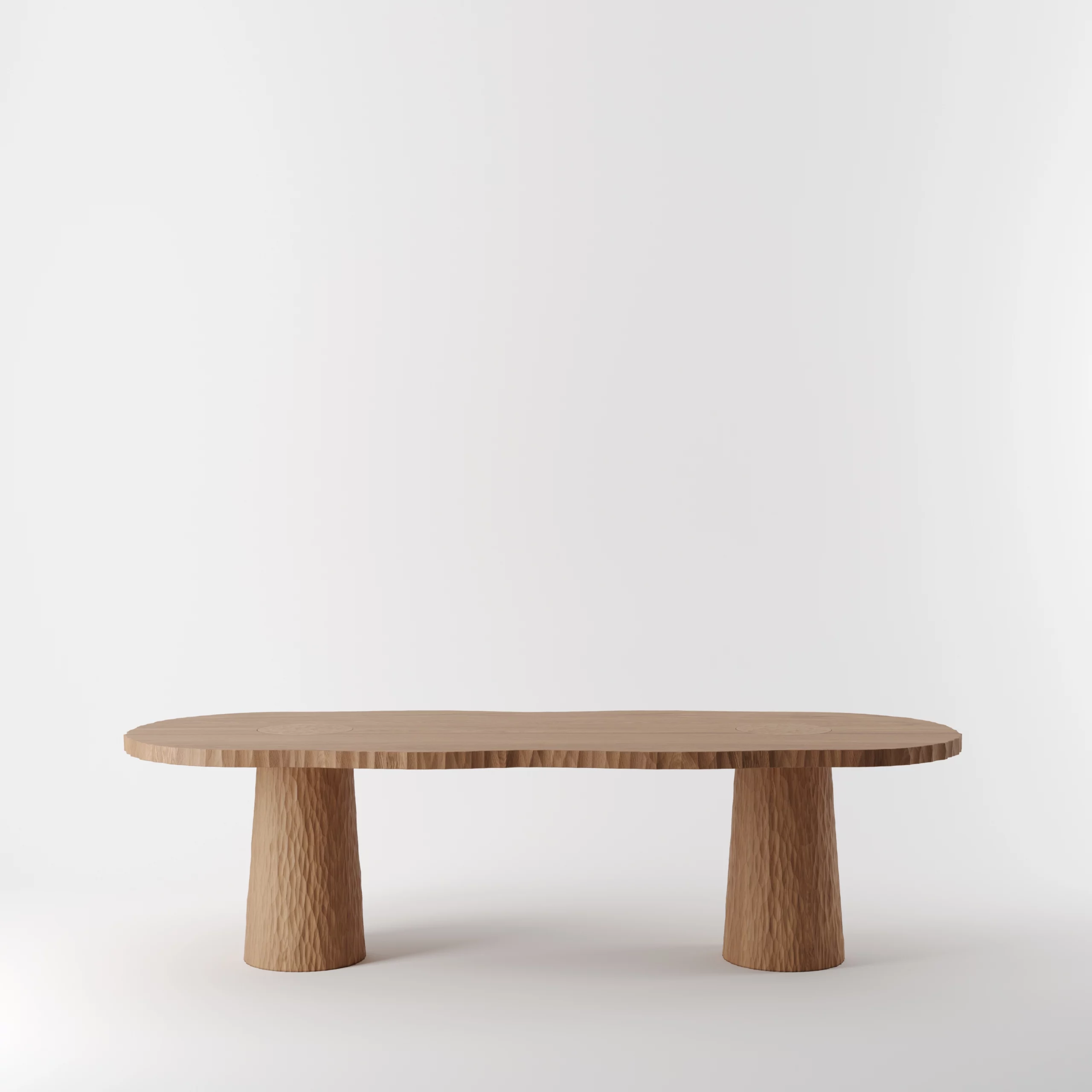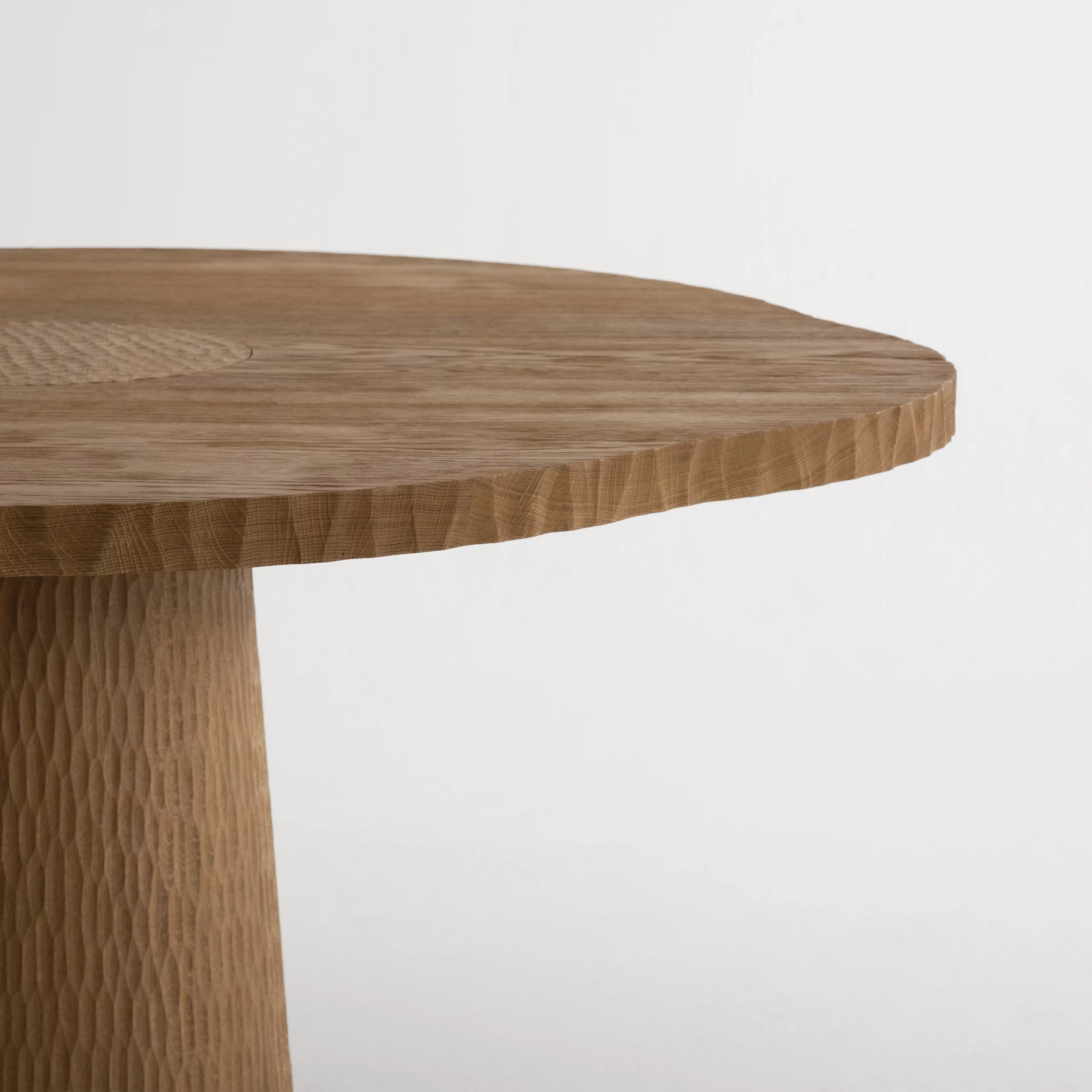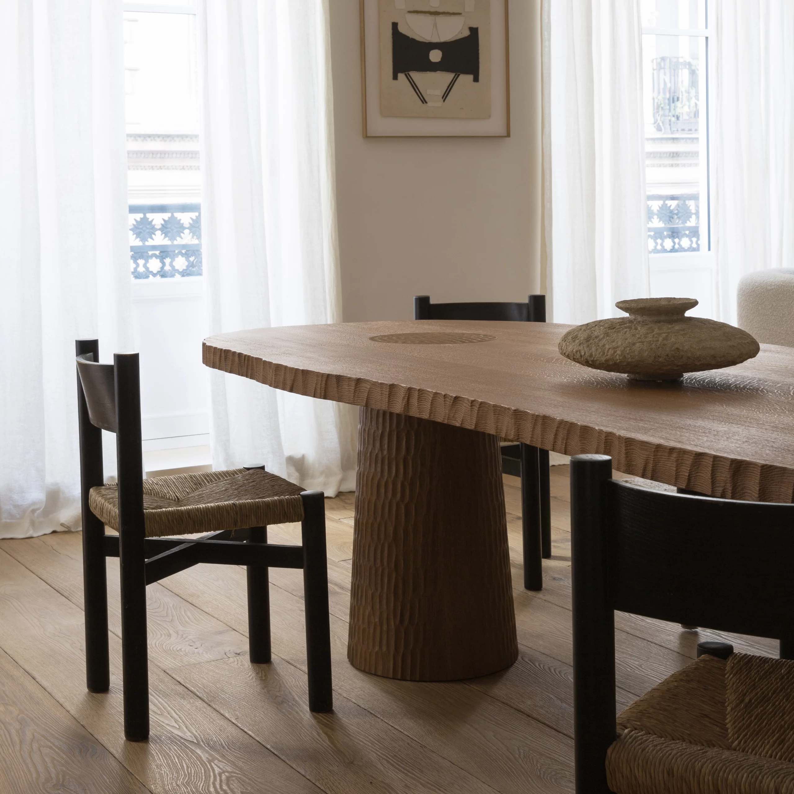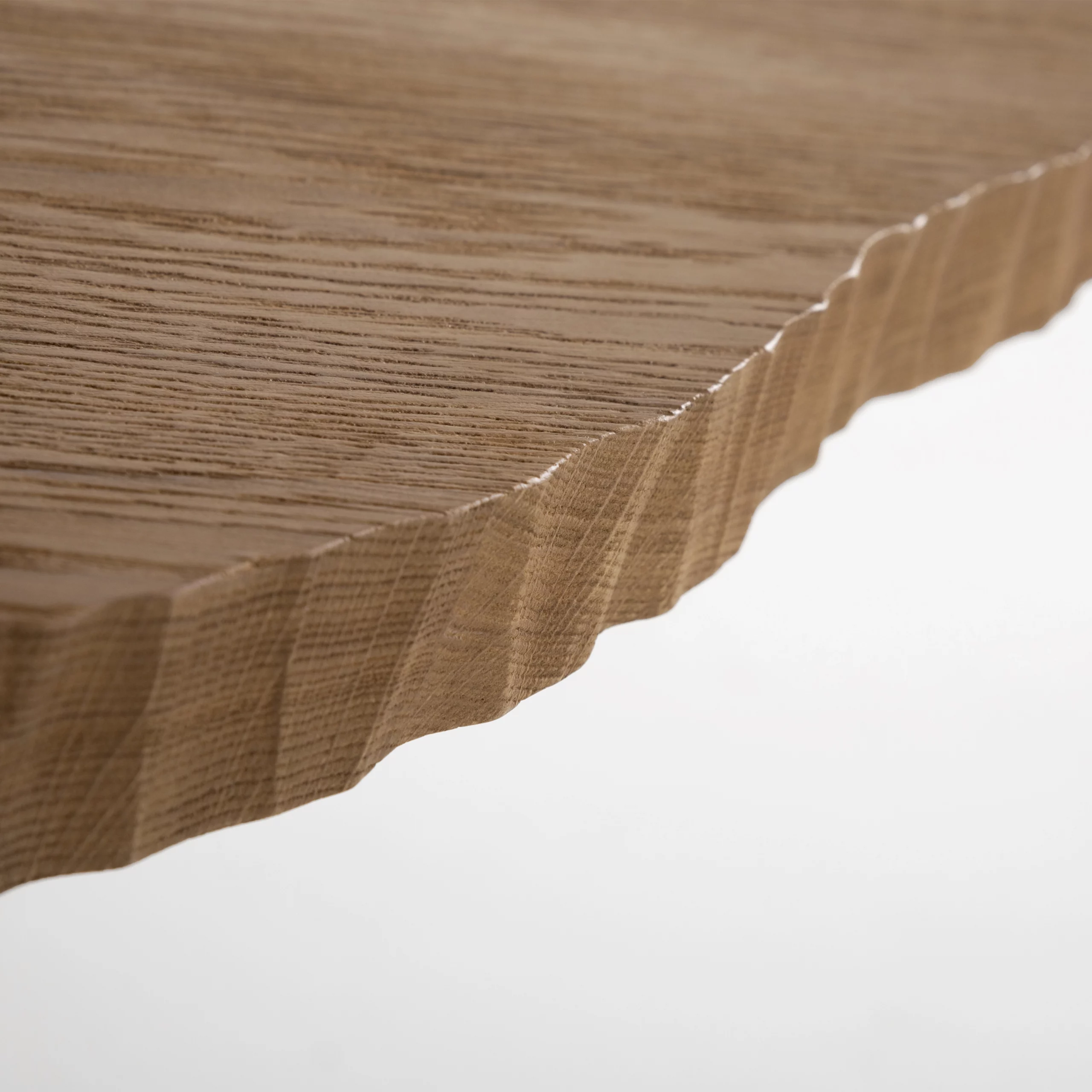 Pour les tables, le cisaillement irrégulier de la tranche du plateau évoque le flanc d’une falaise.