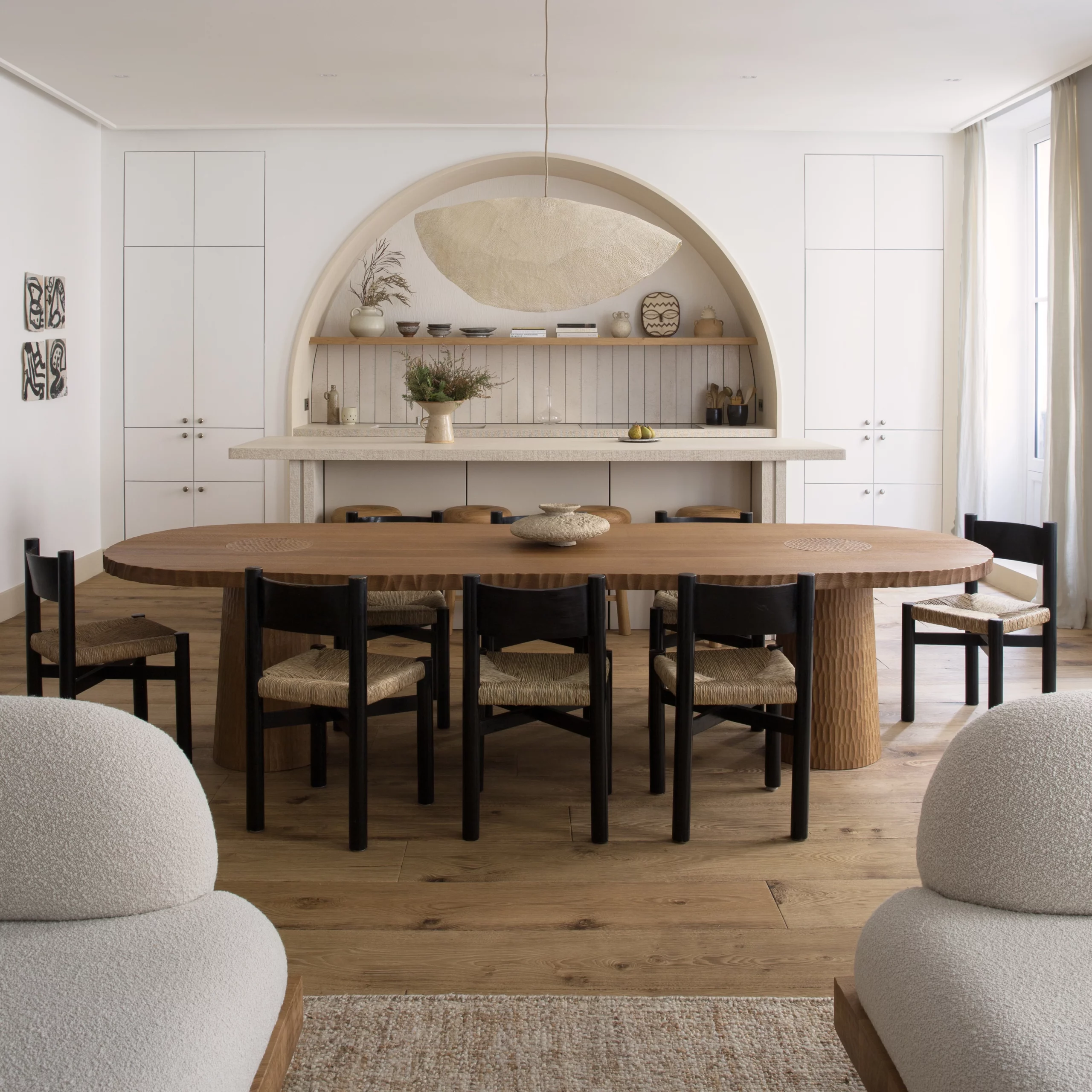 Le travail du bois gougé sculpté à la main dans la collection TIGA, met en valeur un précieux savoir faire artisanal. Ces formes aléatoires créent des vibrations à travers un jeu d’ombres et de lumières.