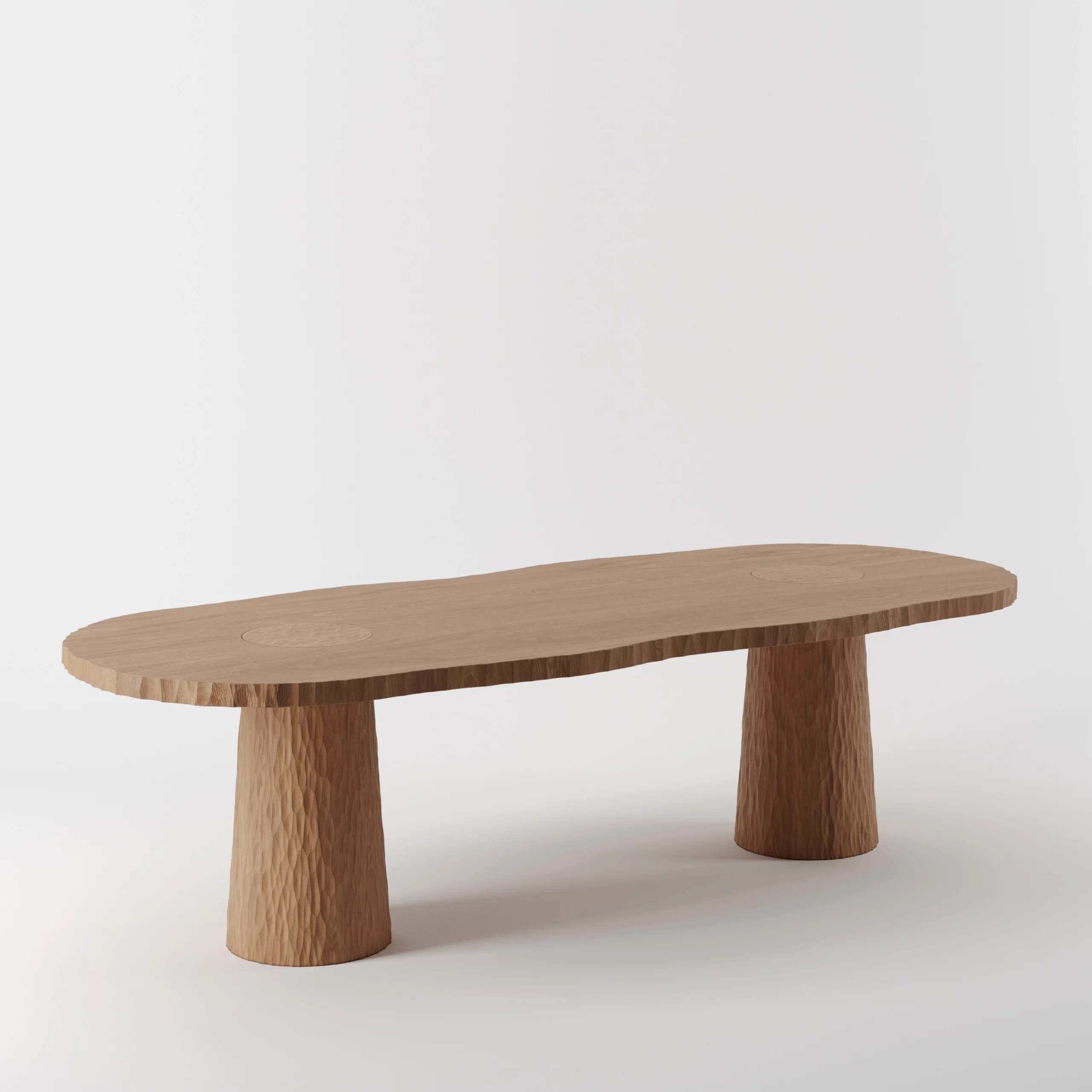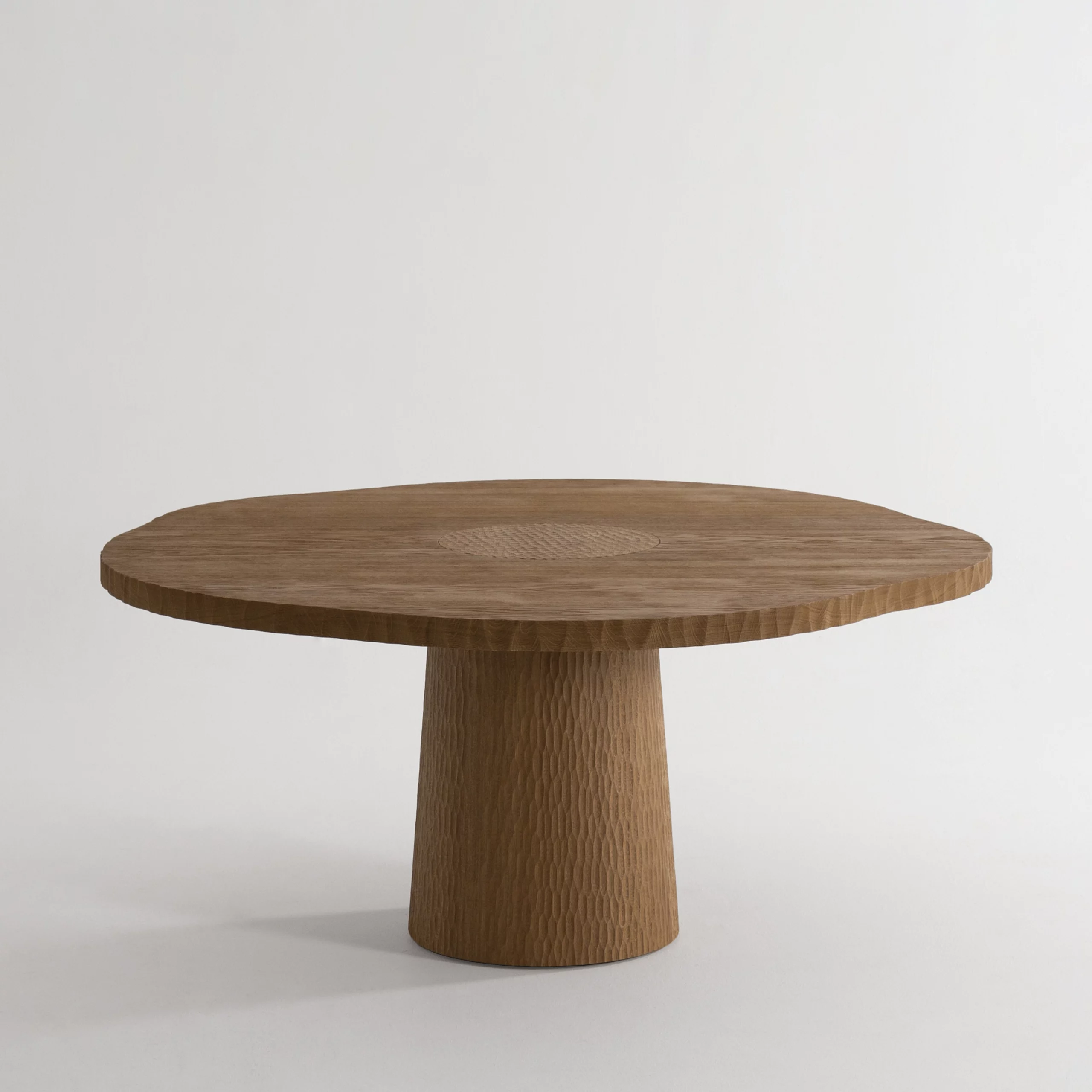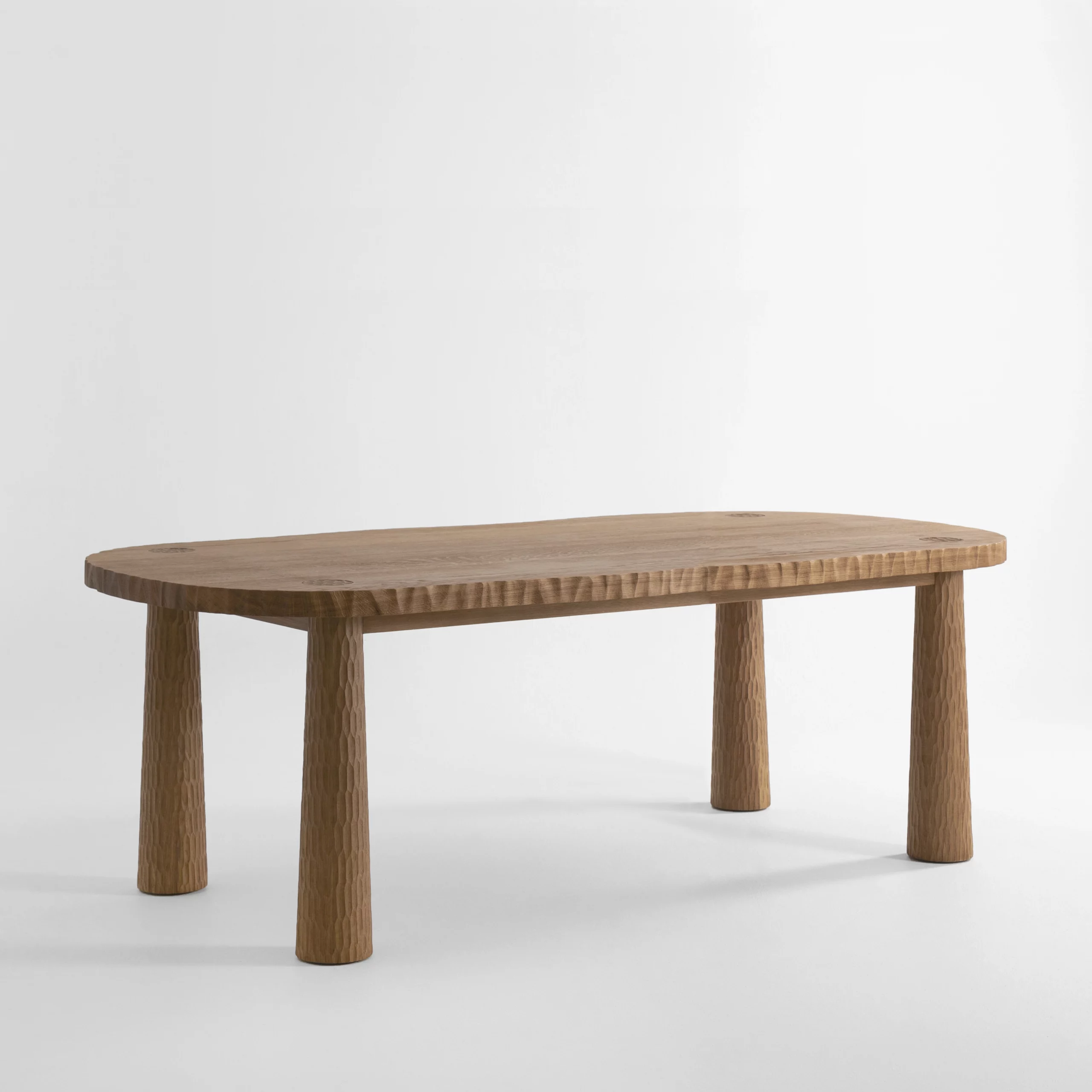 Pour les tables, le cisaillement irrégulier de la tranche du plateau évoque le flanc d’une falaise.