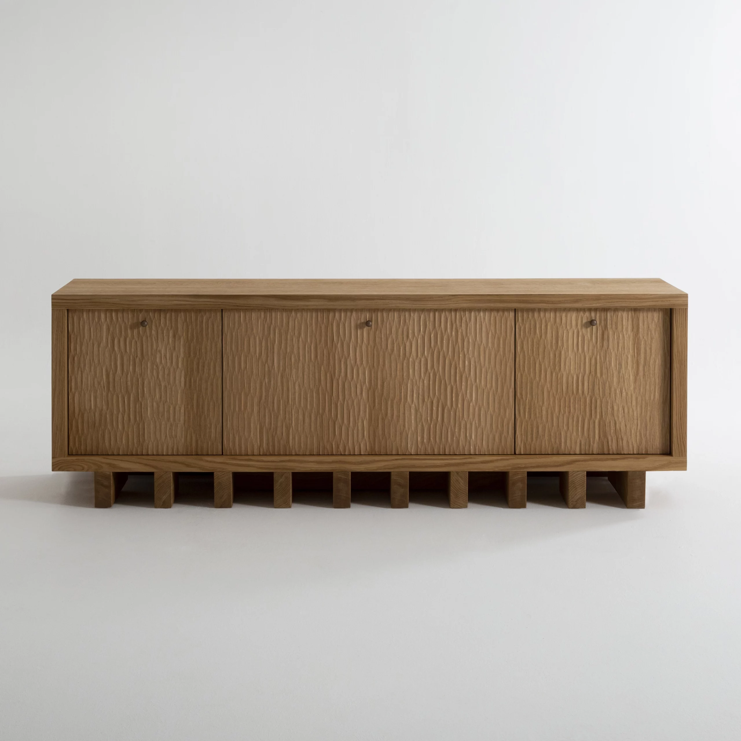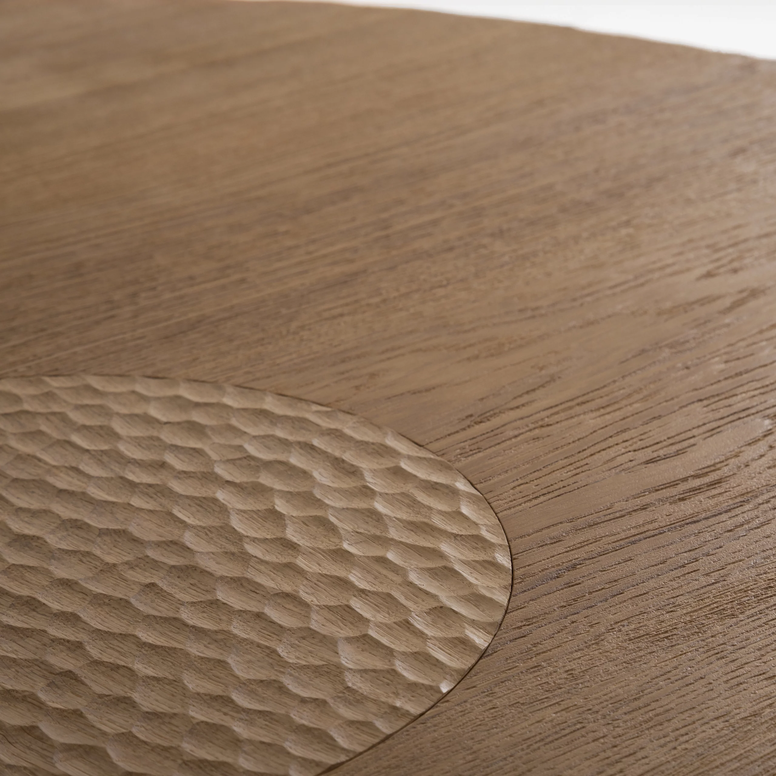 Le travail du bois gougé sculpté à la main dans la collection TIGA, met en valeur un précieux savoir faire artisanal. Ces formes aléatoires créent des vibrations à travers un jeu d’ombres et de lumières.